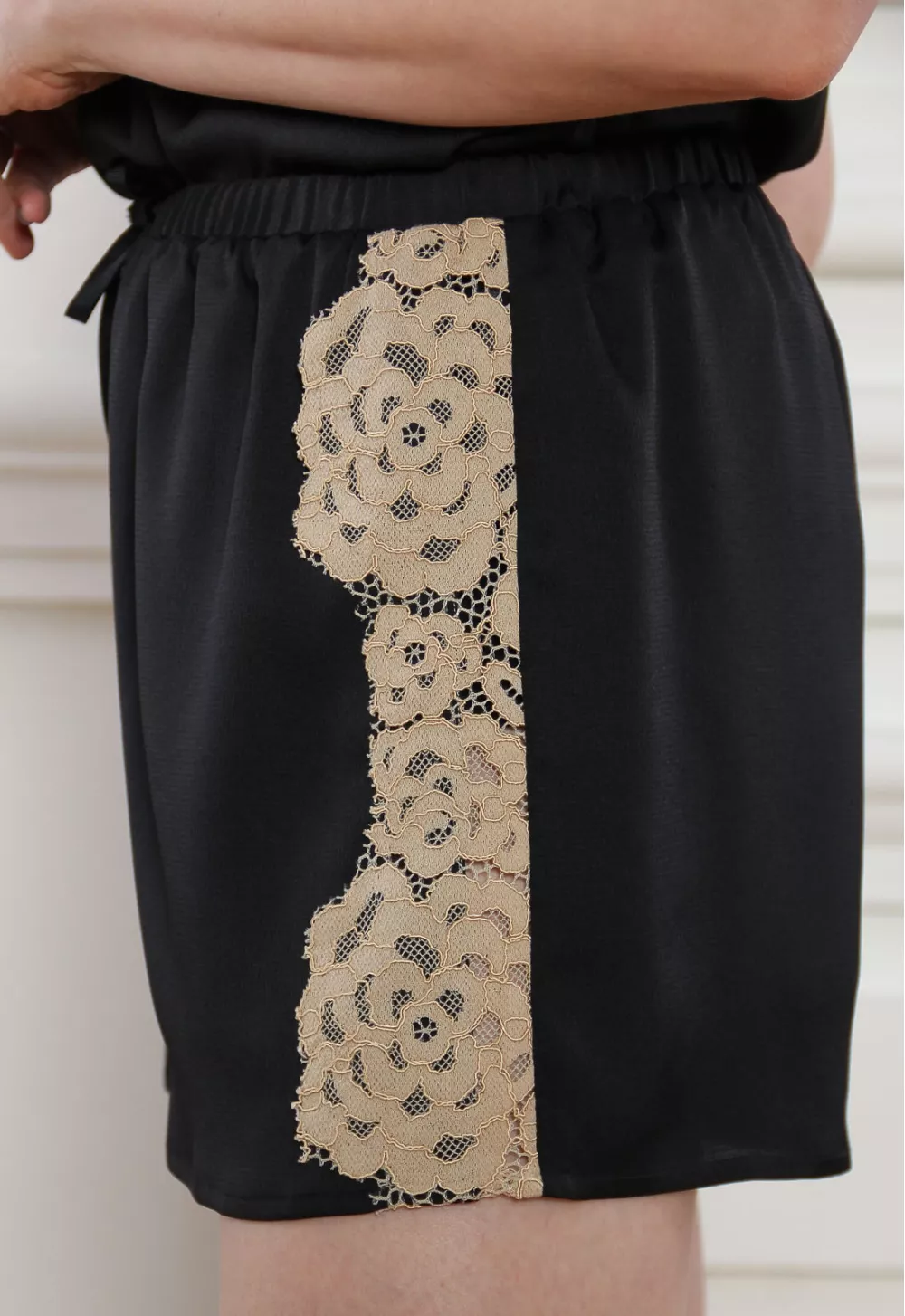 Піжамні шорти виконані з структурованого атласу на поясі з м'якої еластичної тасьми, оздоблені французьким мереживом.