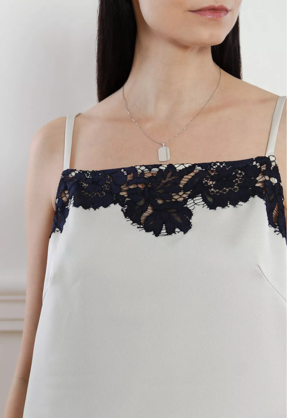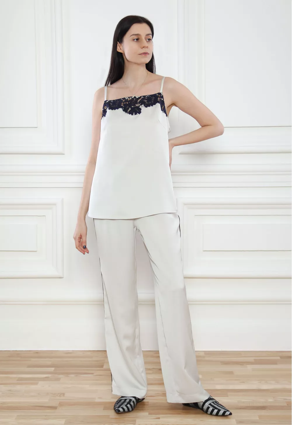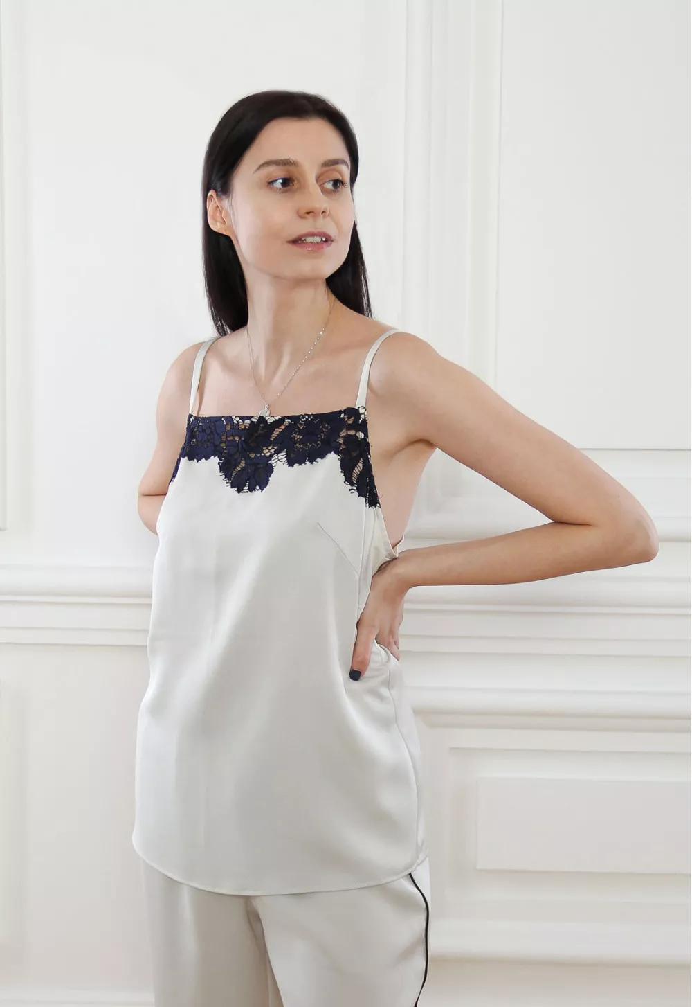 Топ на тоненьких бретельках з благородного креп атласу, озбоблена французьким мереживом. Топ можна носити як в складі піжами так і з улюбленою бавовняною футболкою, жакетом oversize або трендовим кардиганом грубої в'язки