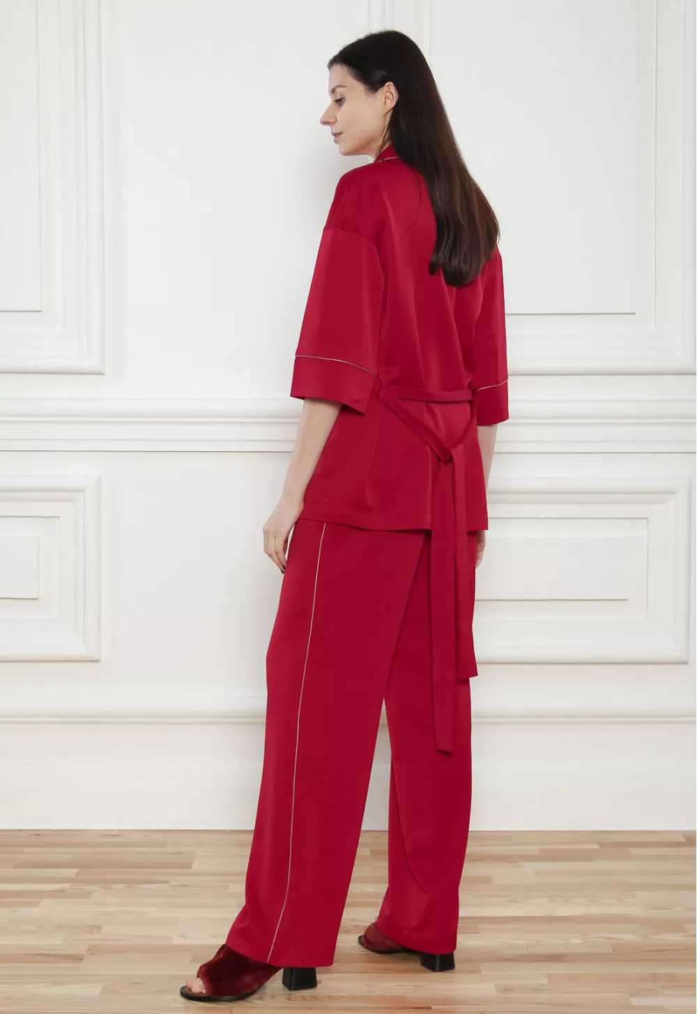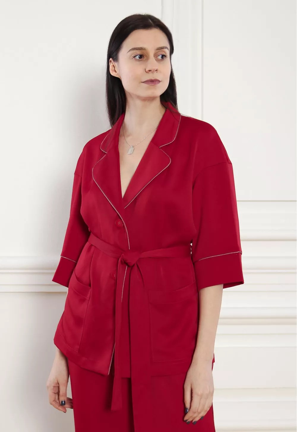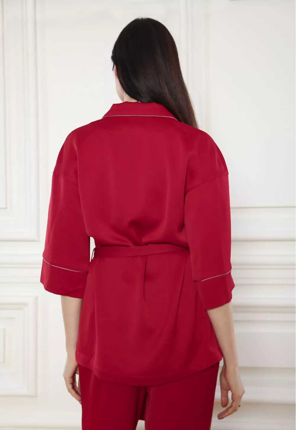Піжамна блуза виконана з благородного креп атласу із застібкою на гудзики і атласним кантом по коміру та по лінії борту. Блузу також можна носити з улюбленими джинсами або класичними брюками