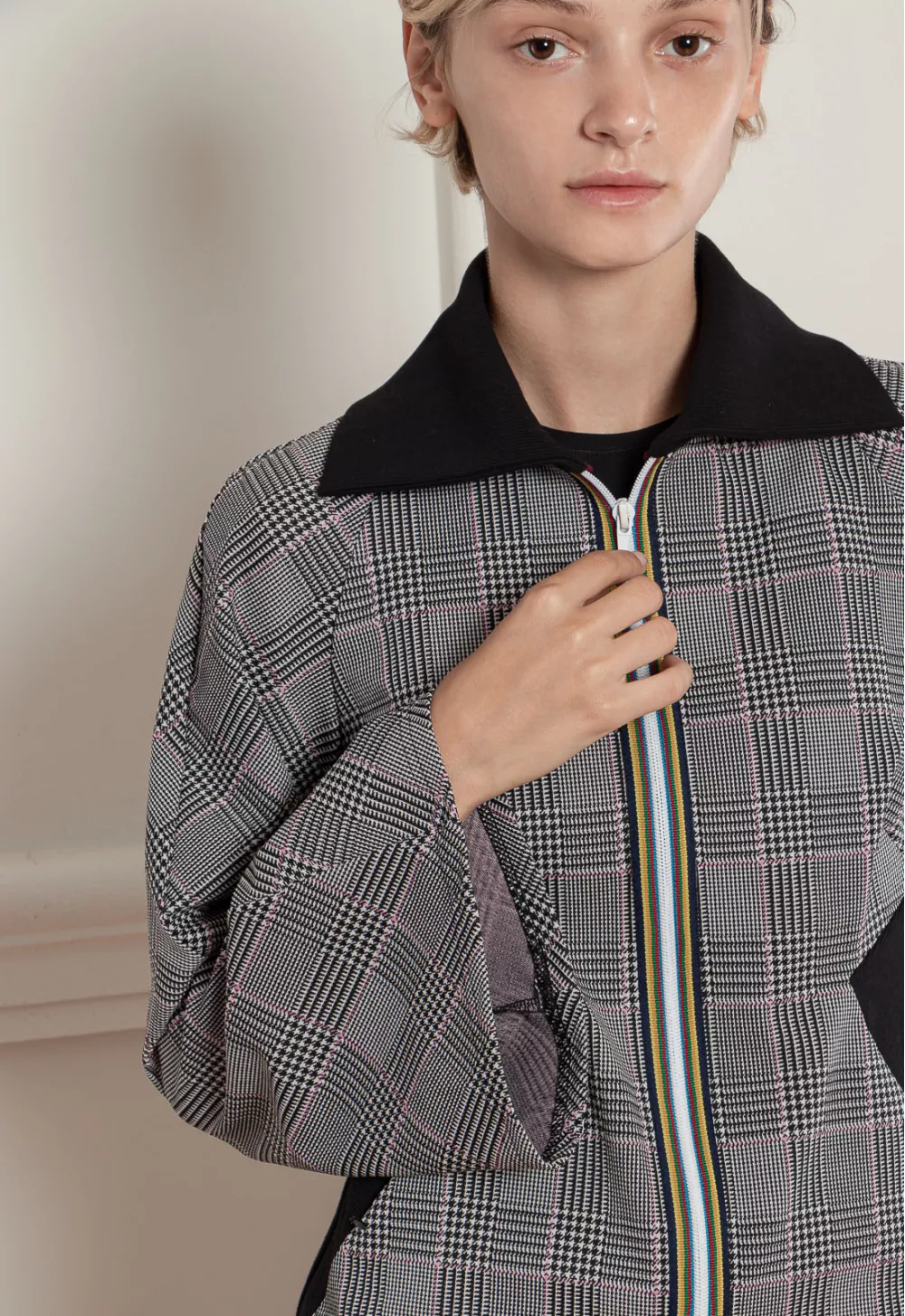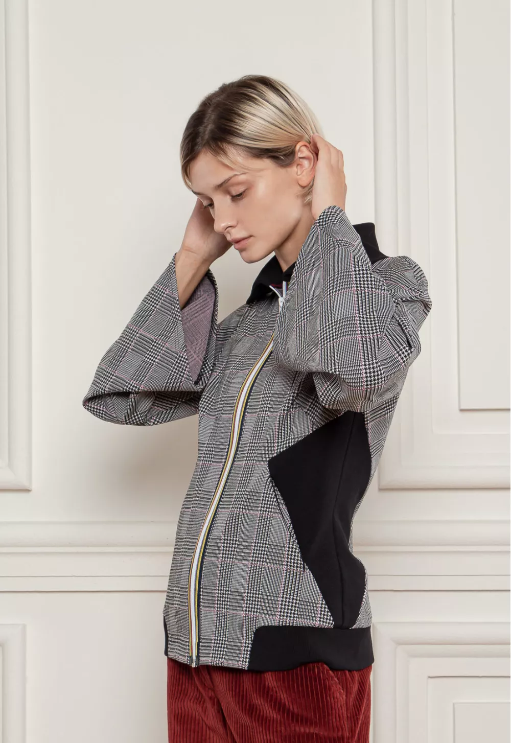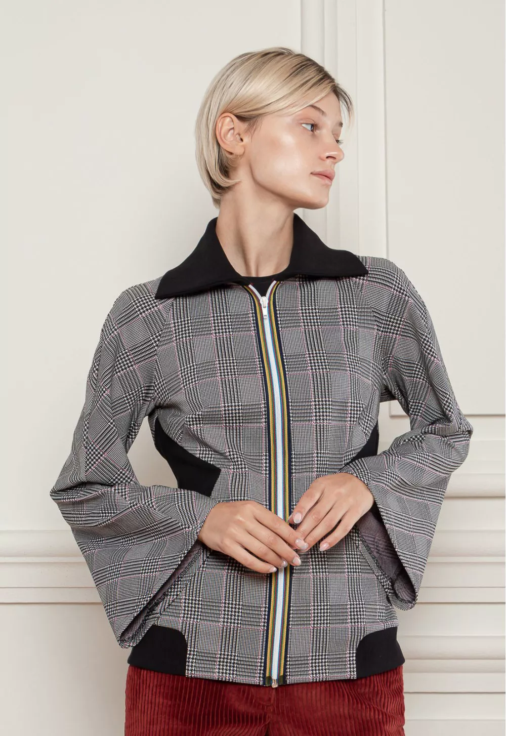 Стильна кофта в клітинку в стилі спорт-шик, з відкладеним воротом. З контрасними вставками по бокам і в низу моделі, а також з яскравою блискавкою. Для теплої осені і весни