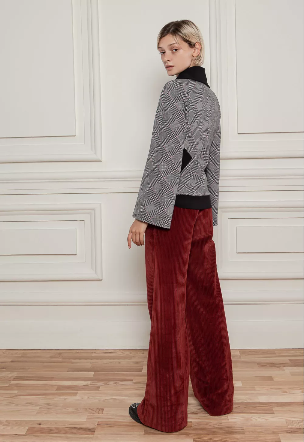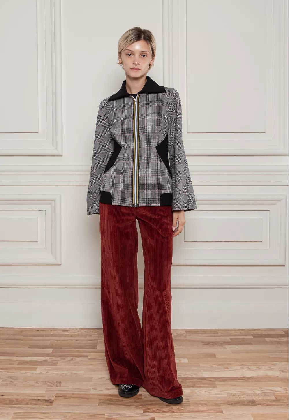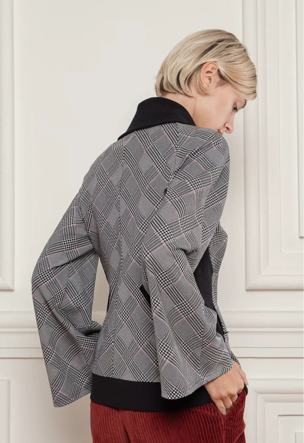 Стильна кофта в клітинку в стилі спорт-шик, з відкладеним воротом. З контрасними вставками по бокам і в низу моделі, а також з яскравою блискавкою. Для теплої осені і весни
