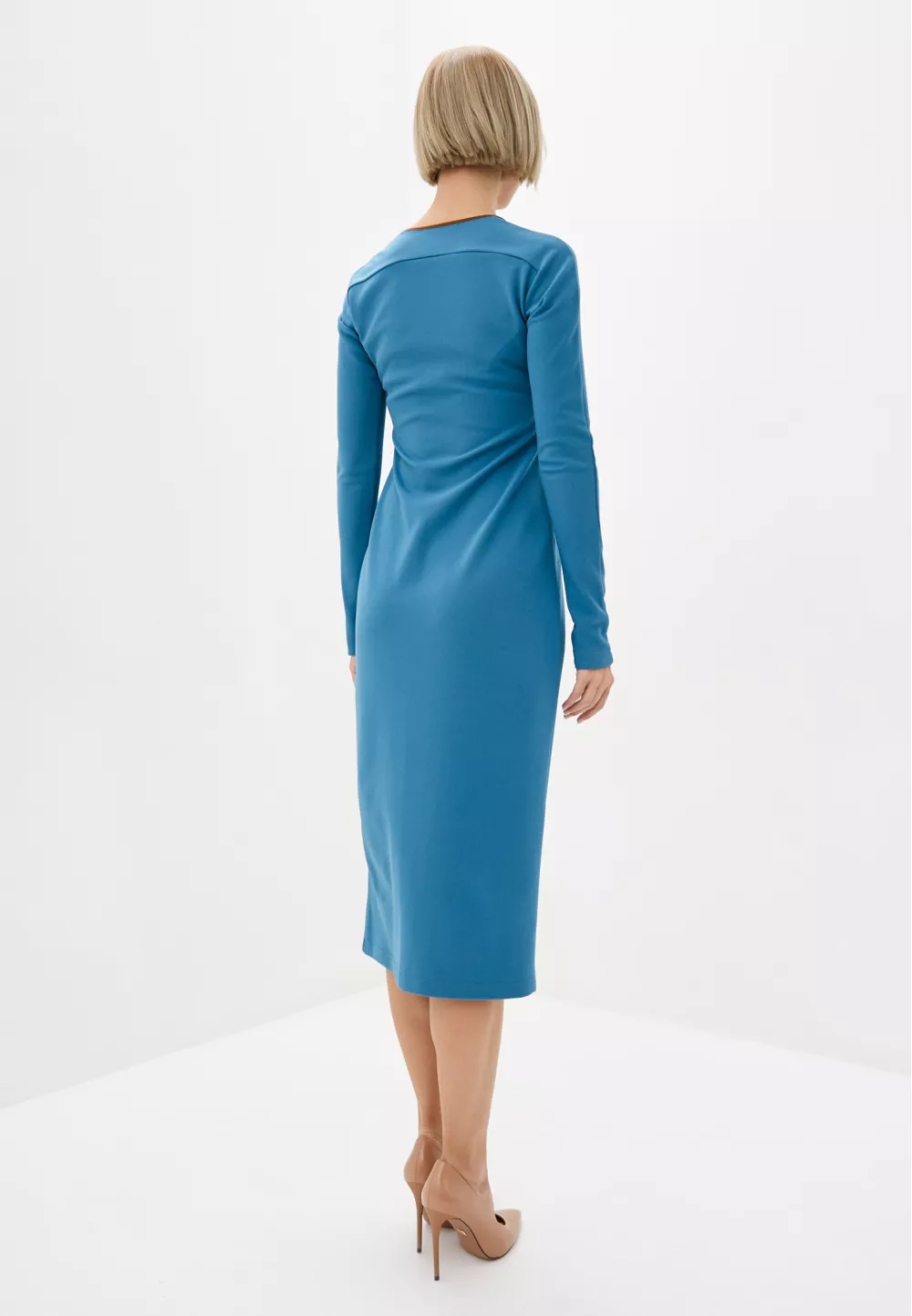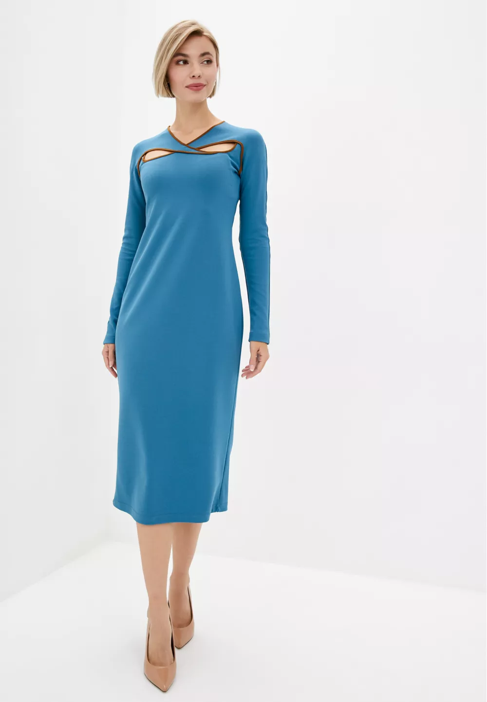 Приталена трикотажна сукня середньої довжини. Біля лінії горловини - декоративні вирізи.