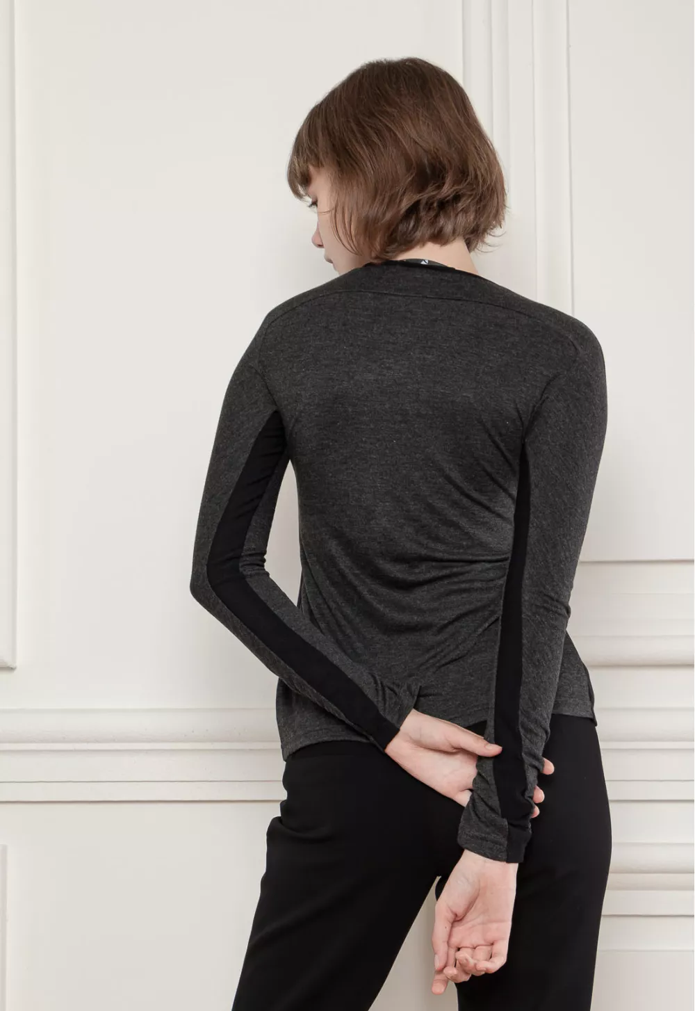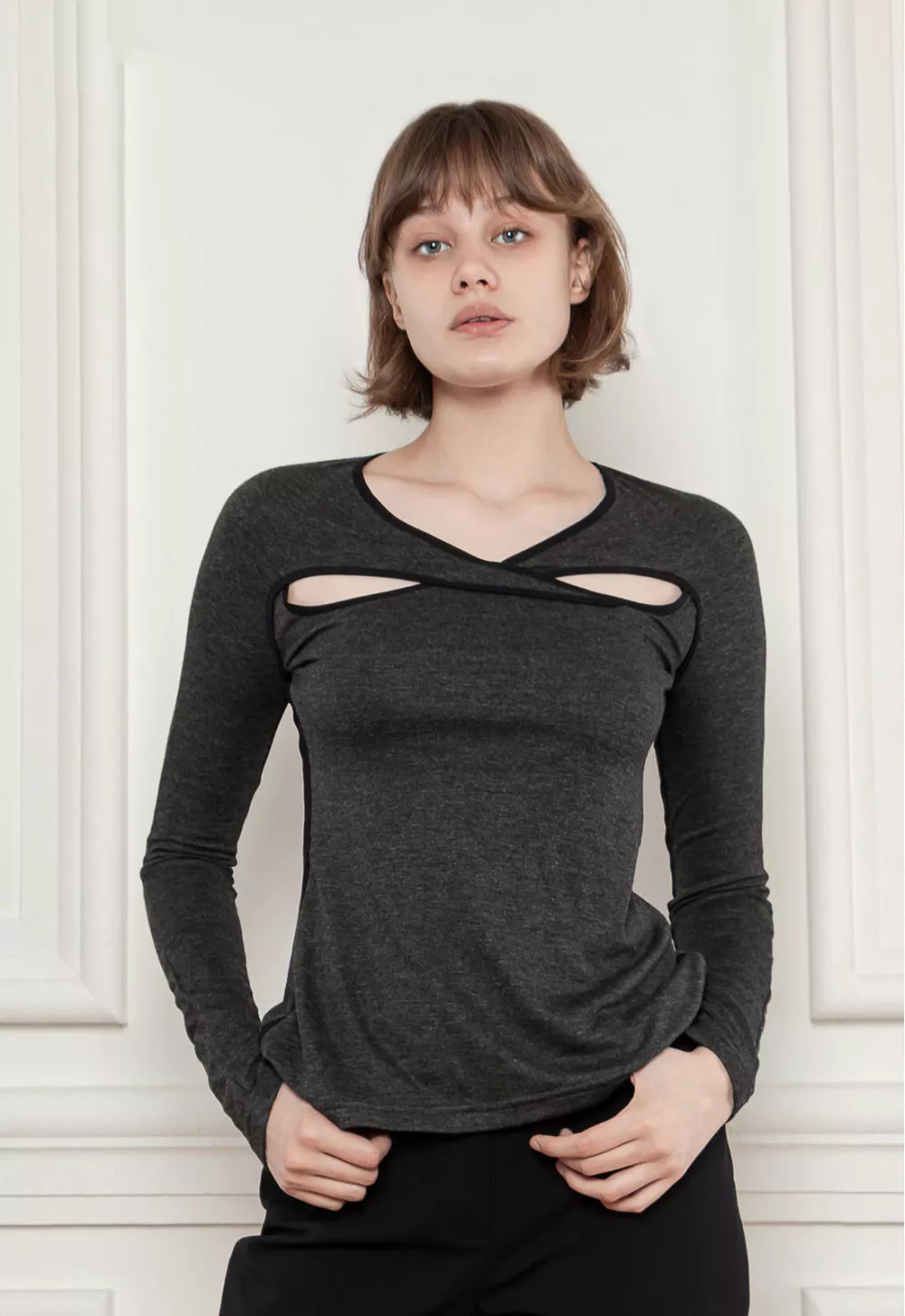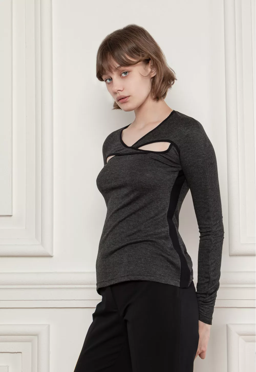 Трикотажний топ з декоративними вирізами. Крій приталений, по рукавно-боковому шву вставка із контрасної тканини. З ідеальною посадкою і правильною довжиною.