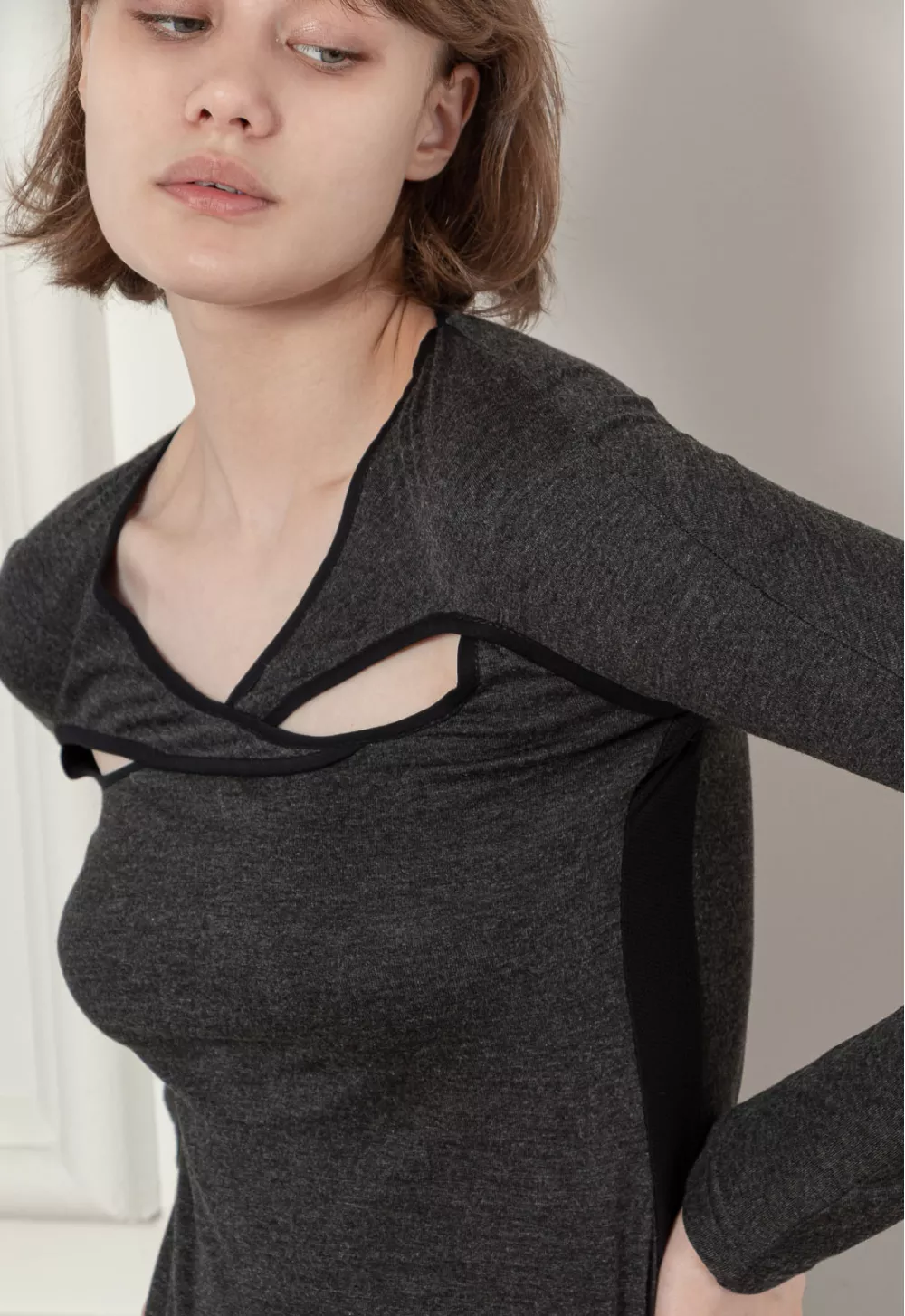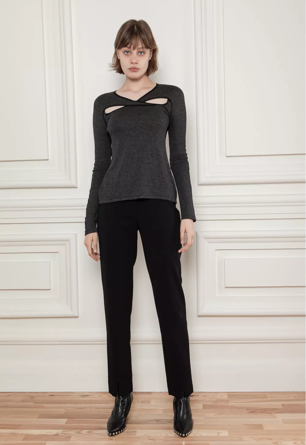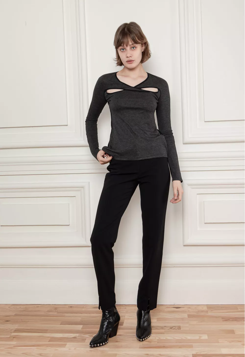 Трикотажний топ з декоративними вирізами. Крій приталений, по рукавно-боковому шву вставка із контрасної тканини. З ідеальною посадкою і правильною довжиною.