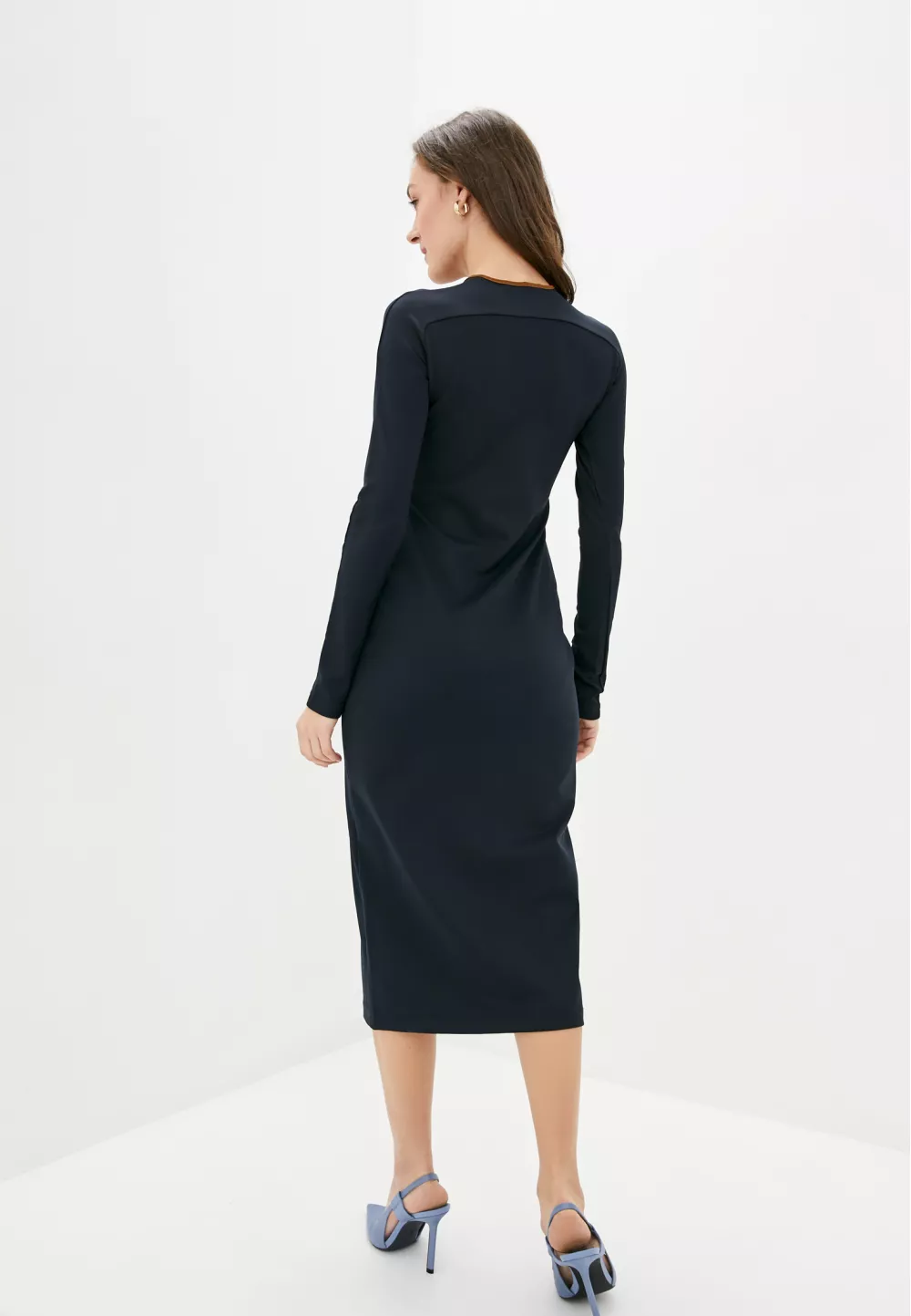 Приталена трикотажна сукня середньої довжини. Біля лінії горловини - декоративні вирізи.