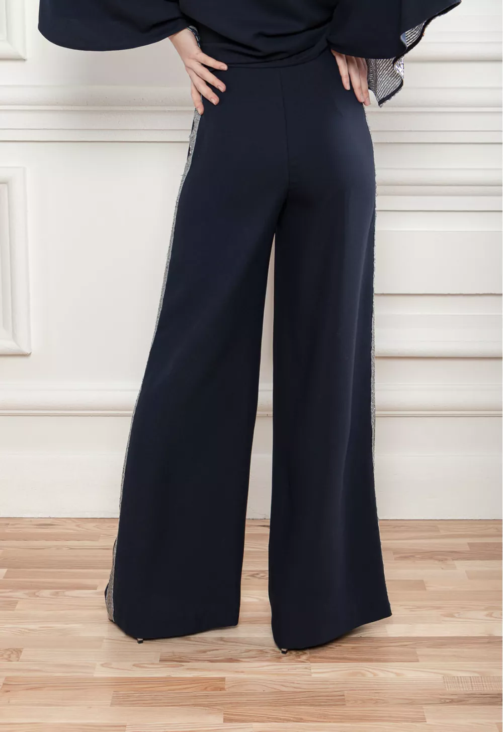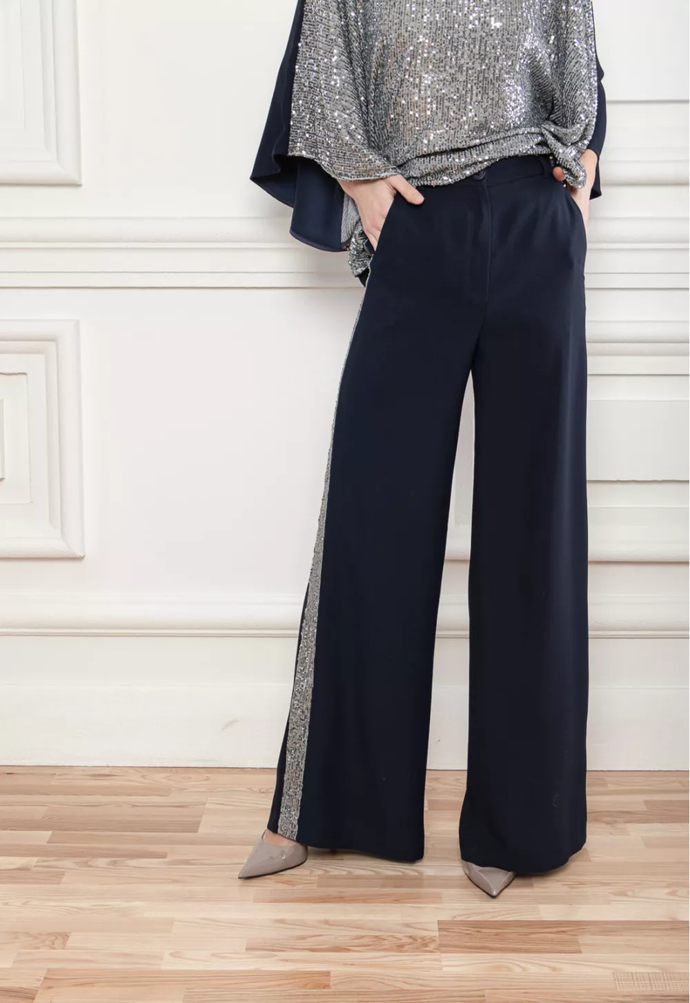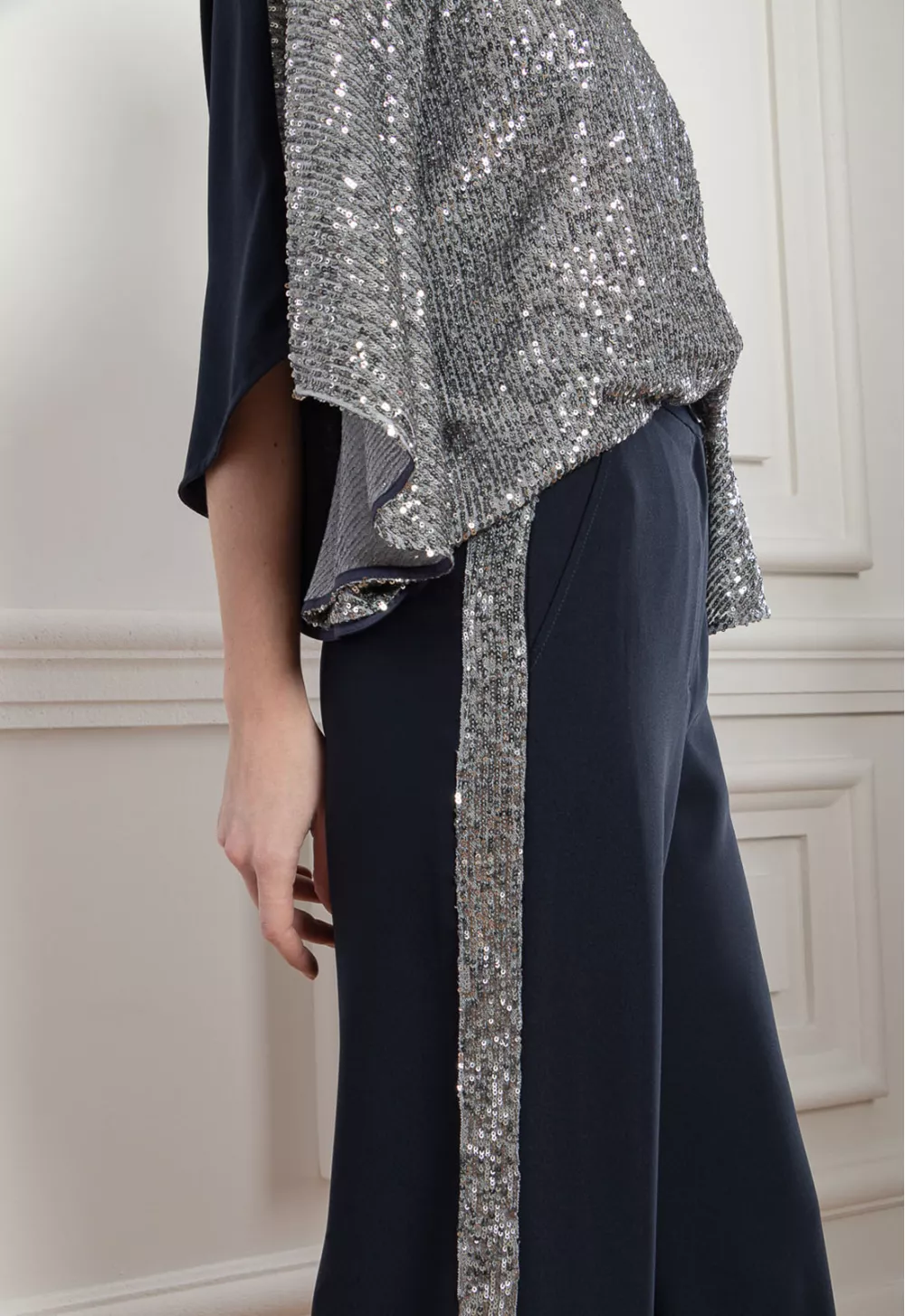 Широкие брюки с лампасами из пайета из струящегося креп атласа. Посадка - на талии