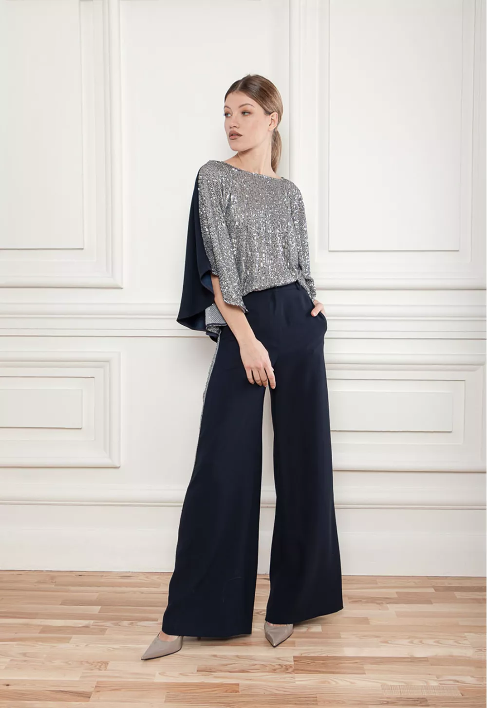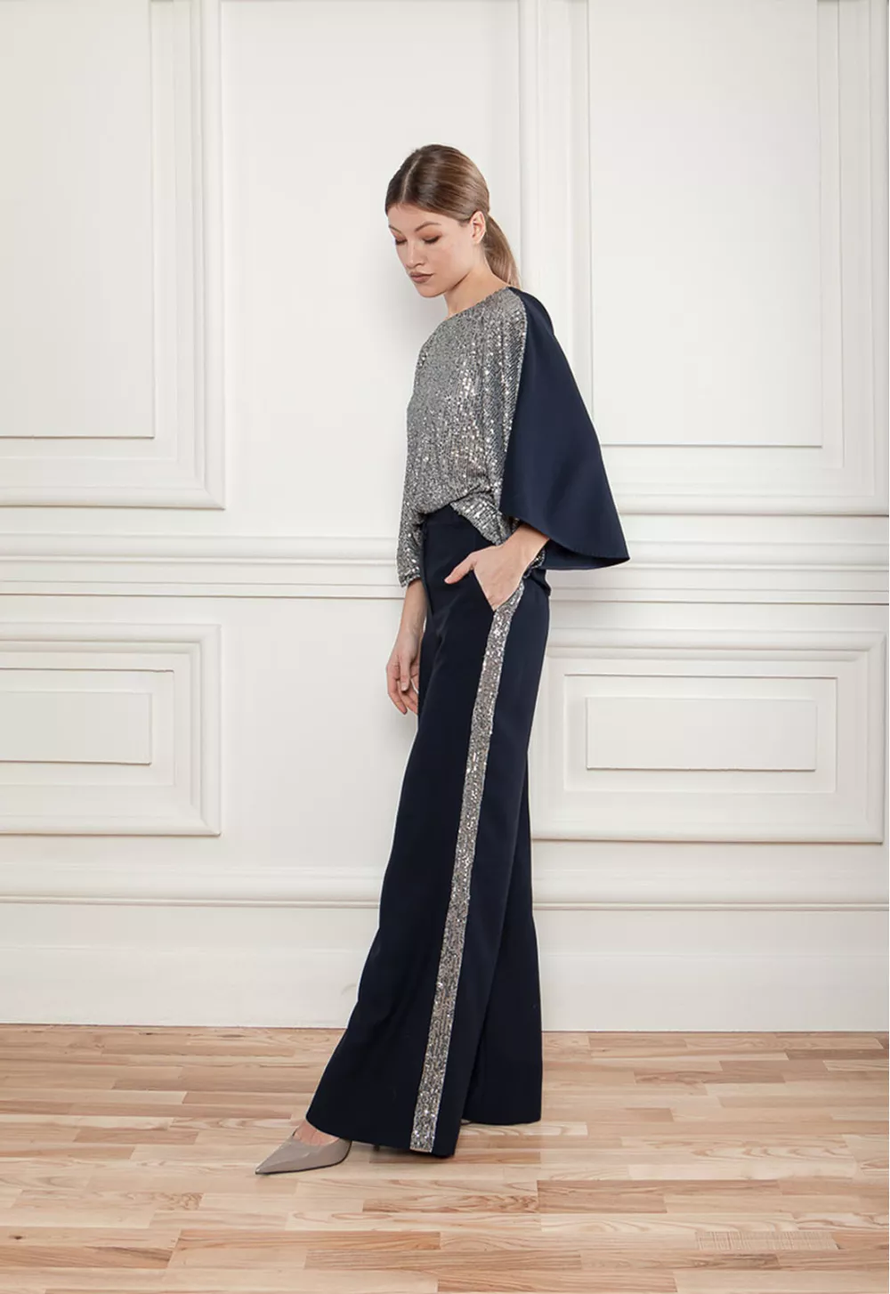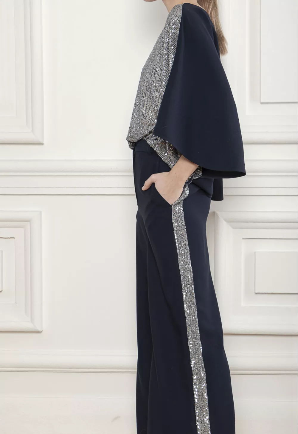 Широкие брюки с лампасами из пайета из струящегося креп атласа. Посадка - на талии