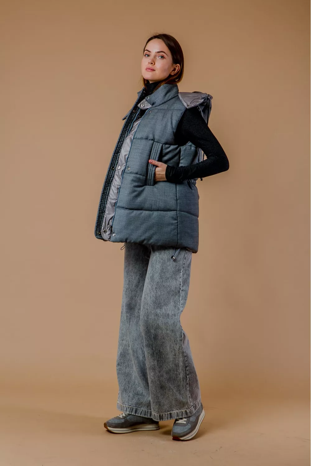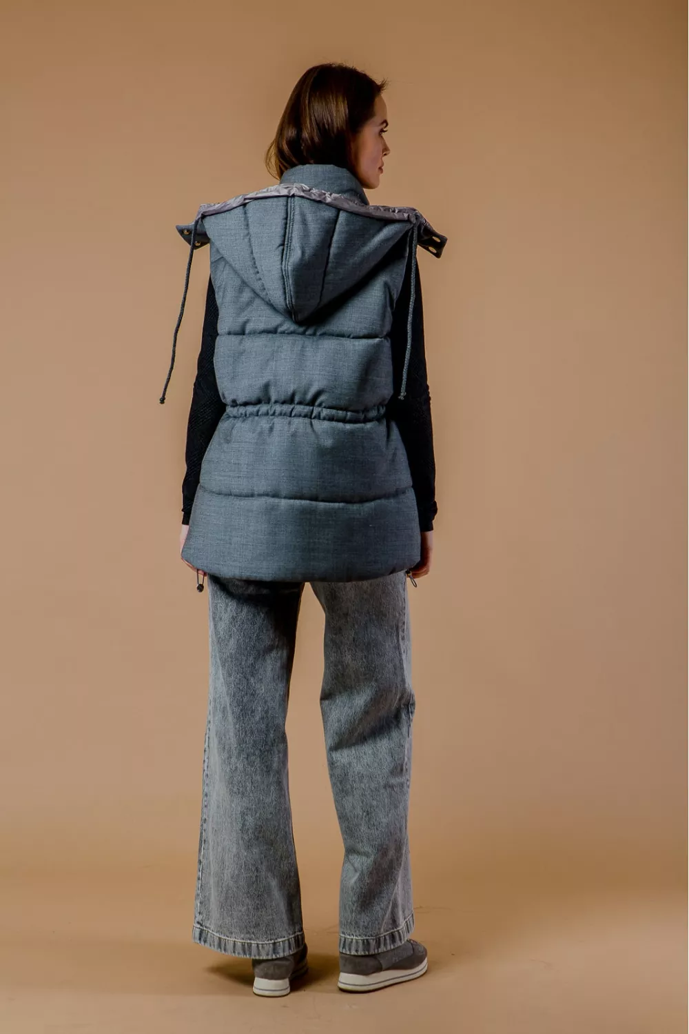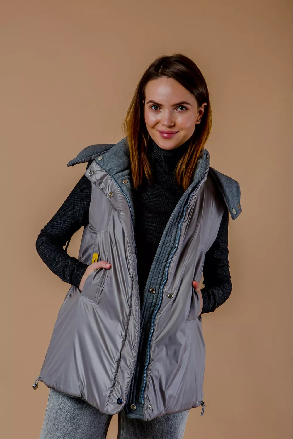 Двусторонній стьобаний жилет з капюшоном. Застібка - на блискавку і кнопки. кишені - "листочки". По талії - куліска з резинкою, для регулювання об'єму