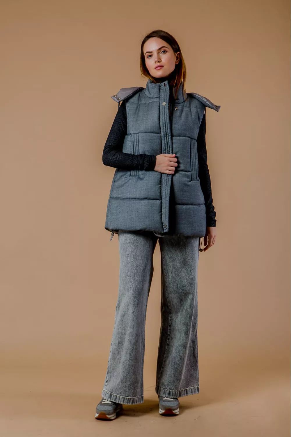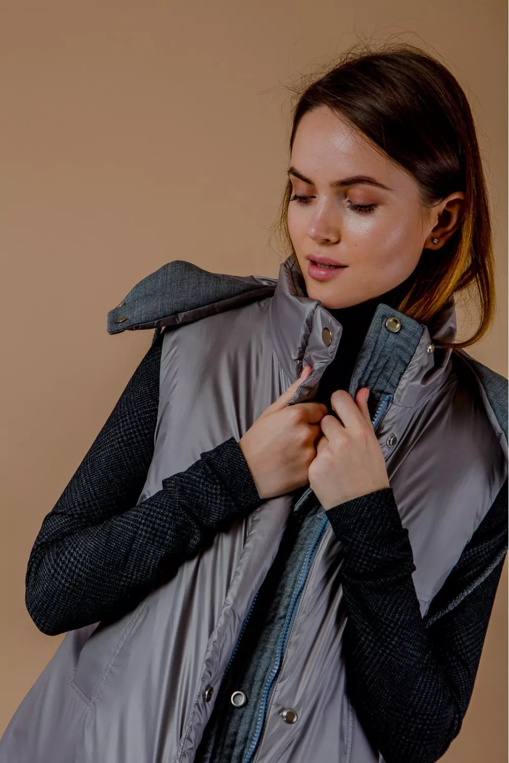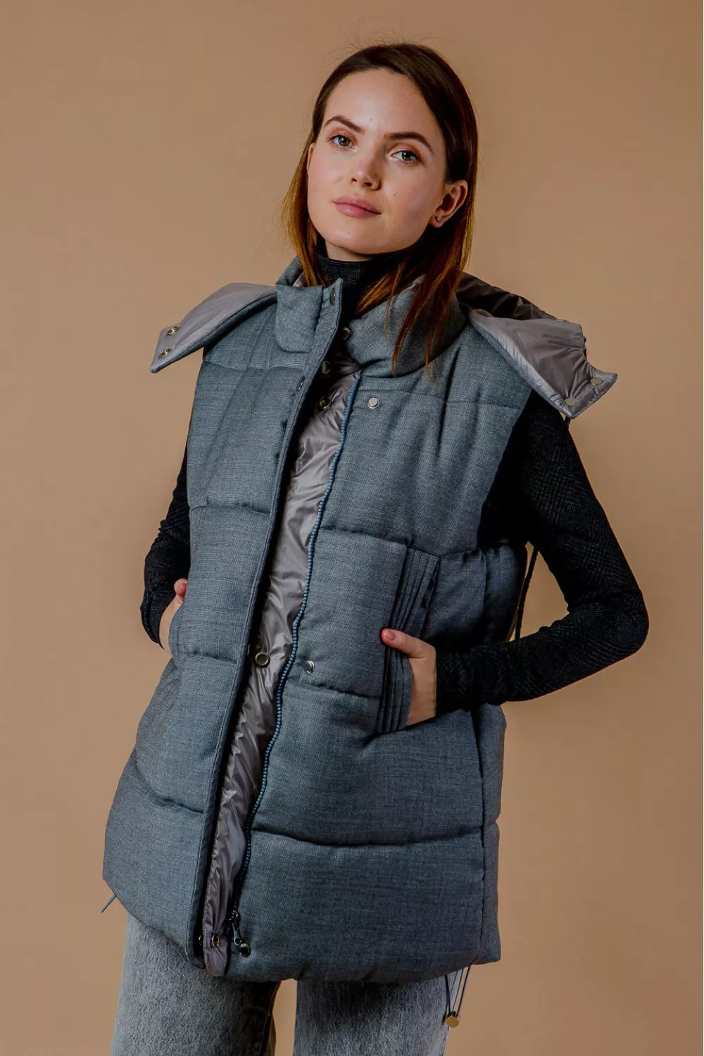 Двусторонній стьобаний жилет з капюшоном. Застібка - на блискавку і кнопки. кишені - "листочки". По талії - куліска з резинкою, для регулювання об'єму