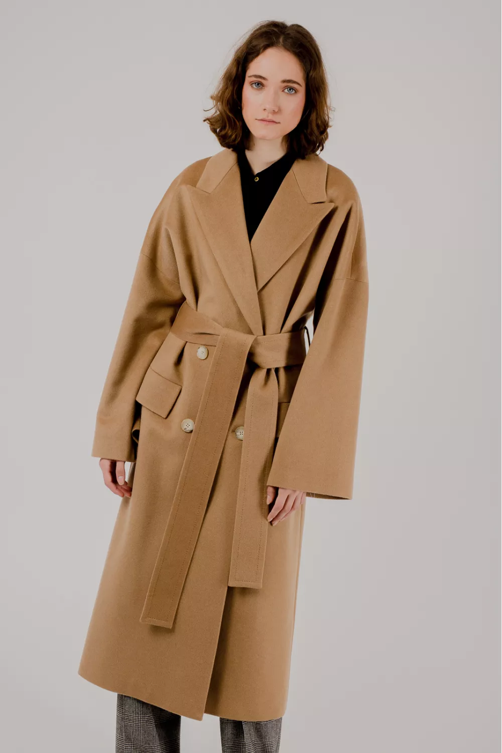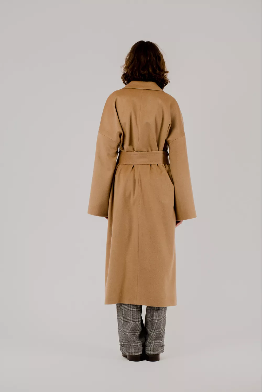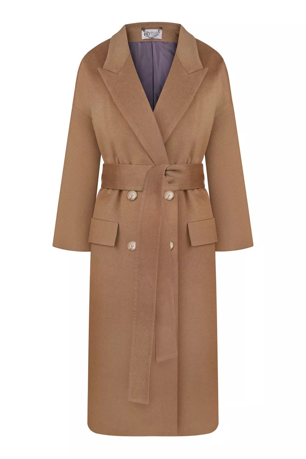 Long double-breasted coat with a classic cut and an English collar. Clasp - on buttons. Dropped sleeves, patch pockets. The waist can be adjusted with a belt. On the belt decorative stitching imitating hand stitch