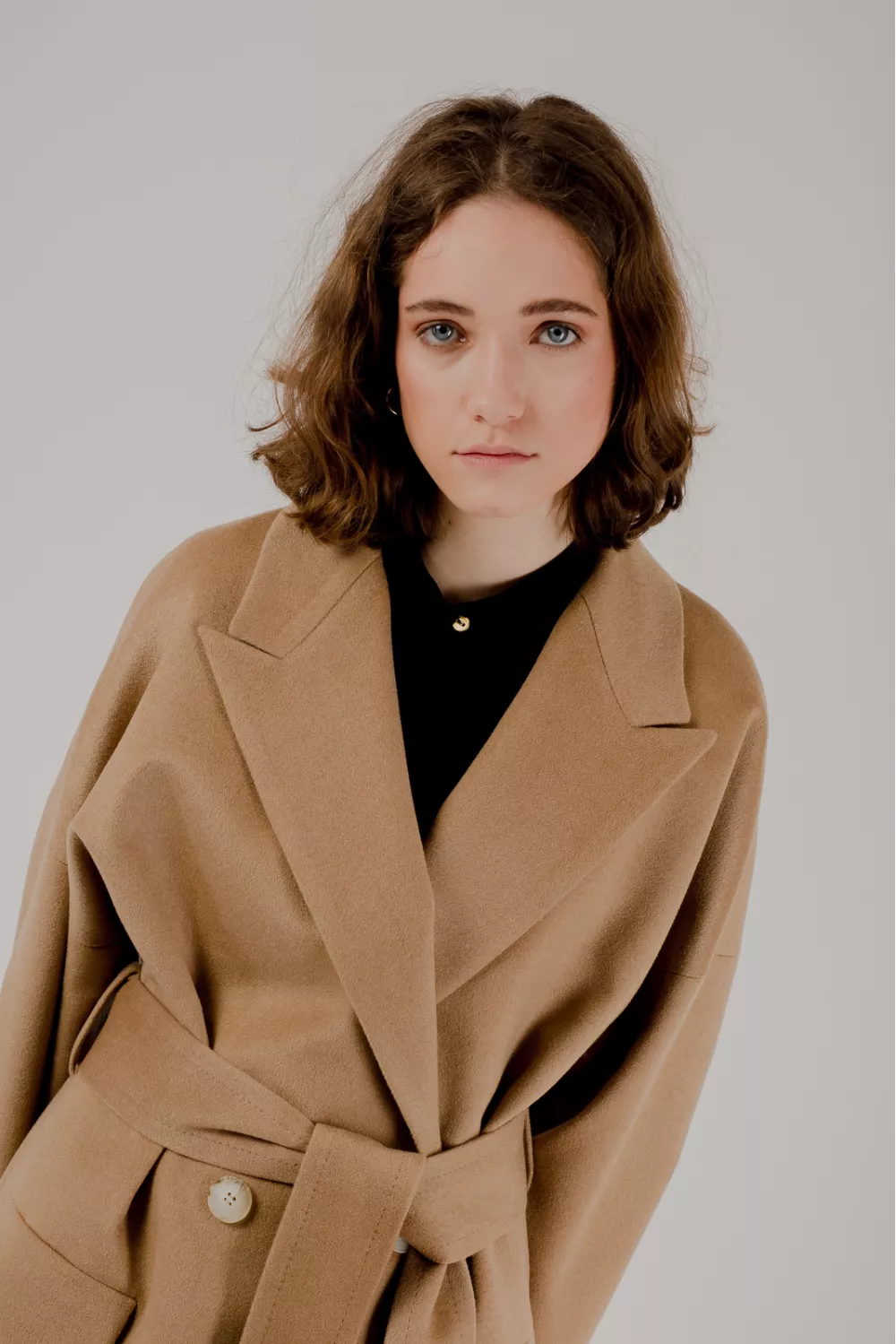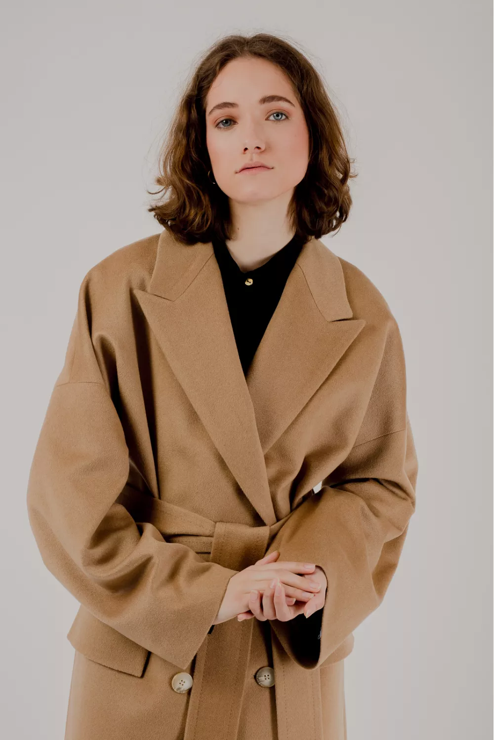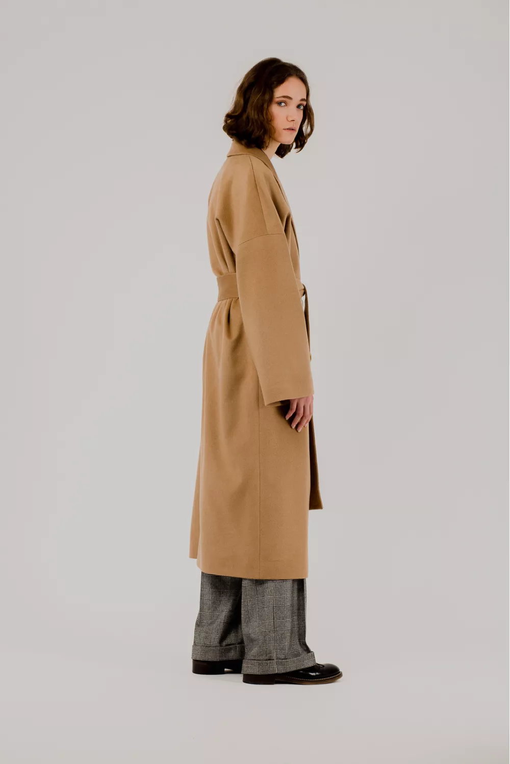 Long double-breasted coat with a classic cut and an English collar. Clasp - on buttons. Dropped sleeves, patch pockets. The waist can be adjusted with a belt. On the belt decorative stitching imitating hand stitch