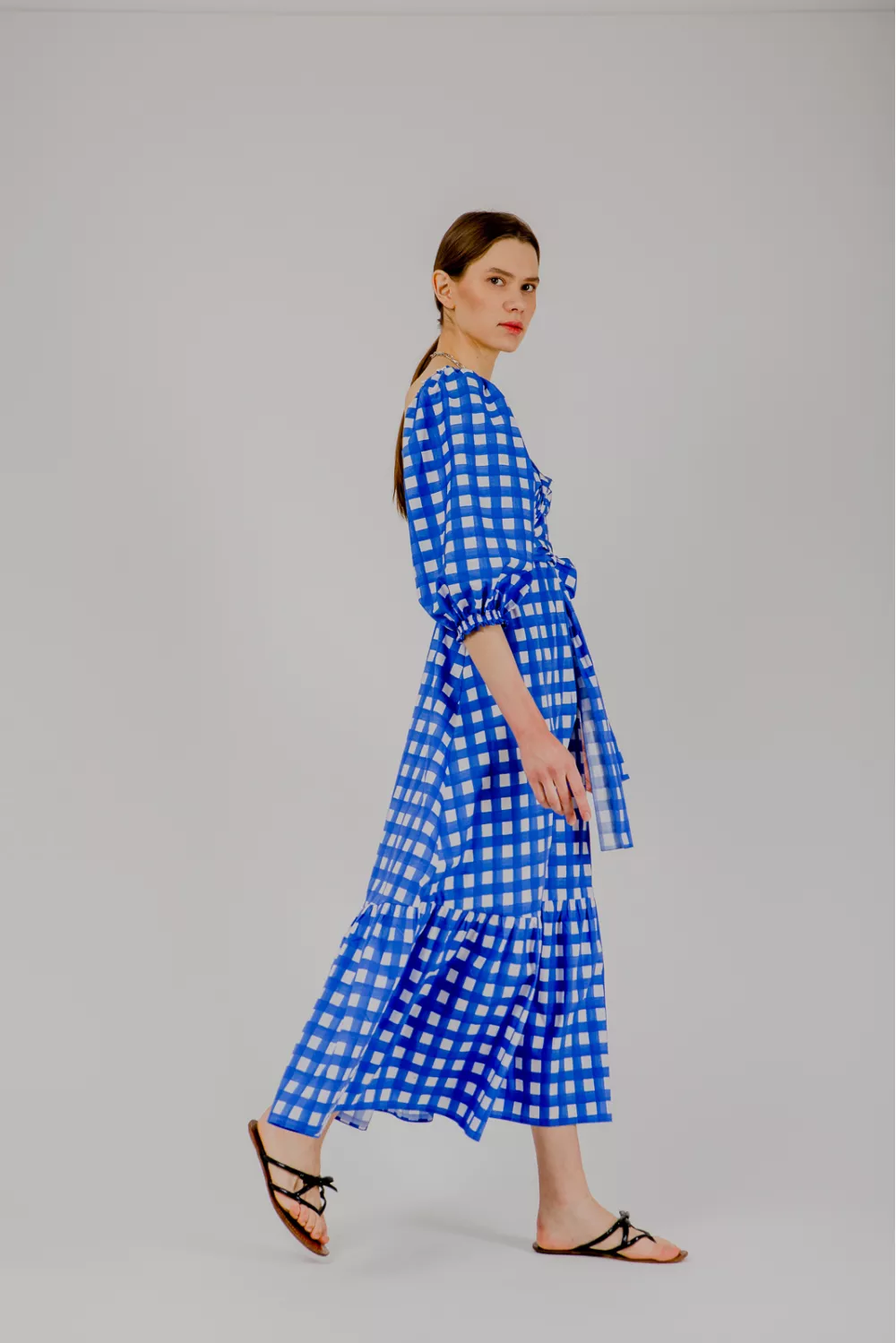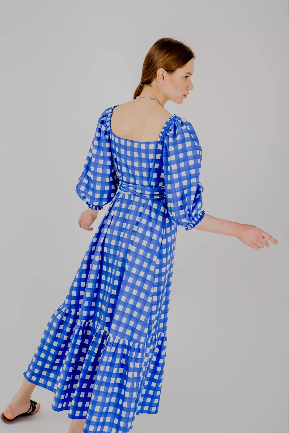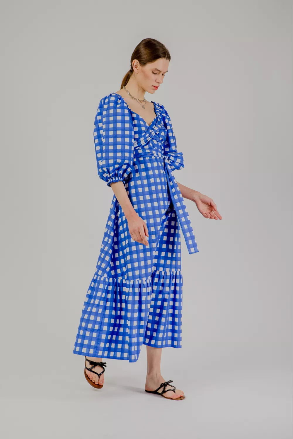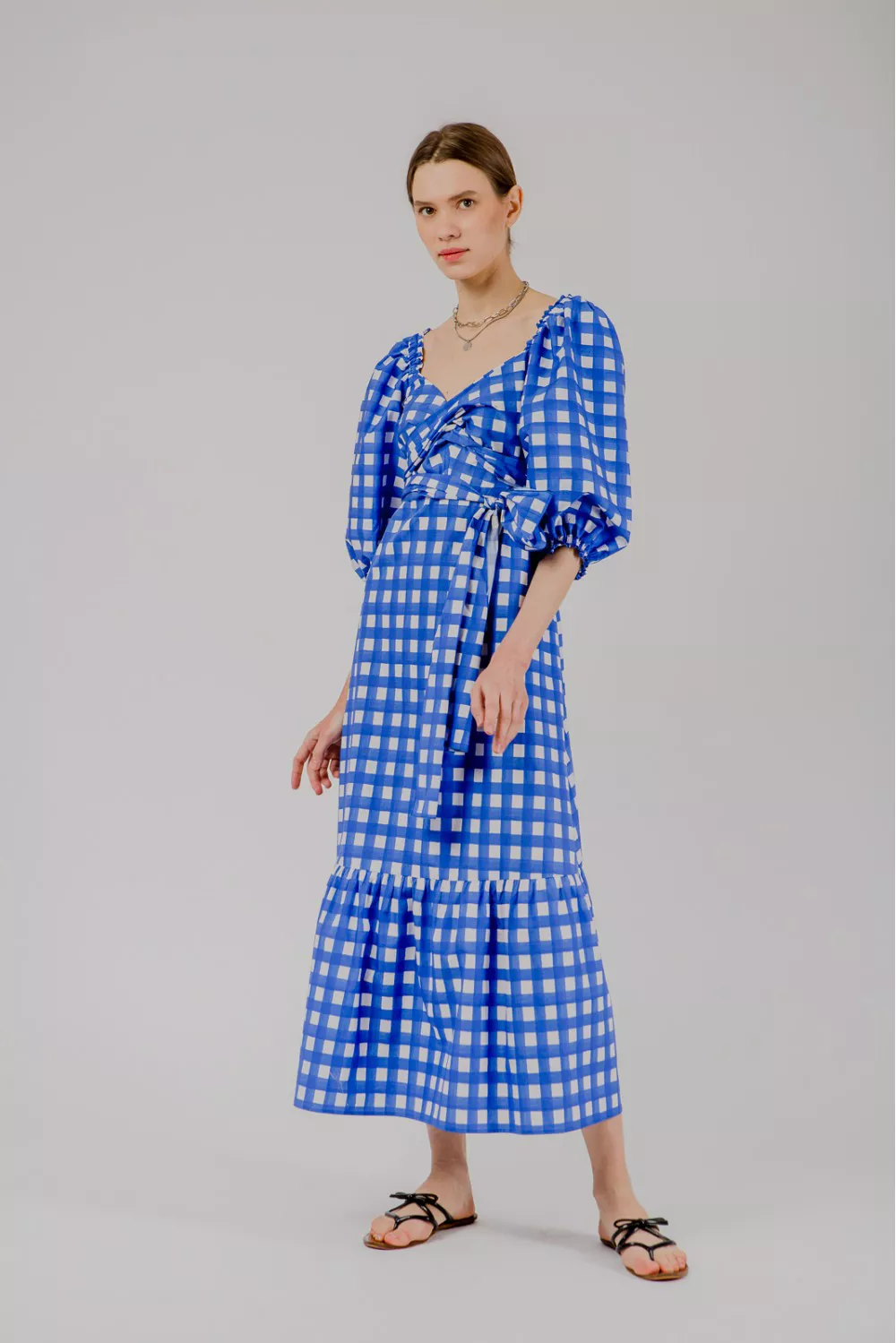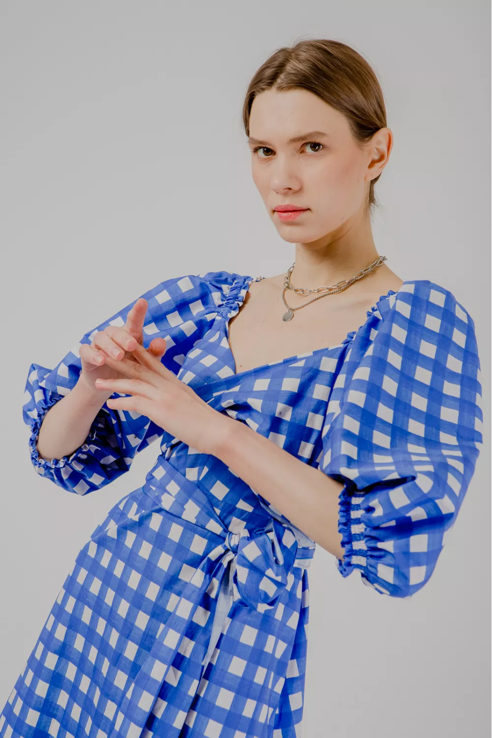 Синьо-біла бавовняна сукня в клітинку з пишними рукавами Талагасі