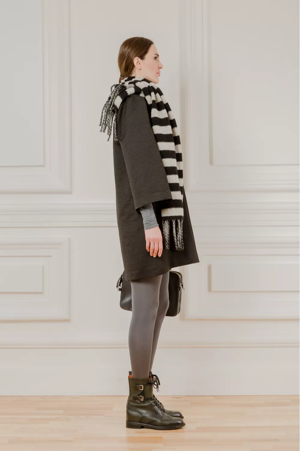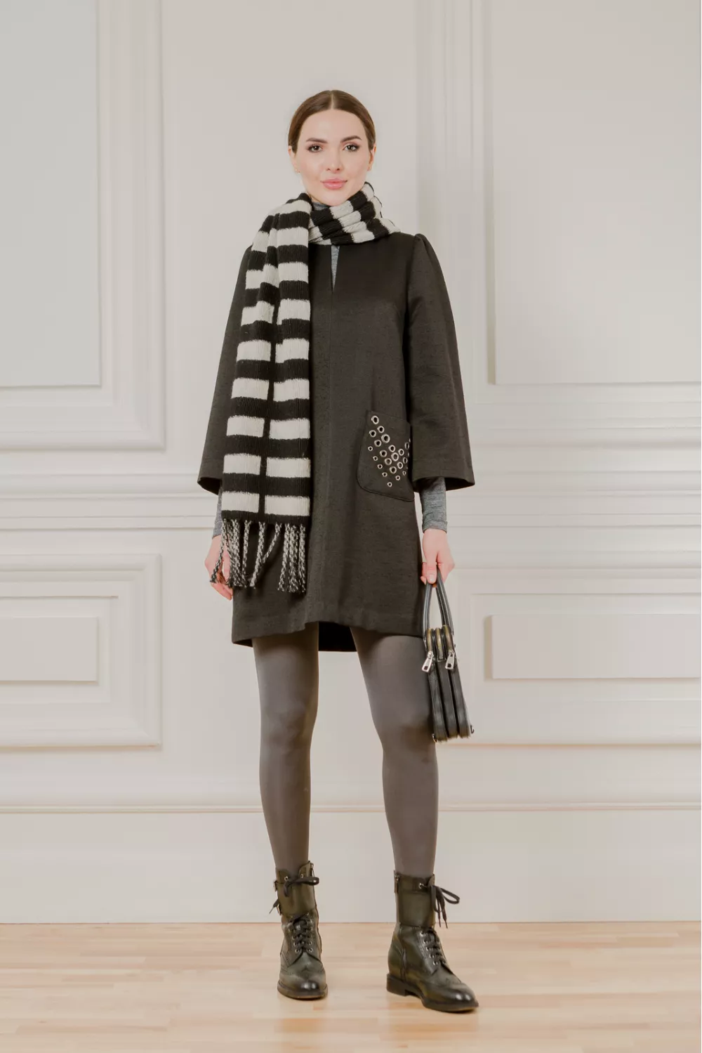 Вовняна сукня вільного крою з припіднятим рукавом 3/4, накладні кишені прикрашені люверсами та розріз на горловині є стильними доповненнями образу