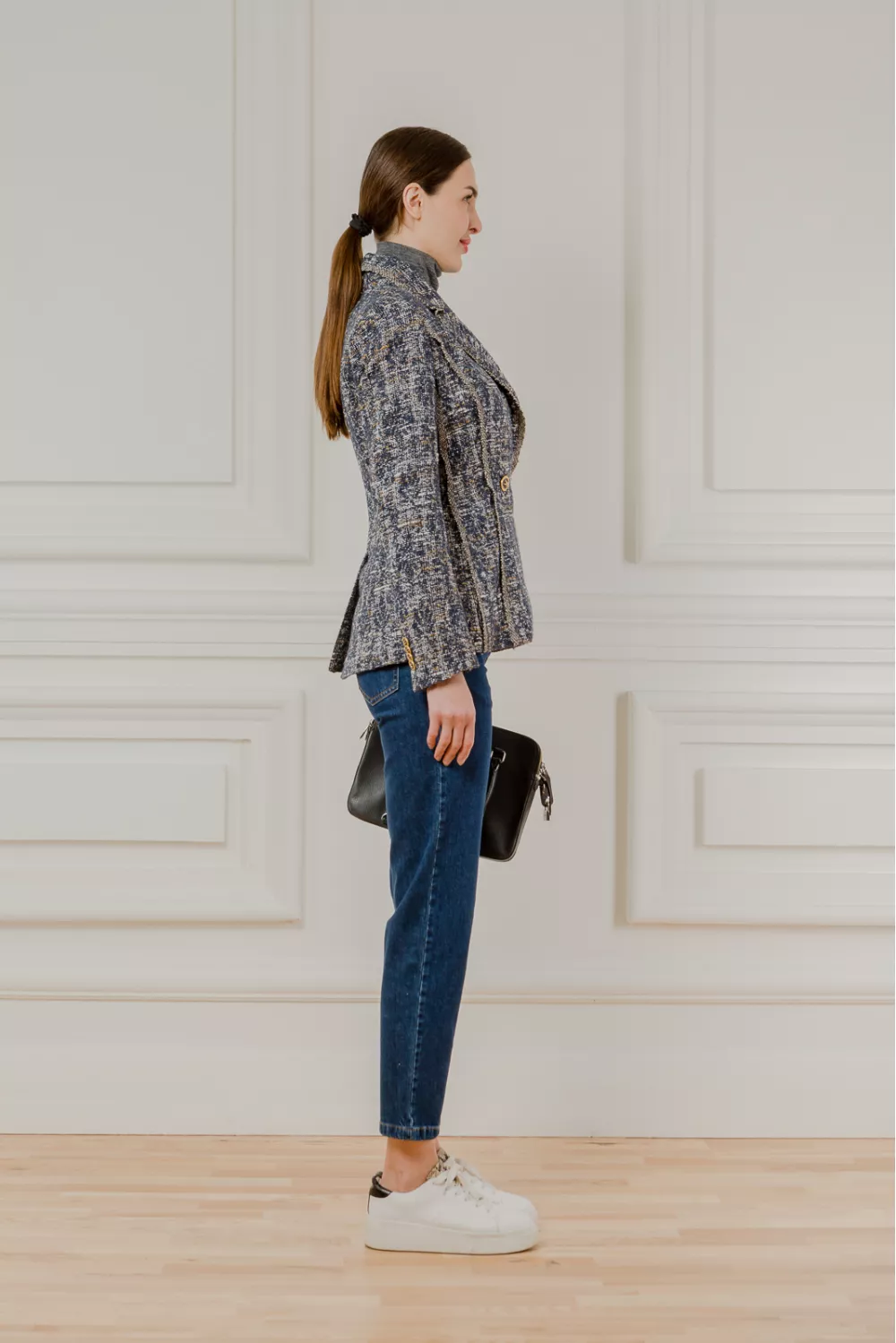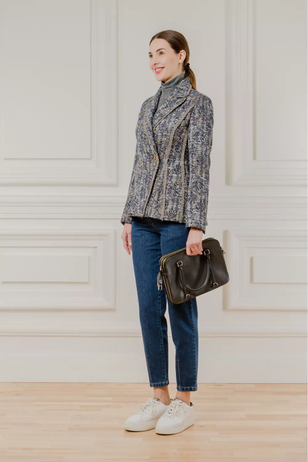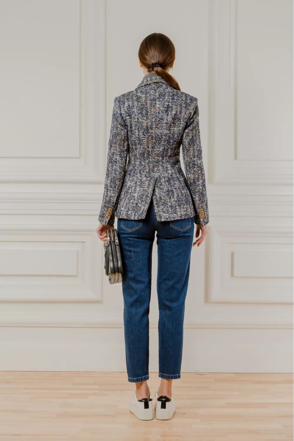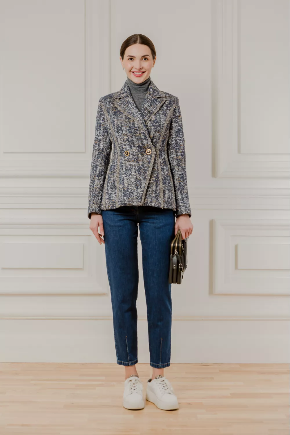 Приталений твідовий жакет з відкладним коміром синьо-гірчичного кольору. Контрастні вертикальні смужки на моделі підкреслять вашу фігуру у вигідному світлі, а преміум італійські тканини роблять жакет довговічним в носінні