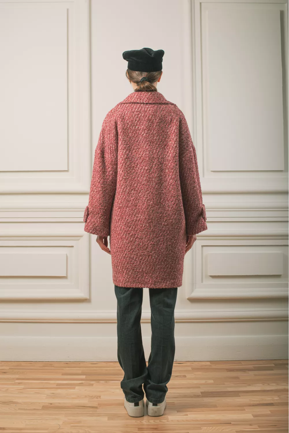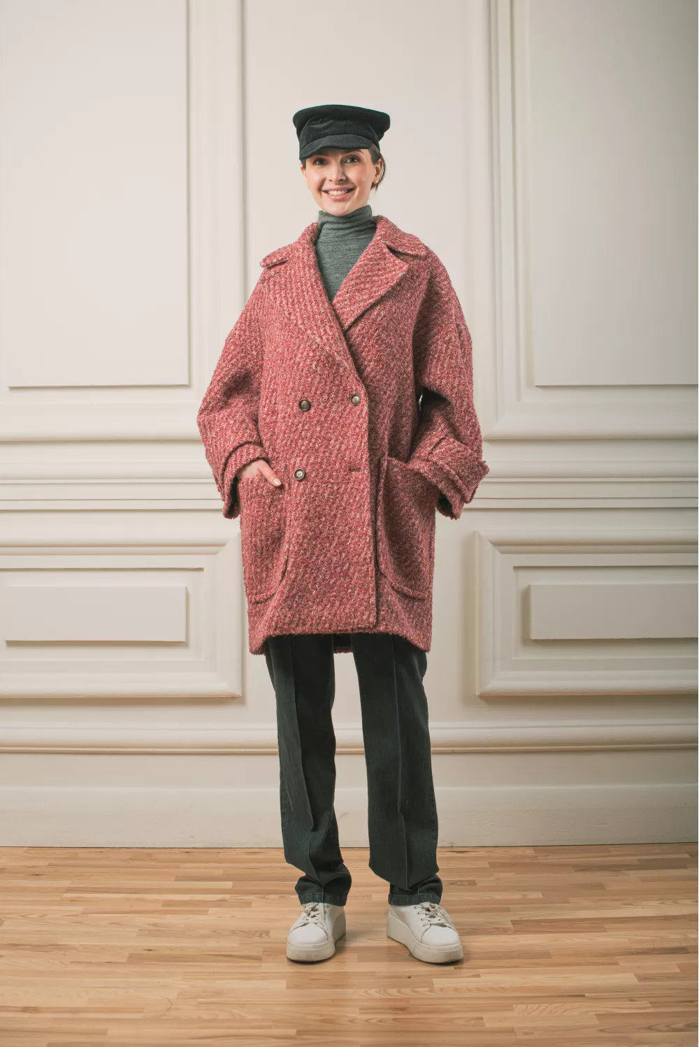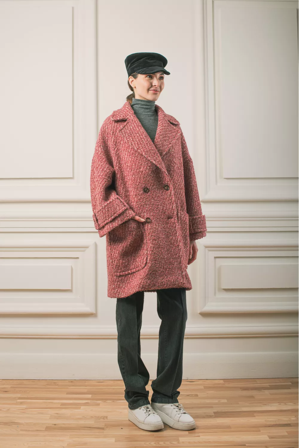 Оверсайз пальто з великими накладними кишенями. Модель має круту текстуру тканини та деталізована додатковими регуляторами на рукавах