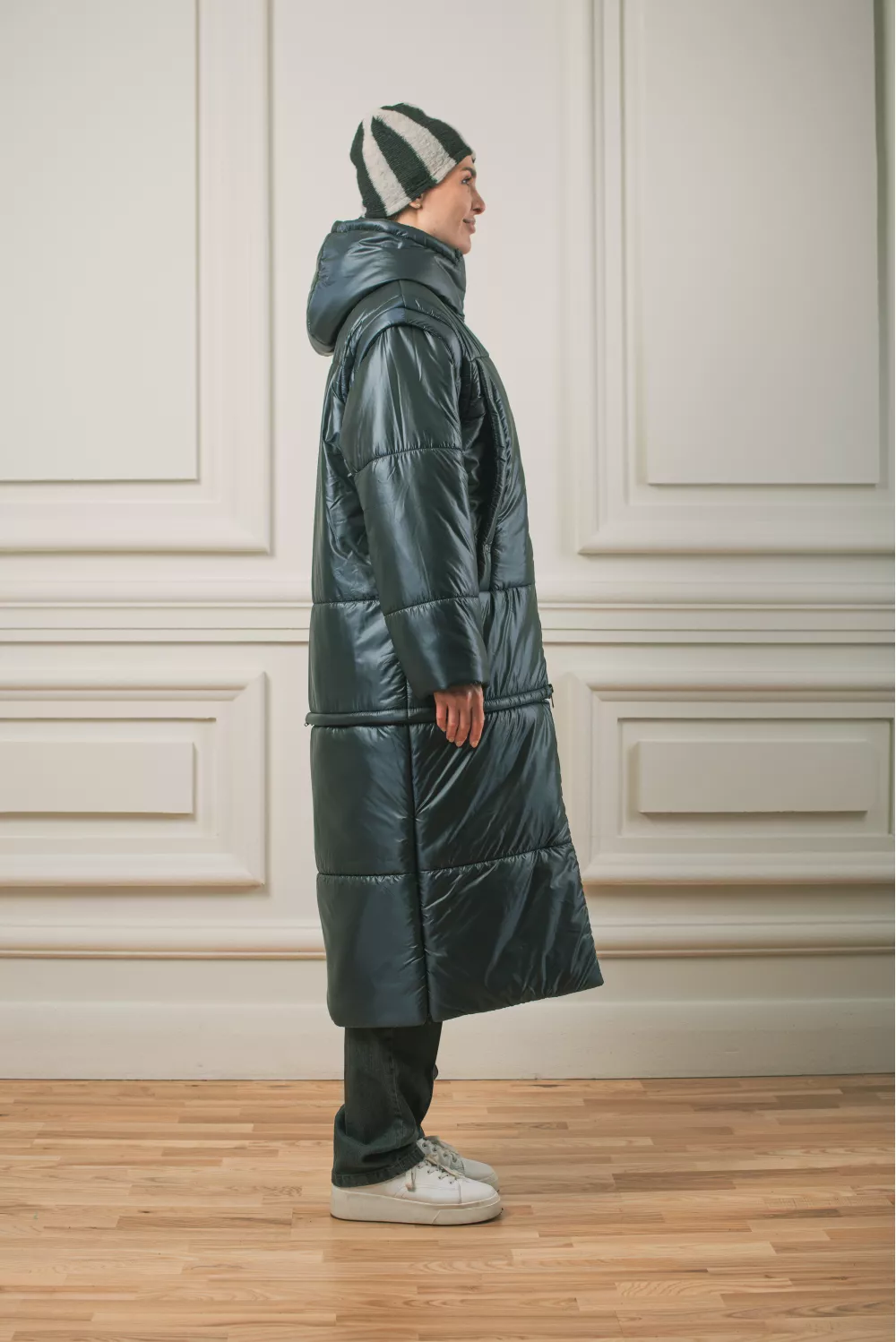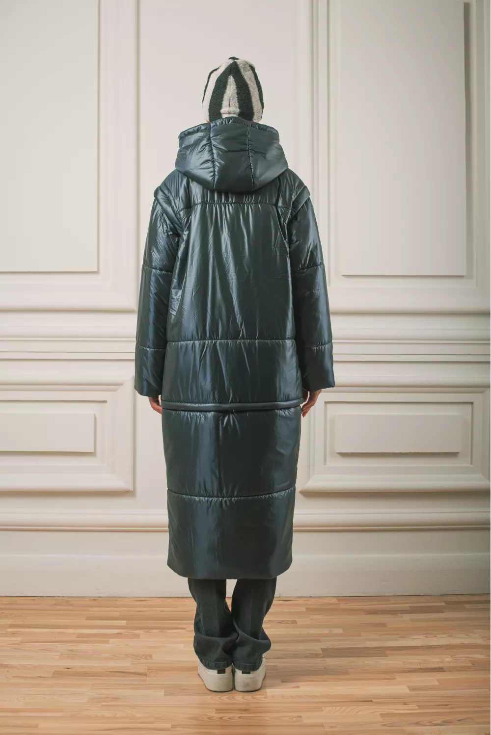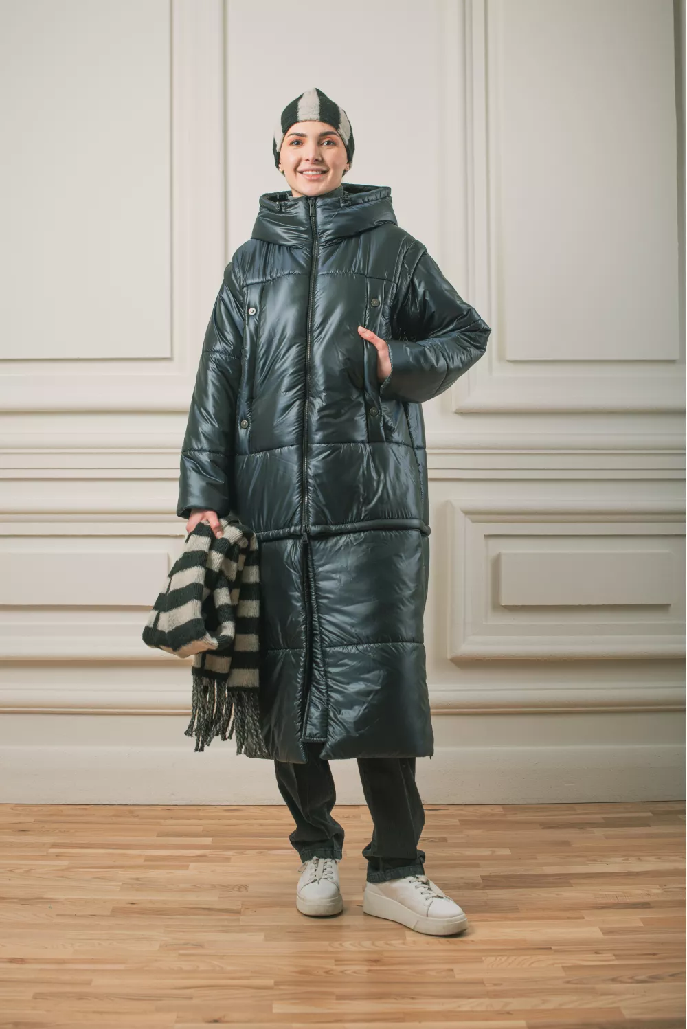 Довга тепла куртка з капюшоном має кілька своїх визначних особливостей. Модель представлена в форматі трансформера,де в ній з легкістю знімаються рукава та нижня частина,перетворюючи куртку на жилетку міді довжини. Всі застібки йдуть на блискавці. Куртка також має приховані верхні кишені