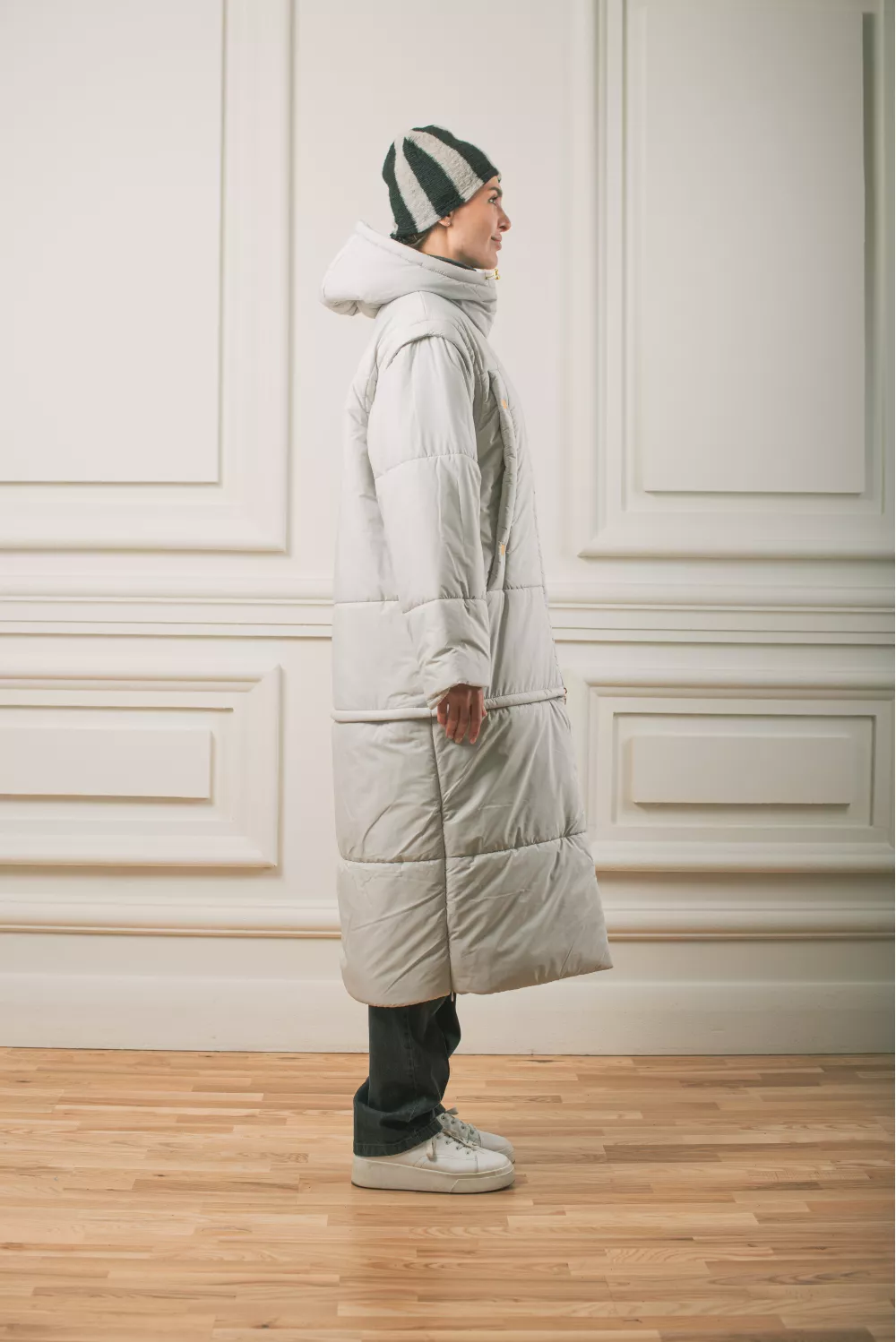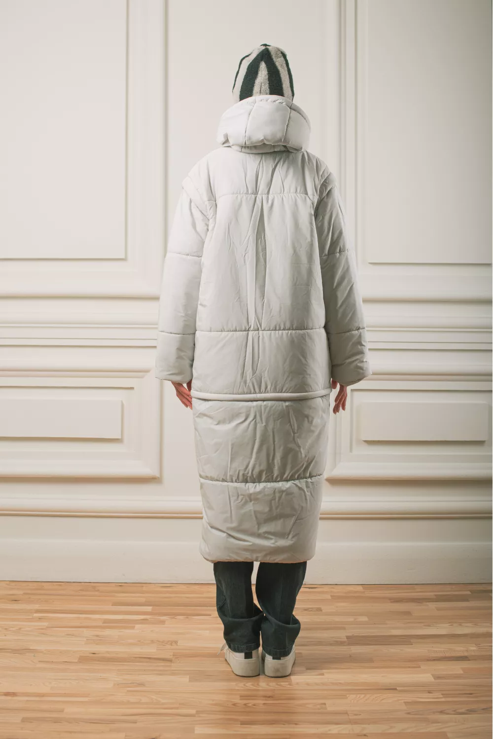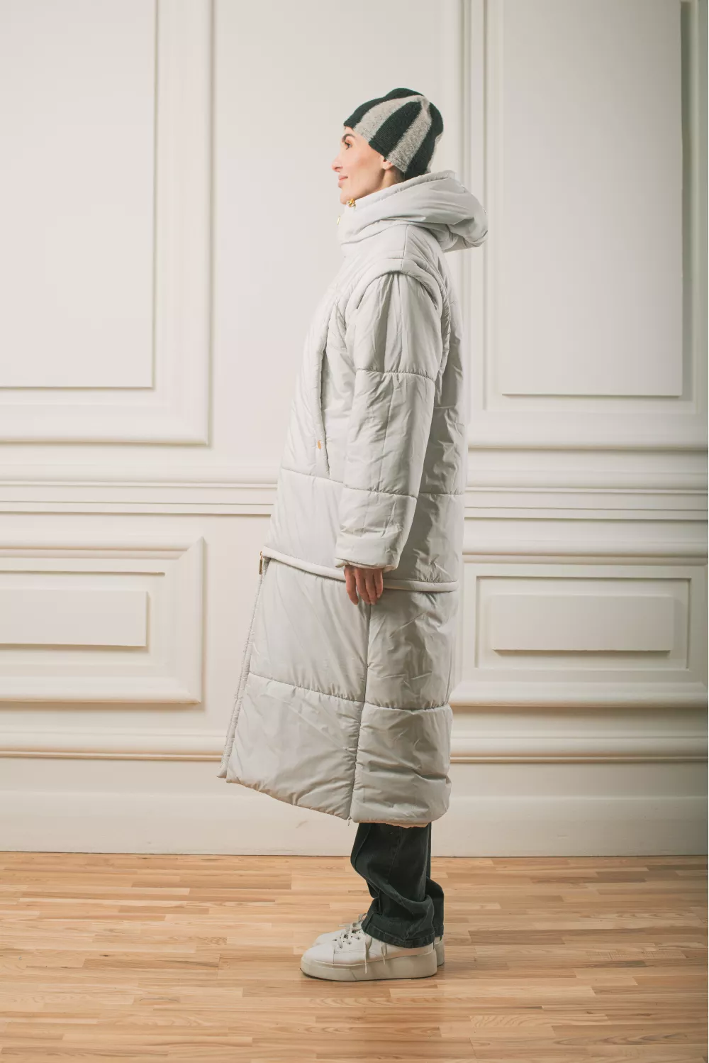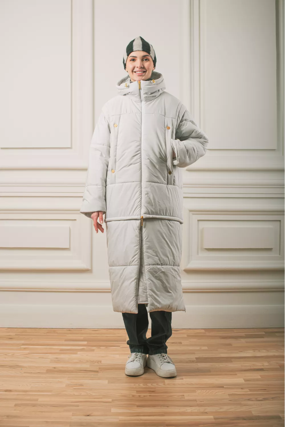 Довга тепла куртка з капюшоном має кілька своїх визначних особливостей. Модель представлена в форматі трансформера,де в ній з легкістю знімаються рукава та нижня частина,перетворюючи куртку на жилетку міді довжини. Всі застібки йдуть на блискавці. Куртка також має приховані верхні кишені