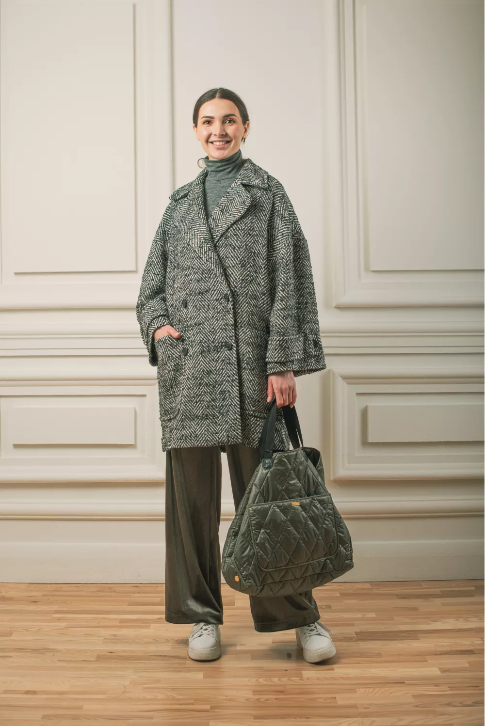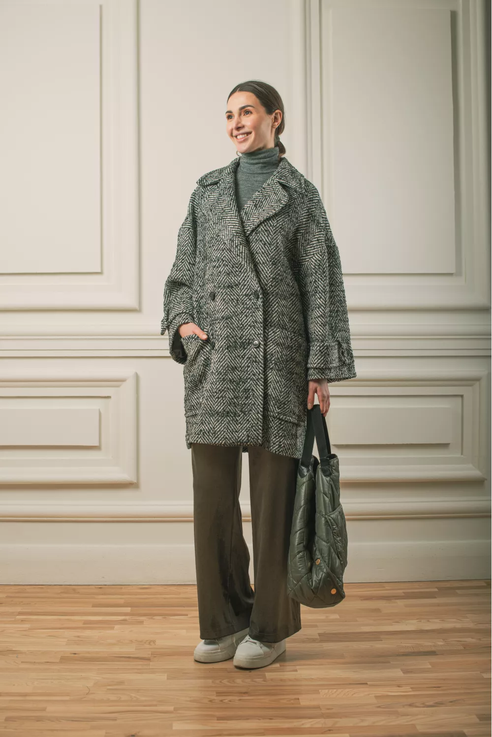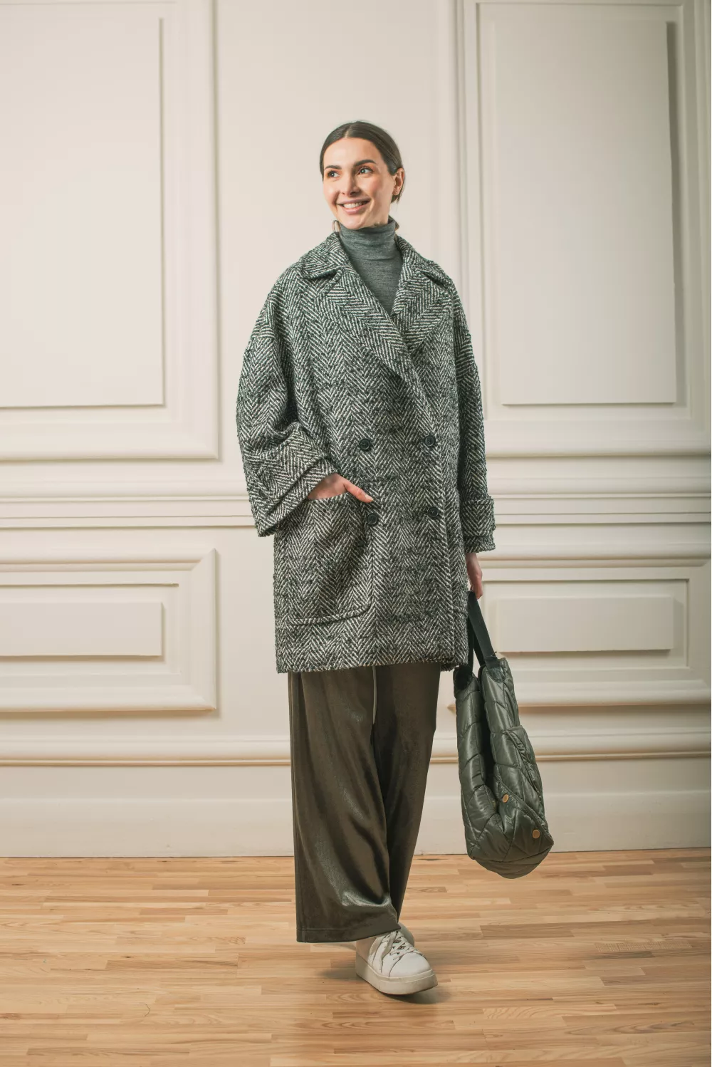 Оверсайз пальто з великими накладними кишенями. Модель має круту текстуру тканини та деталізована додатковими регуляторами на рукавах