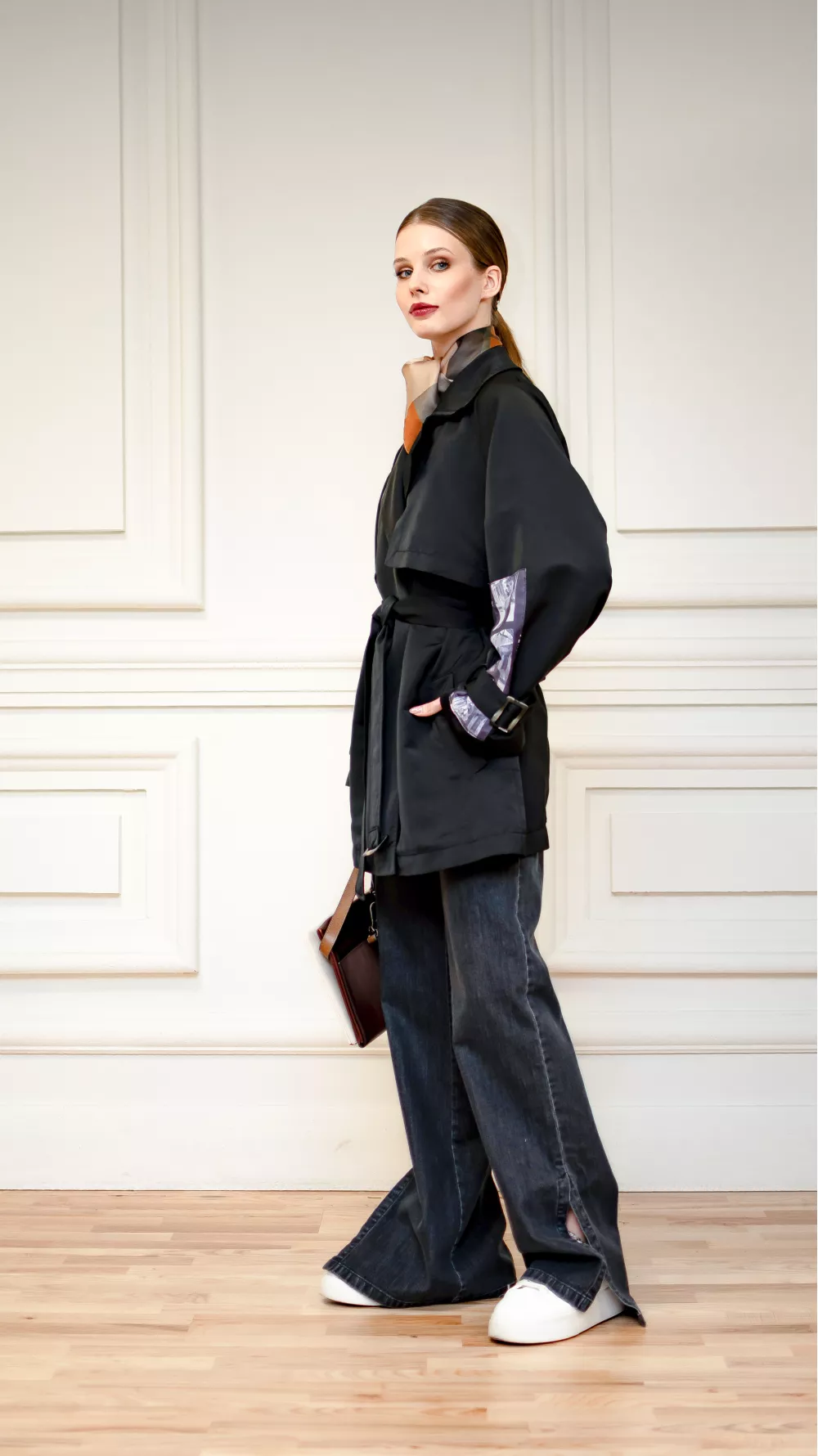 Однотонний колір поєднаний з принтованою спинкою та рукавами моделі є чудовим базовим рішенням на цей сезон. Можна стилізувати з широкими шкіряними ременями та базовими речами