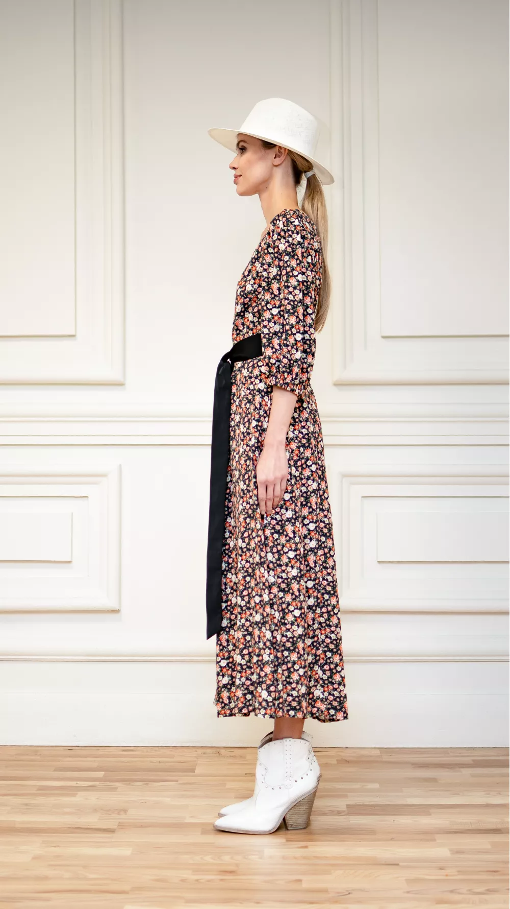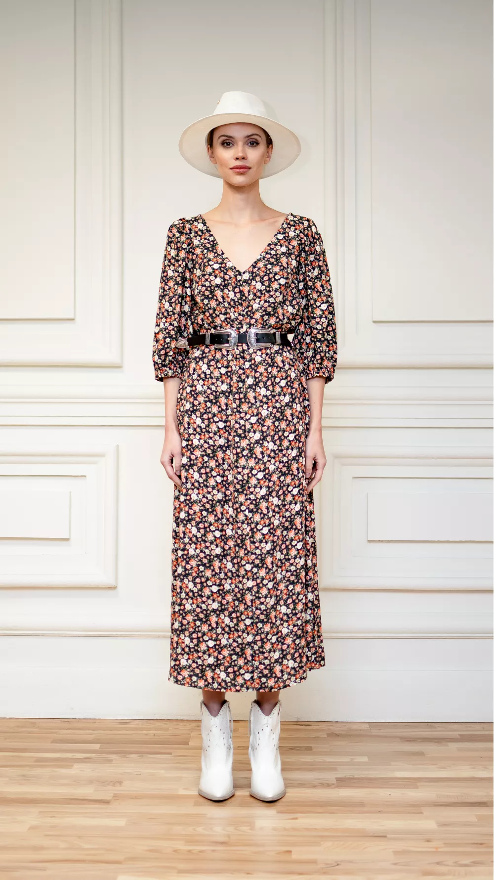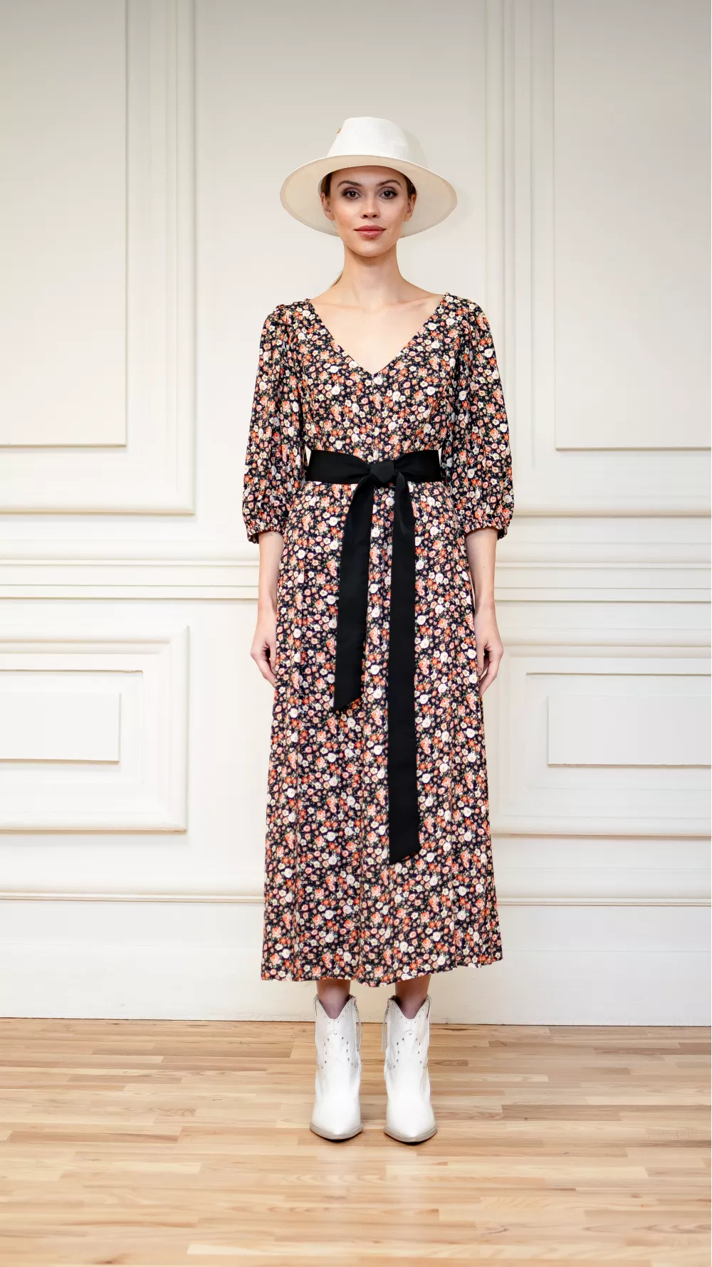 Легка принтована сукня з глибоким вирізом та коротким рукавом на резинці. Прямий покрій та приховані бокові кишені, що додають повсякденної нотки, дають можливість поєднувати сукню з денімом та плащівкою