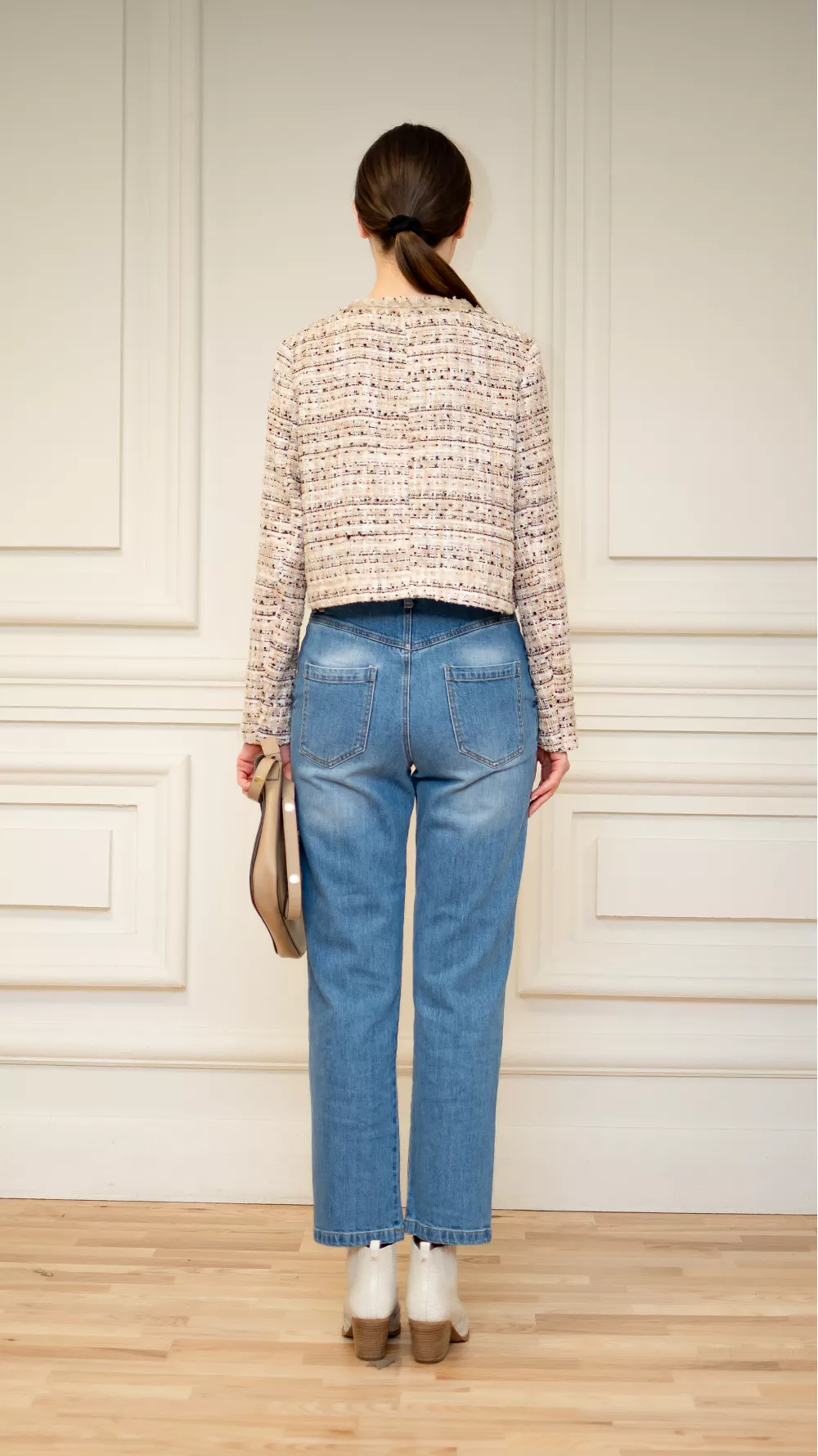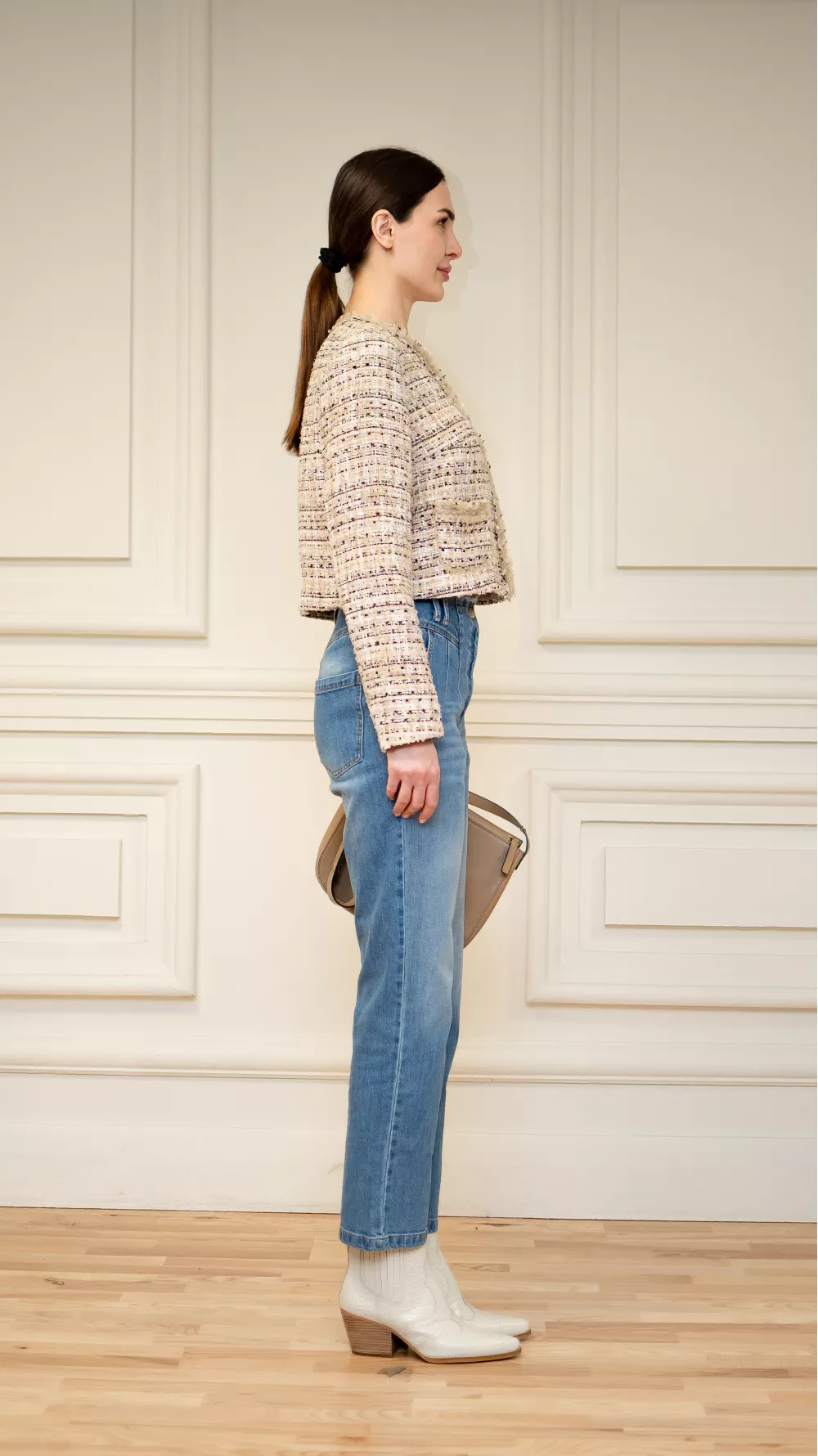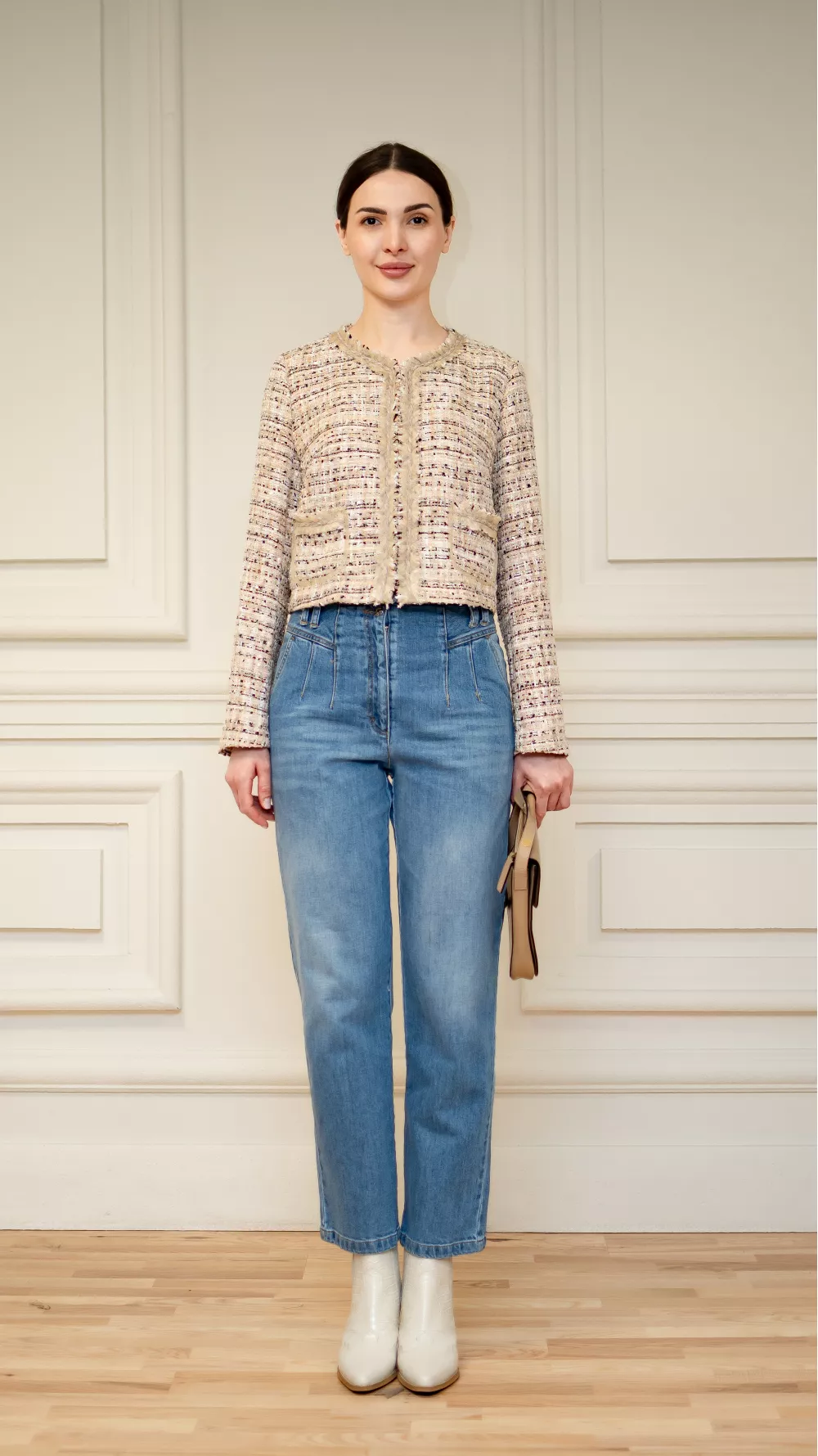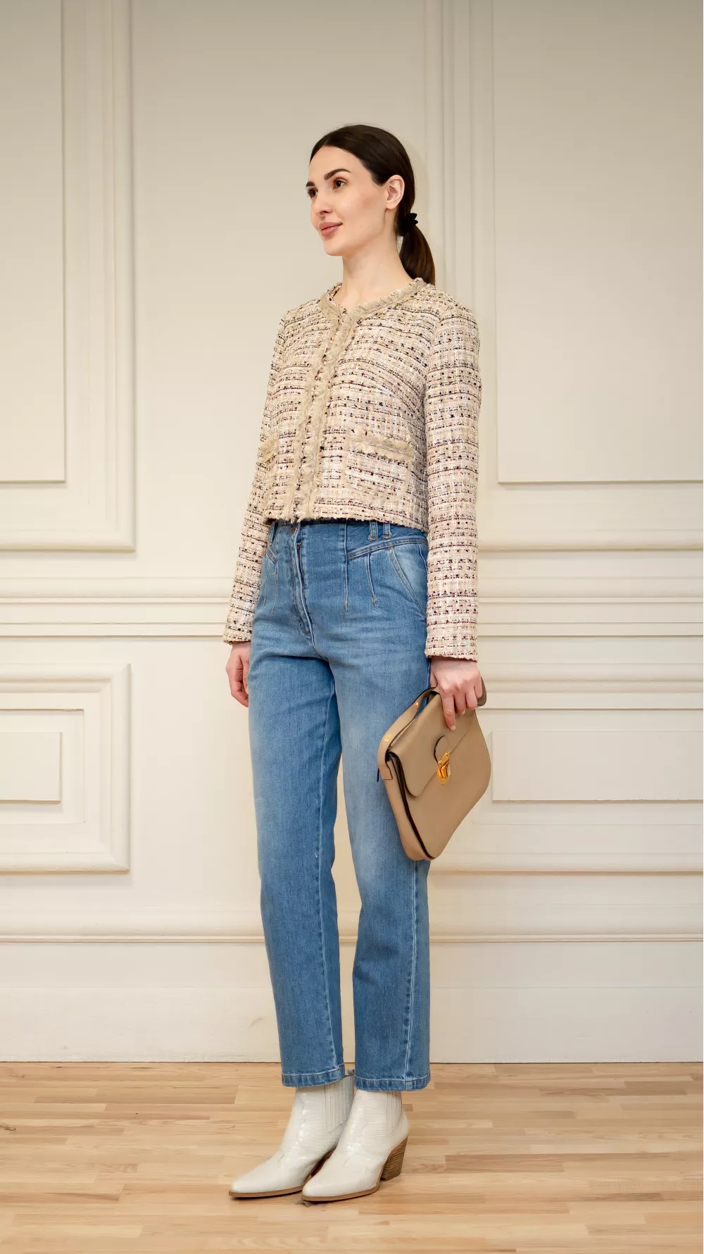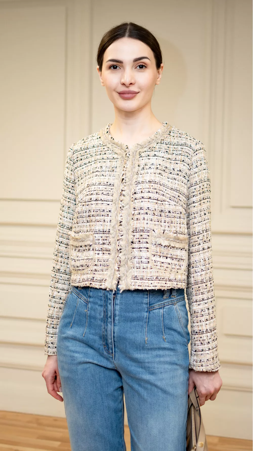 Класичний укорочений жакет в стилі Шанель, що виконаний в пастельних відтінках, стане основою образів різних стилістик