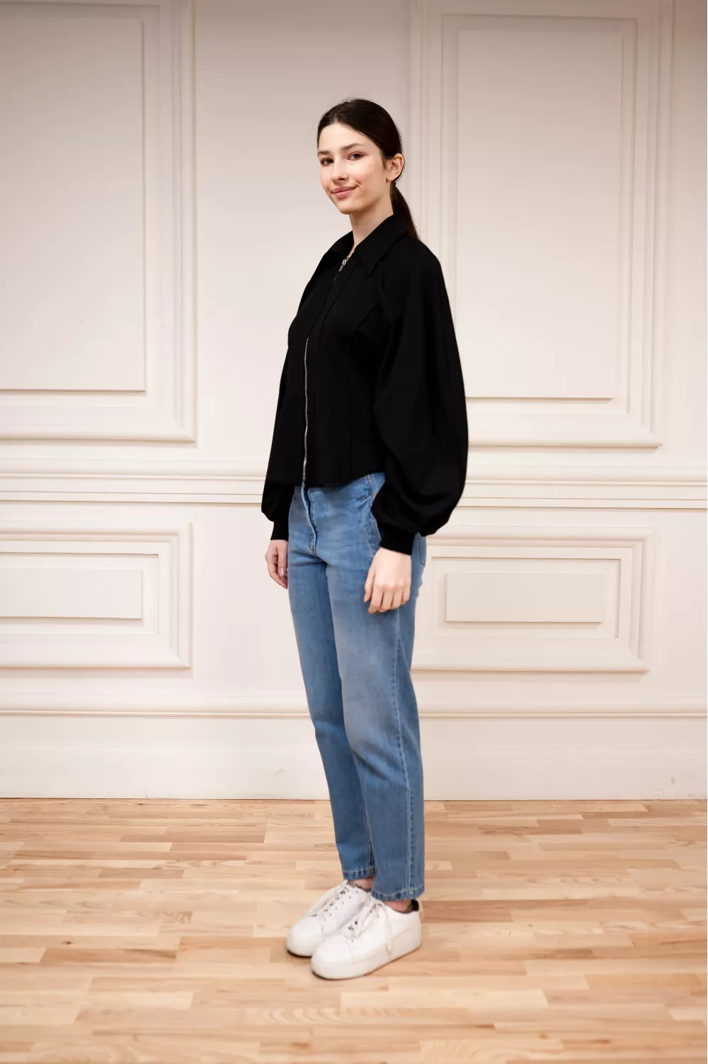 Модель жакету на блискавці ідеально підійде на міжсезонний час та може замінити вам верхній одяг весною. Жакет унікальний своїм приталеним силуетом та пишним рукавом із спеціальною збіркою на внутрішній частині рукава, що робить його більш романтичним