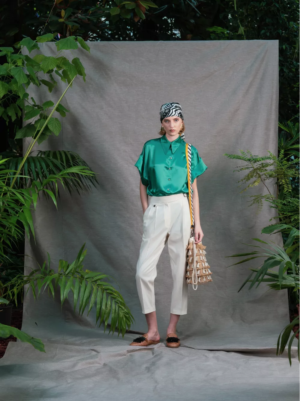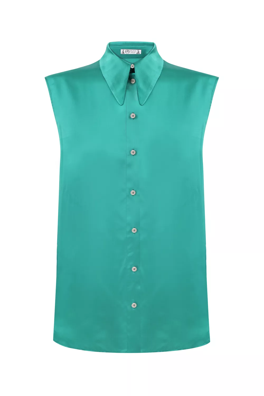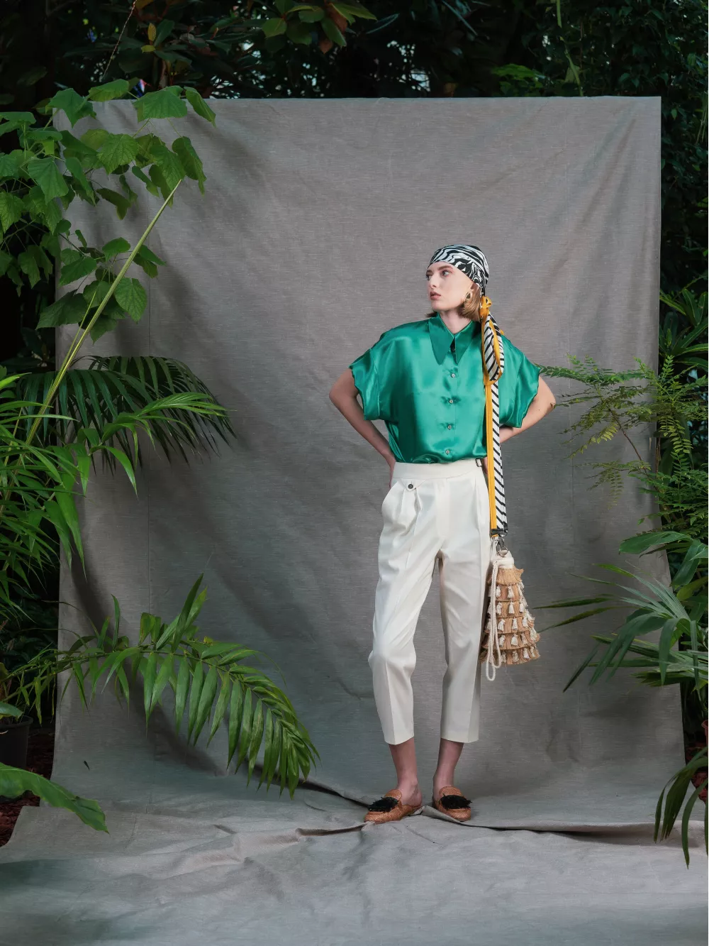 The Asta shirt from Golets creates such an effortless chic. Made from Italian mikado silk in a vibrant color, it has a pointed collar and cap sleeves. Wear it with a harmonious midi skirt