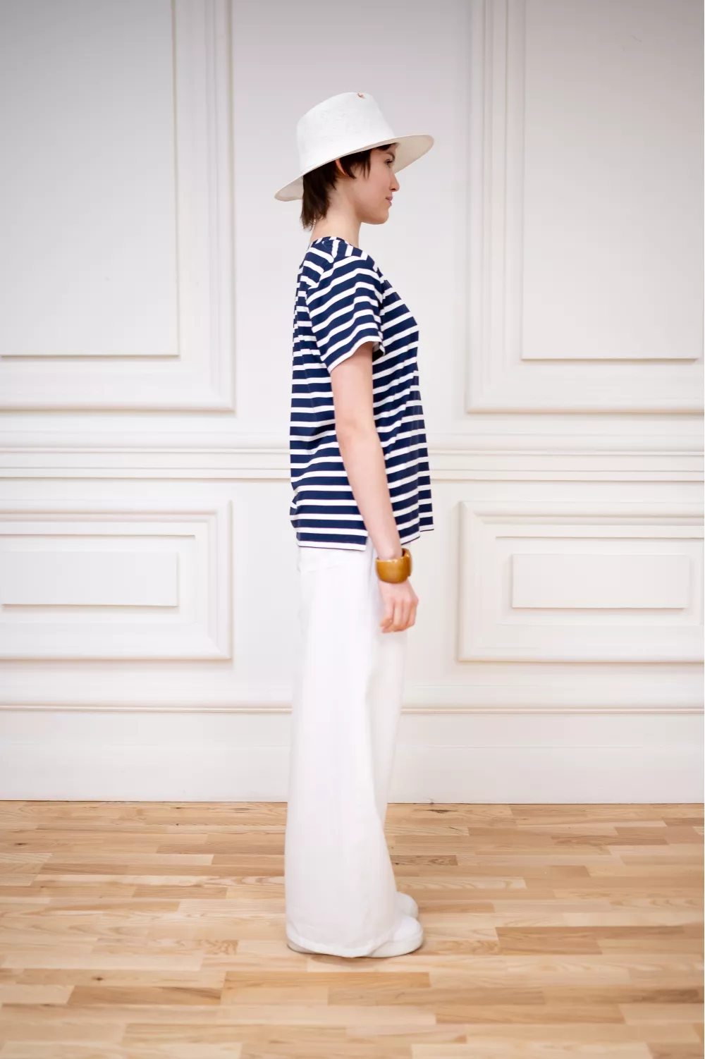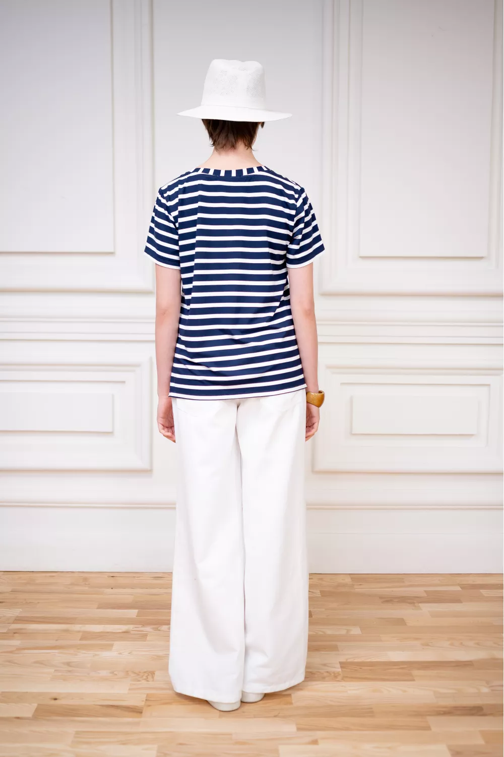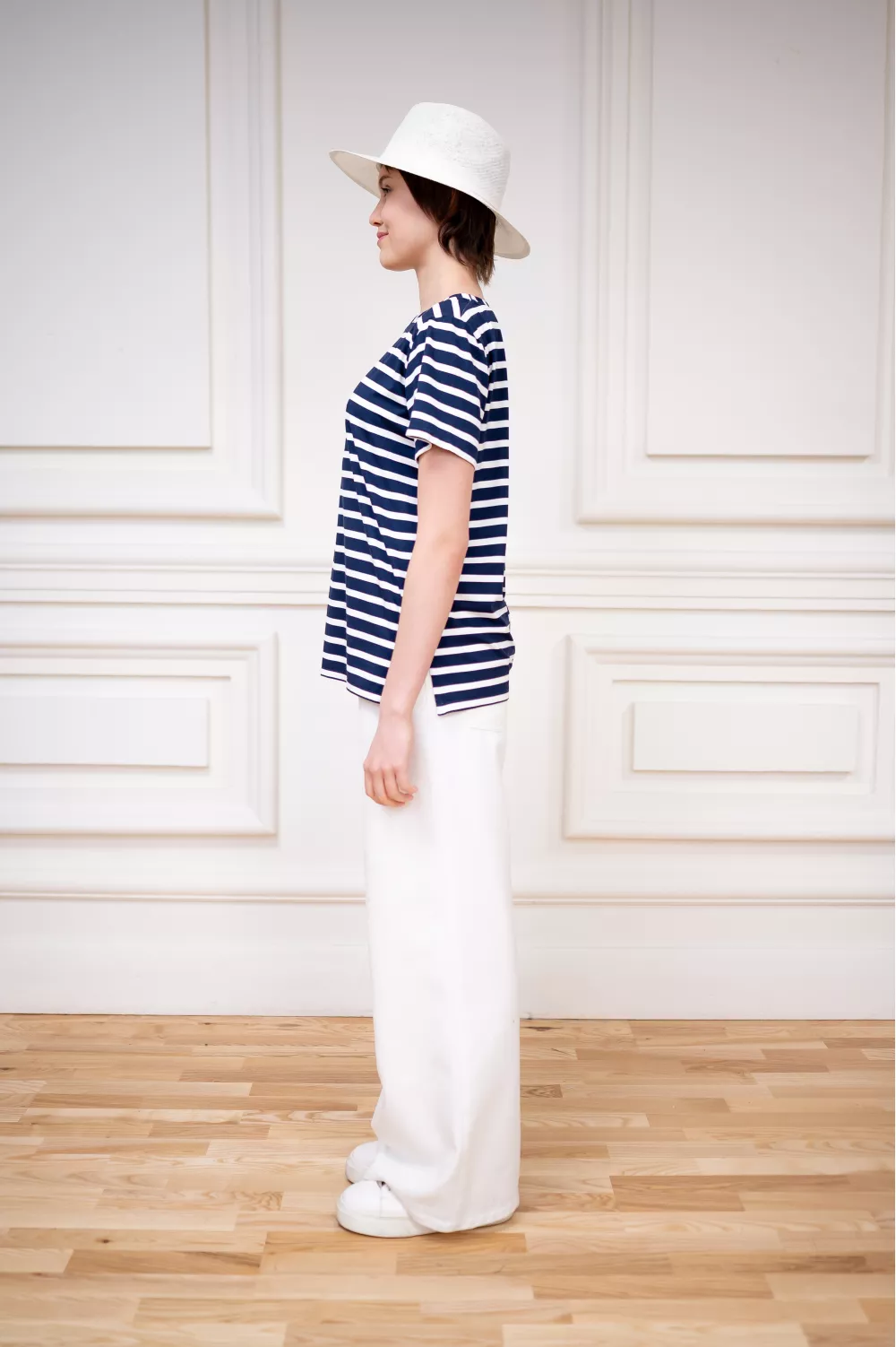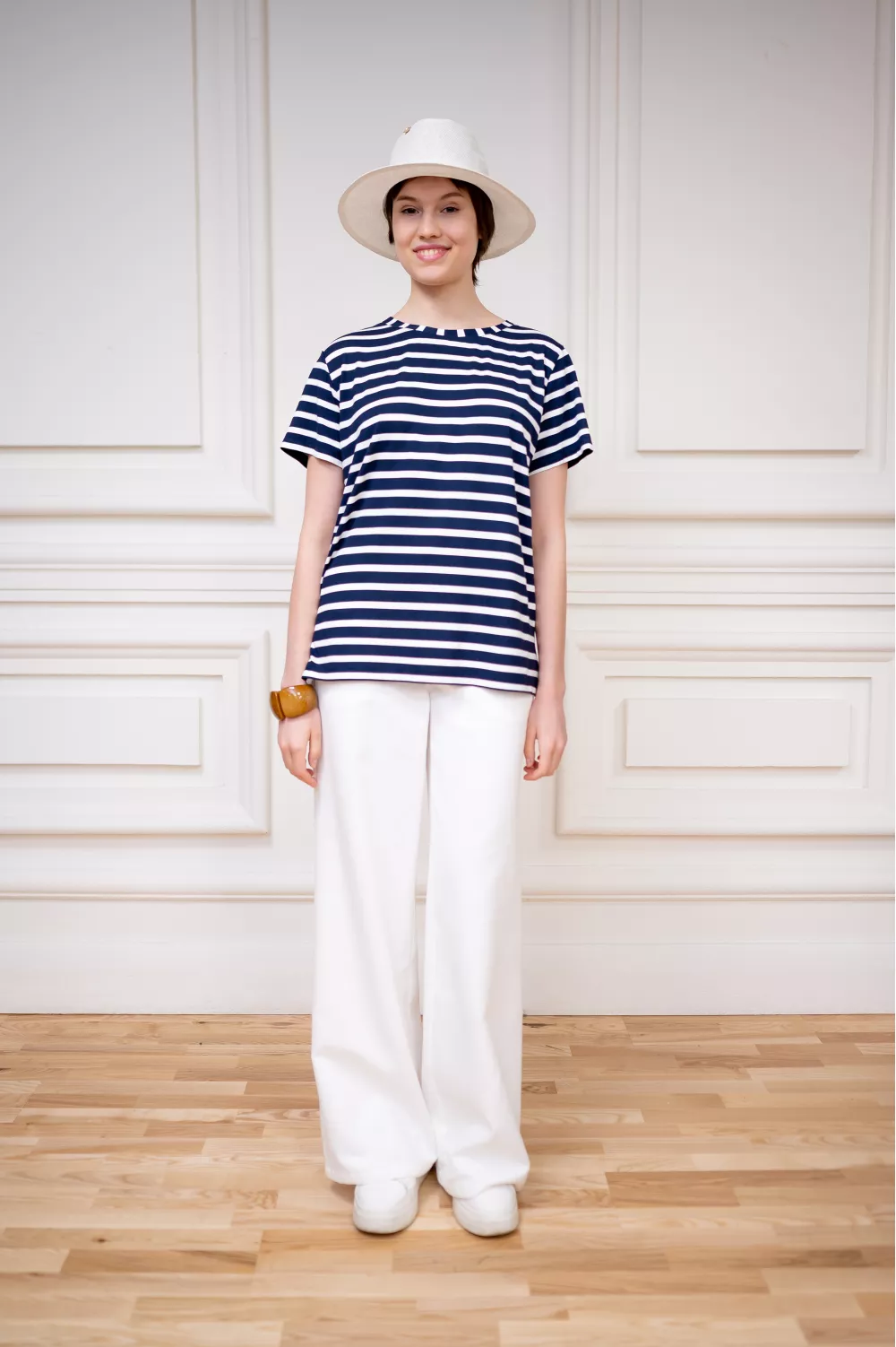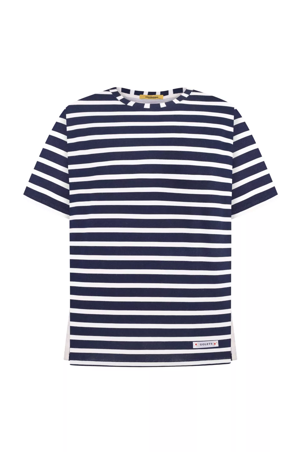 Базова модель футболки в морському стилі, яка за рахунок прямого крою добре доповнює різнопланові образи