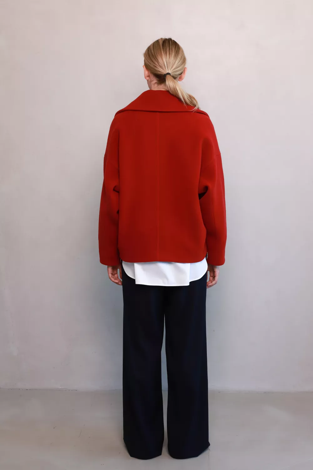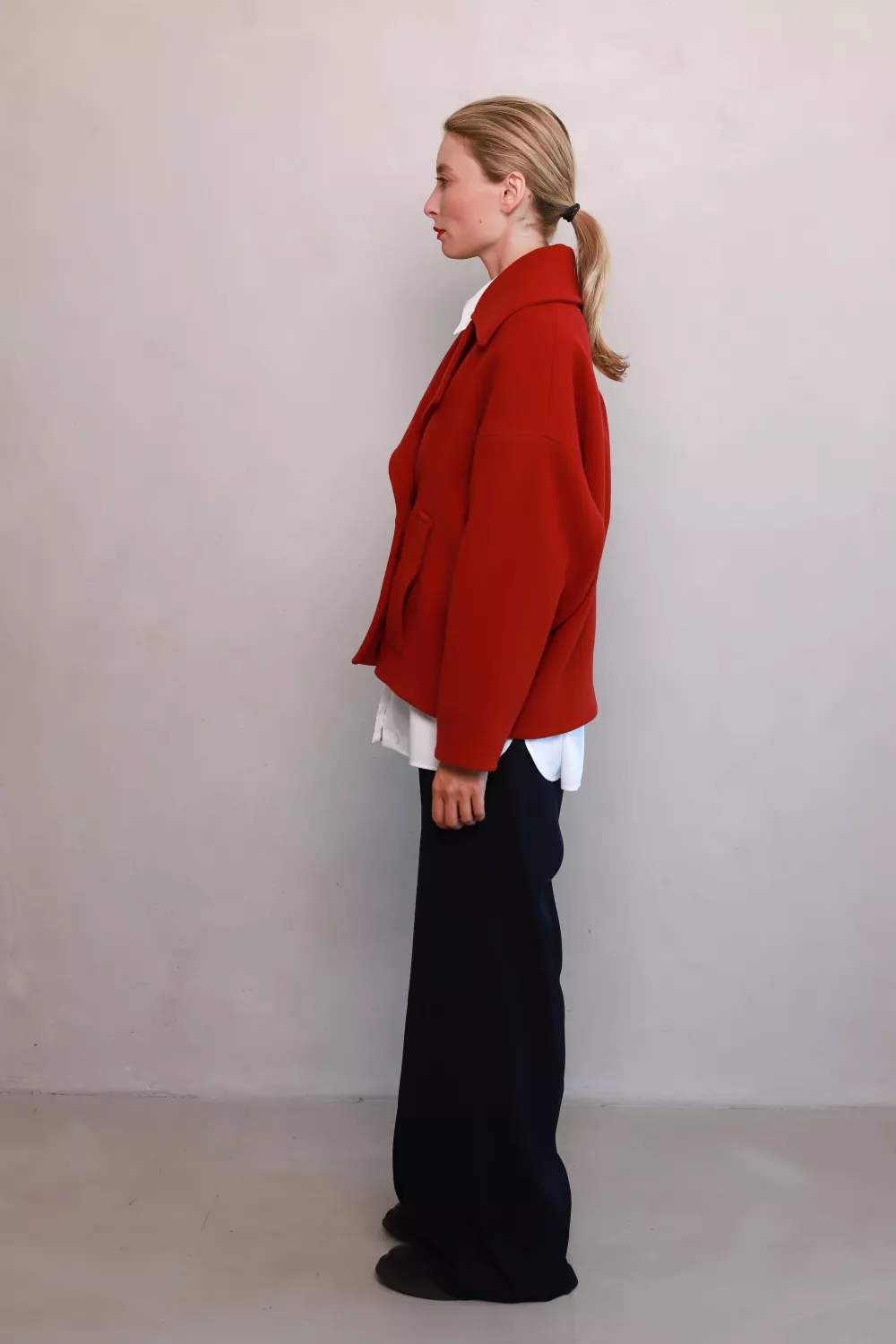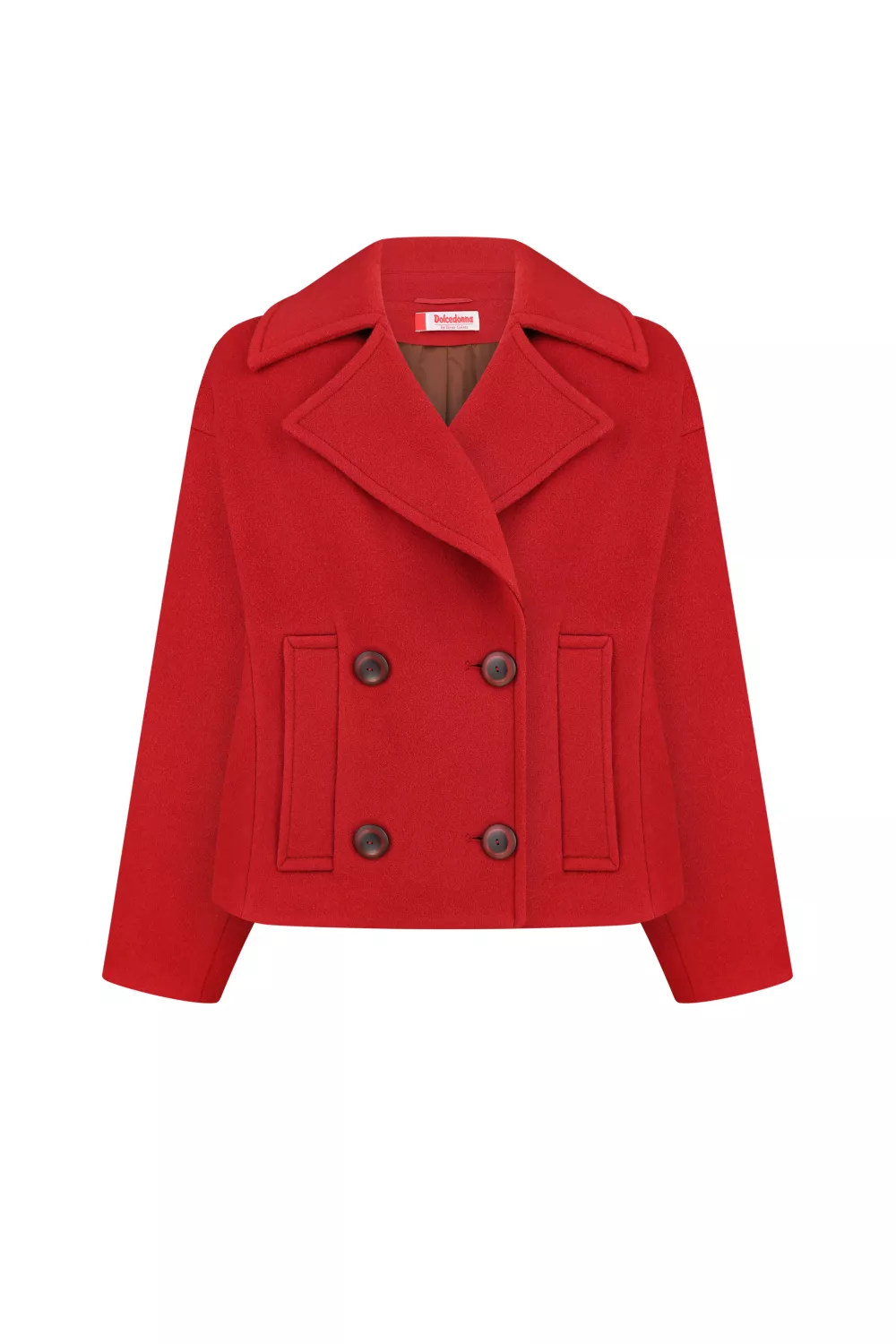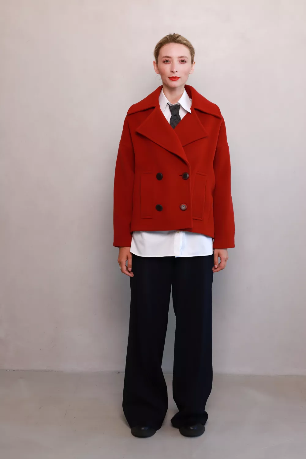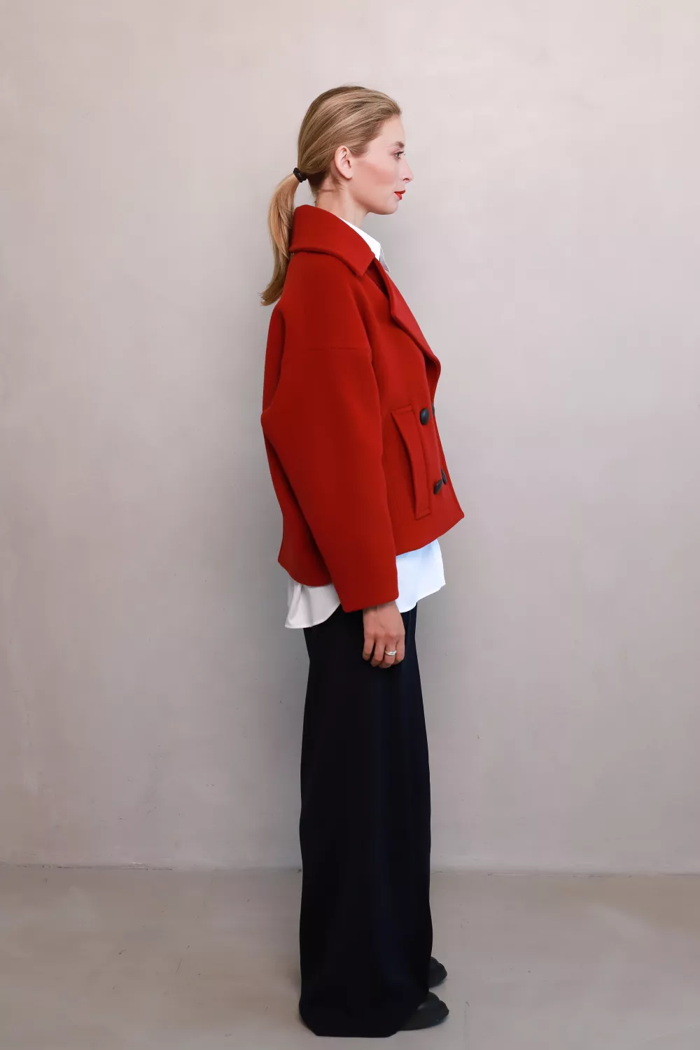 Коротке вовняне пальто в яскравому бордовому кольорі — must-have сезону, який поєднує класику та сучасність. Двобортна застібка з виразними ґудзиками та акцентний відкладний комір надають образу елегантності, а лаконічний крій робить річ універсальною для будь-якого стилю.