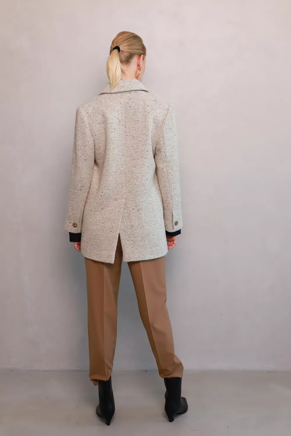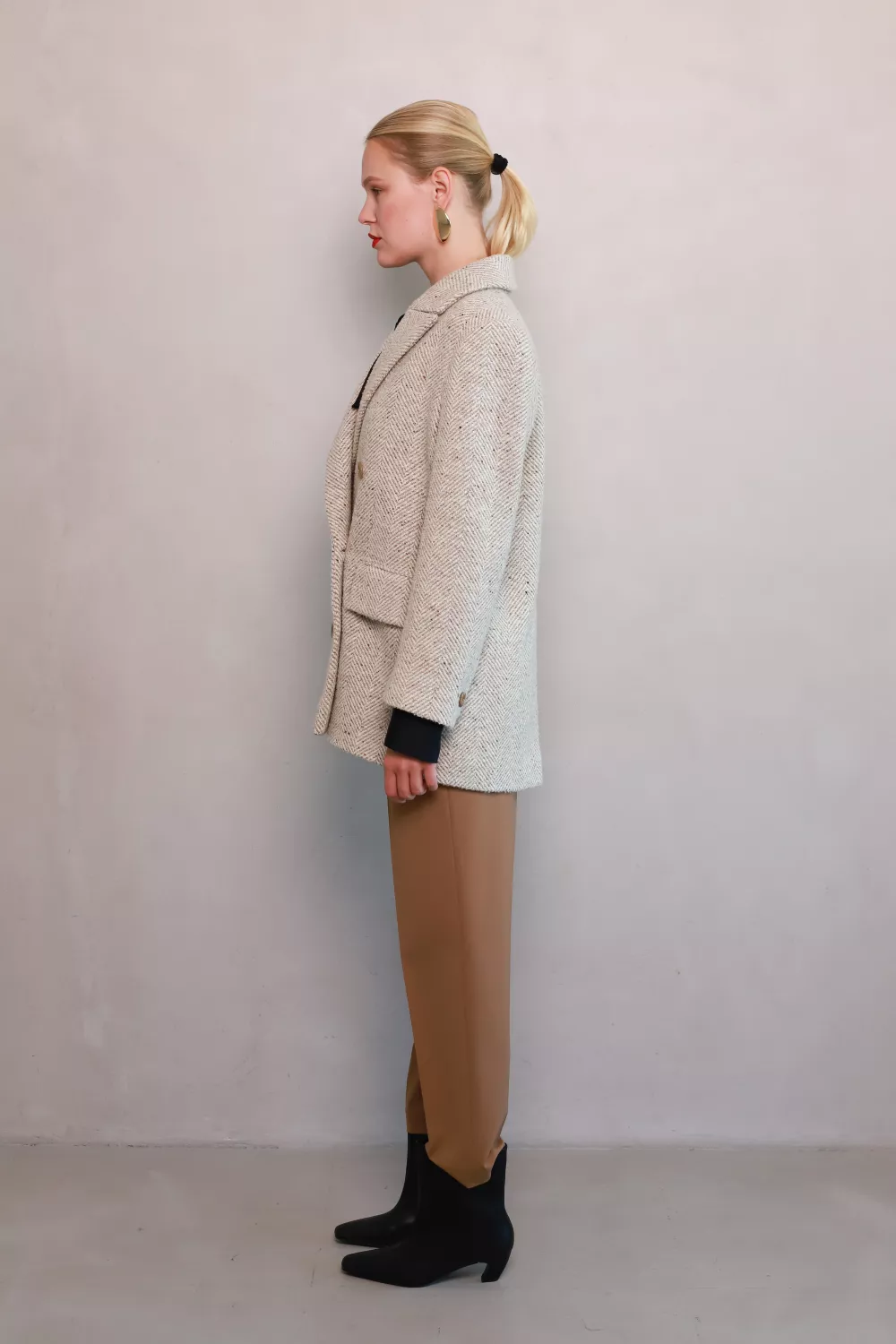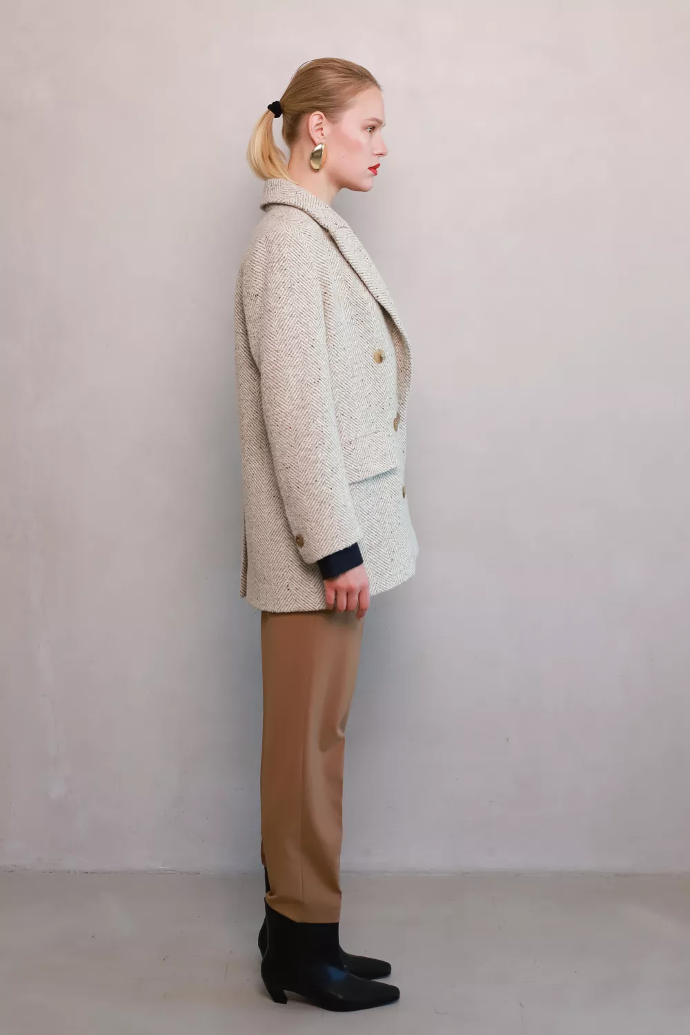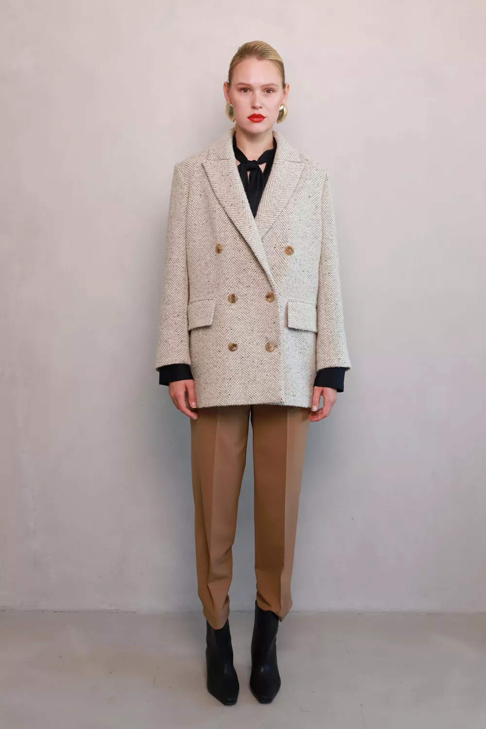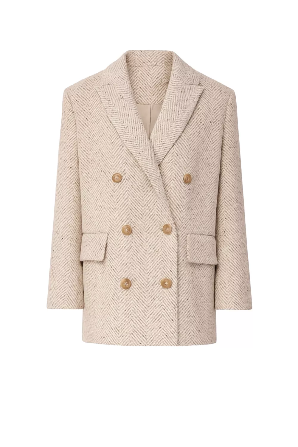Елегантне пальто з натуральної вовни у світлому відтінку — універсальна база для стильного гардеробу. Двобортний крій із великими ґудзиками та строгим лацканом створює силует із легкою ноткою французького шику.