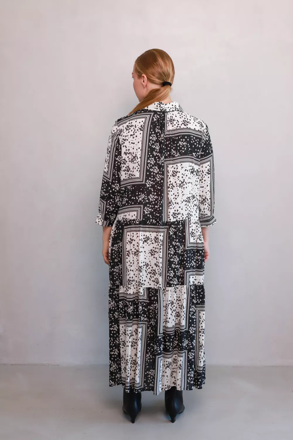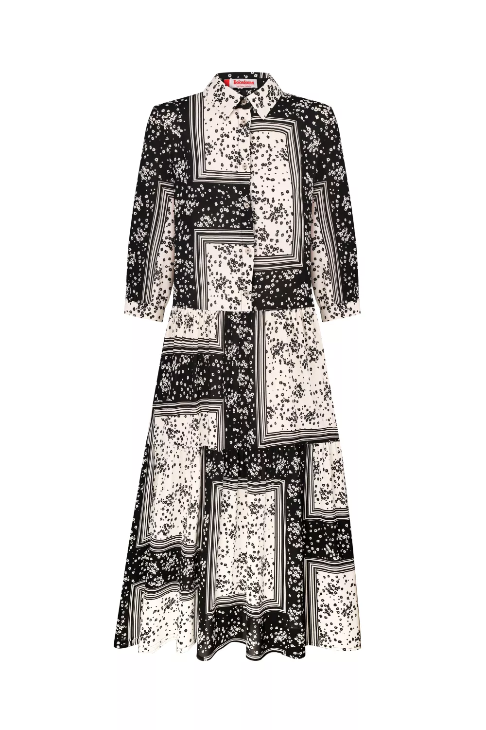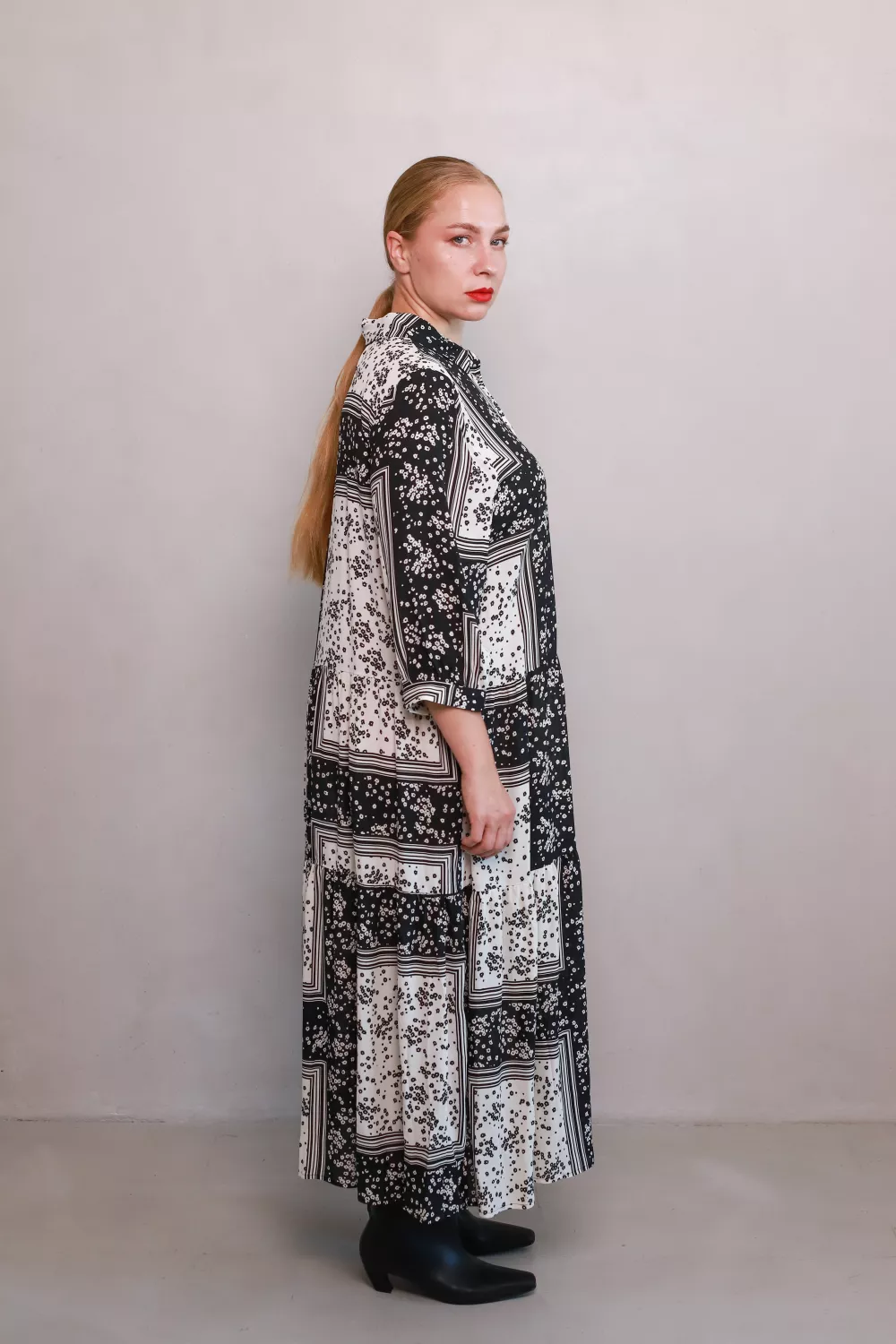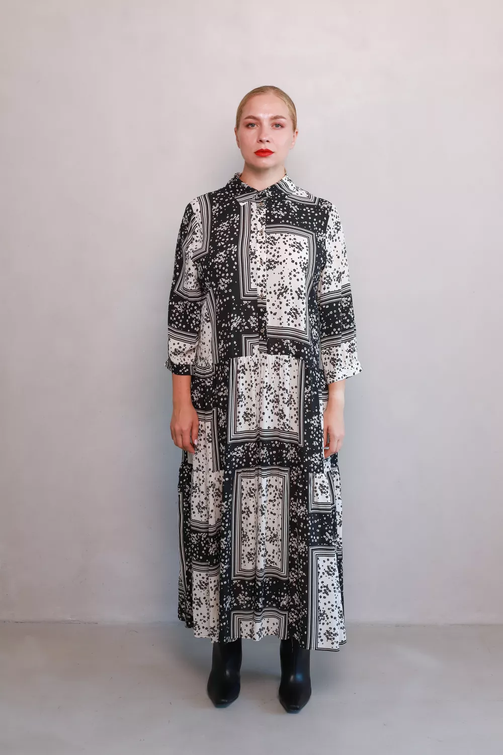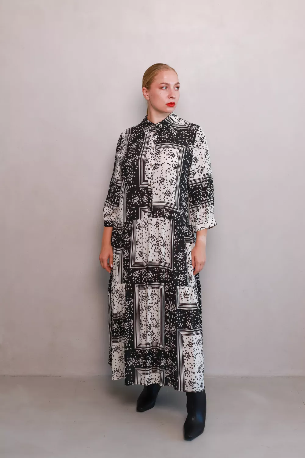 Легка та стильна сукня з 100% віскози — ідеальний вибір для тих, хто цінує комфорт і сучасний дизайн. Чорно-білий геометричний принт з абстрактними елементами створює ефектний контраст і додає образу характеру.