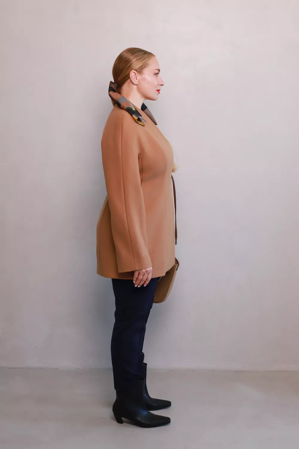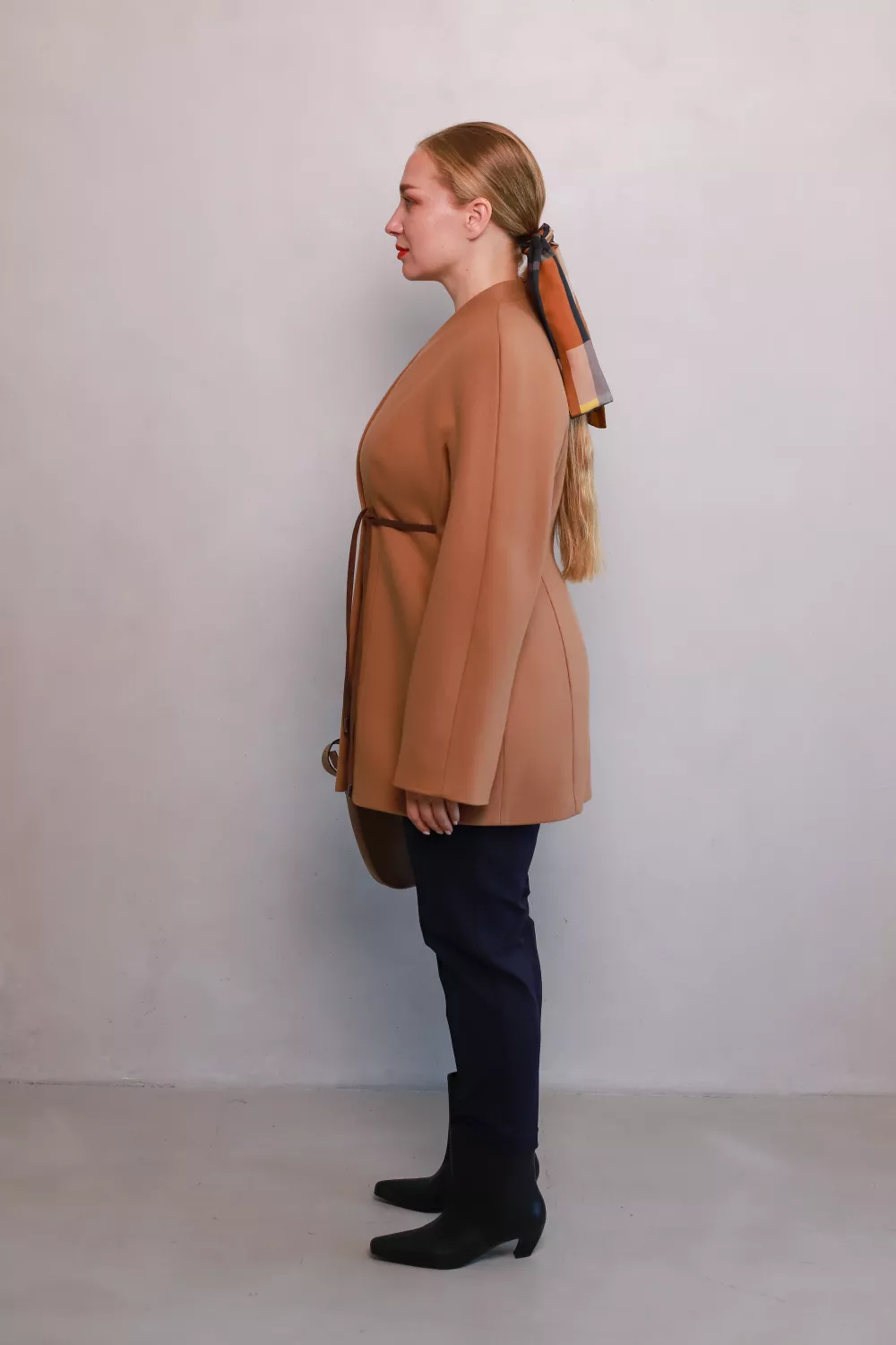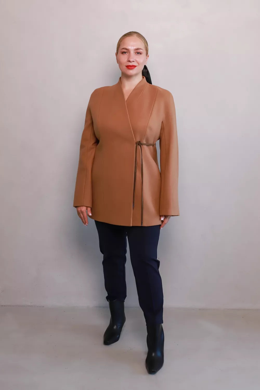 Витончений жакет у теплій гамі створений для жінок, які цінують мінімалізм і сучасну елегантність. Лаконічний крій без ґудзиків підкреслений акуратним запахом та тонким поясом-зав’язкою, що формує жіночний силует.