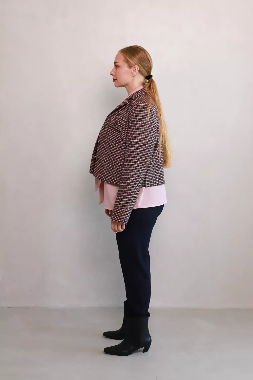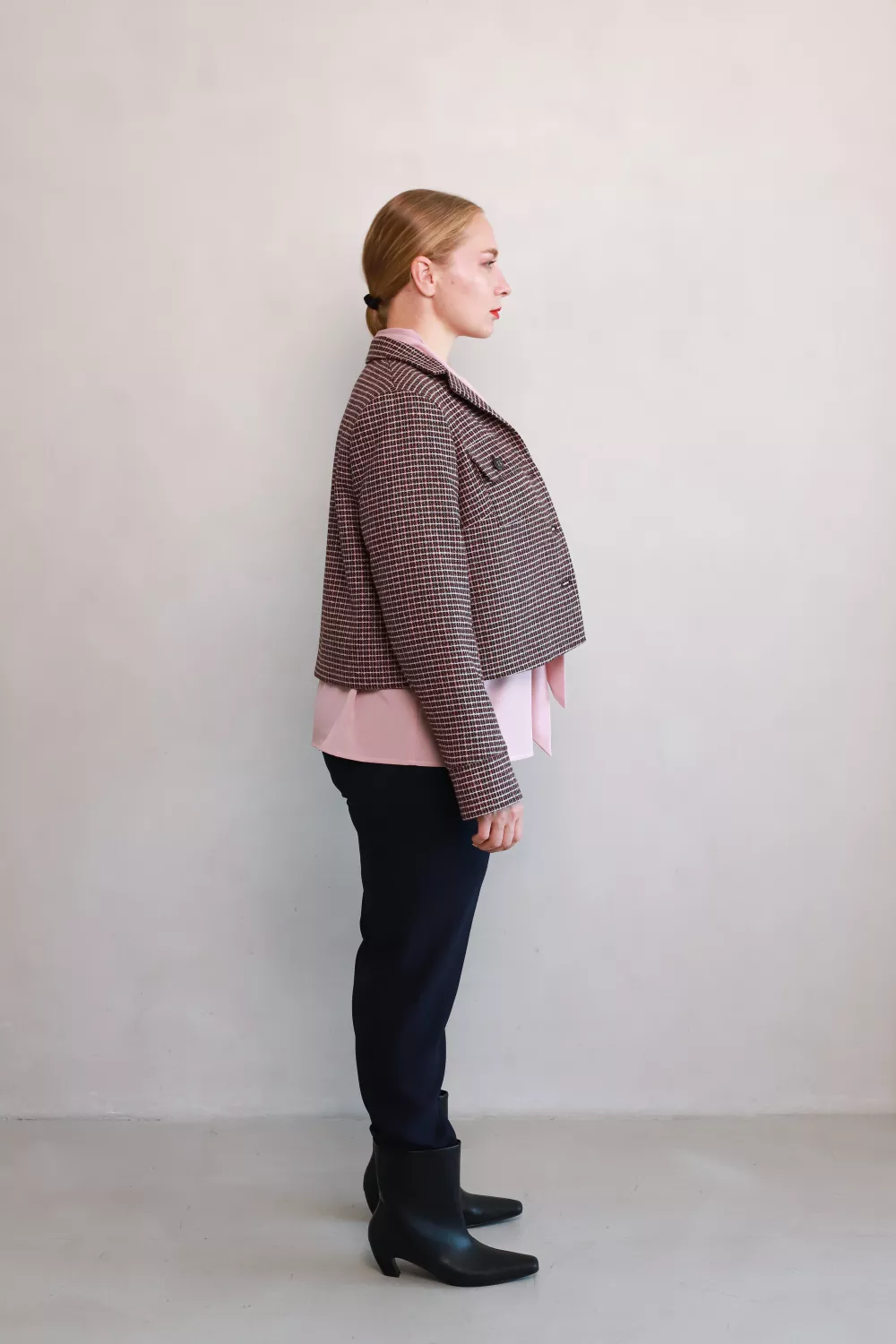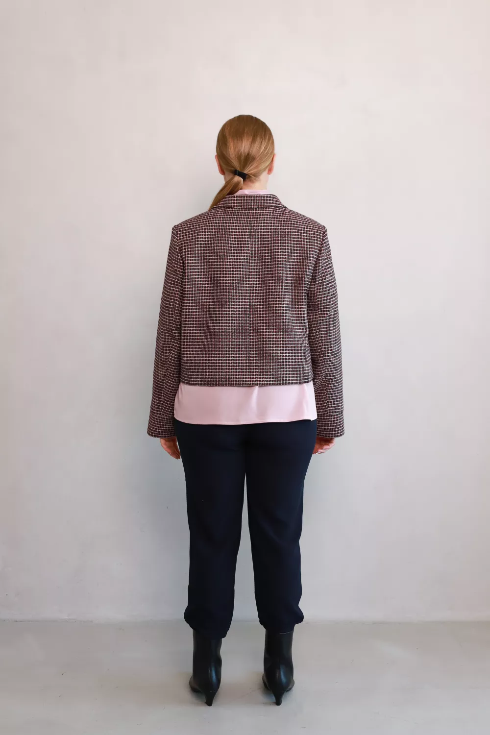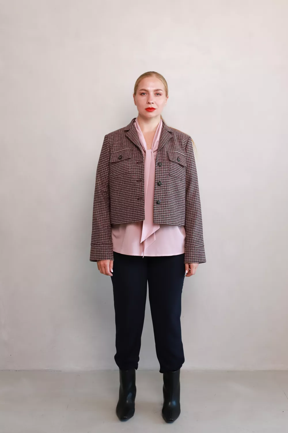 Сучасний жакет у класичну клітинку — стильний акцент, який поєднує елегантність і трендовий характер. Вкорочений силует додає легкості образу, а накладні кишені з ґудзиками створюють ефектний акцент.