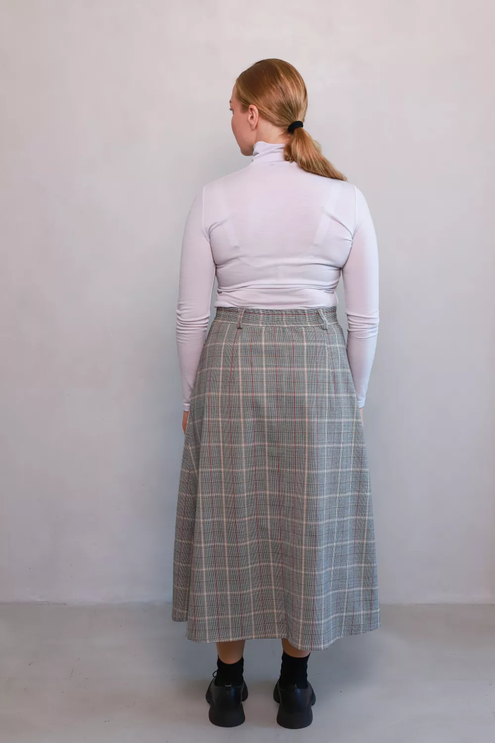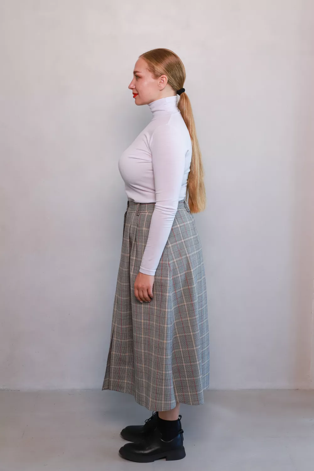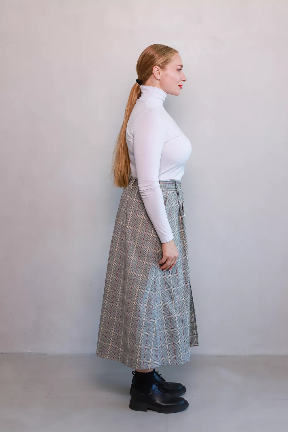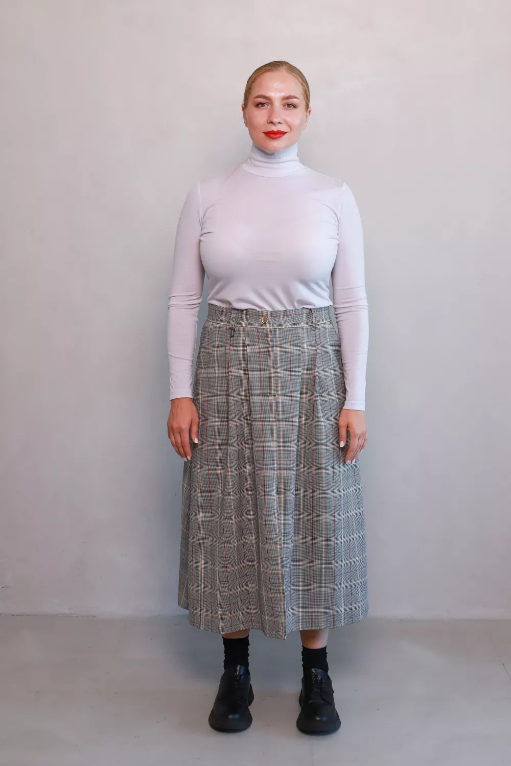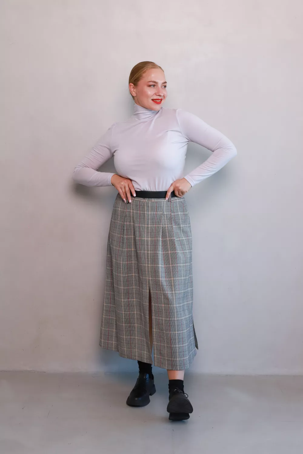 Втіли бажання створювати легкий, виразний образ із класичним шармом — спідниця Олдертон унікально поєднує тепло натуральної вовни та актуальний кльош-силует. Графічна клітинка з білими й червоними акцентами додає колориту, а розріз створює підкреслену елегантність і свободу руху.
