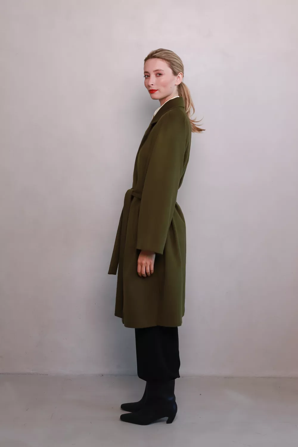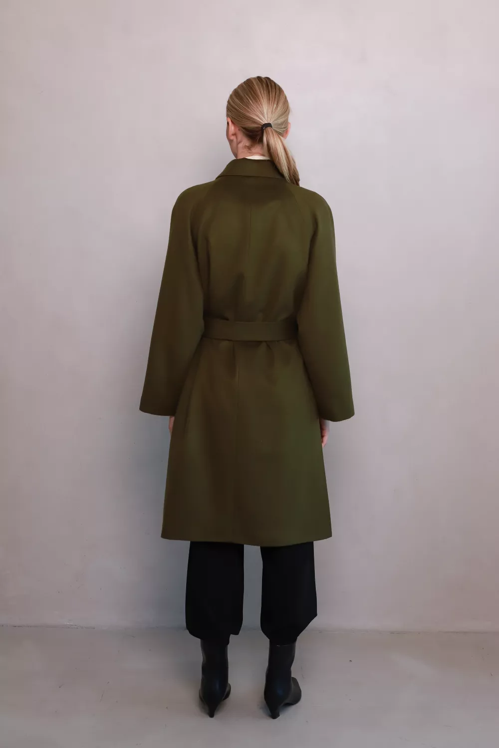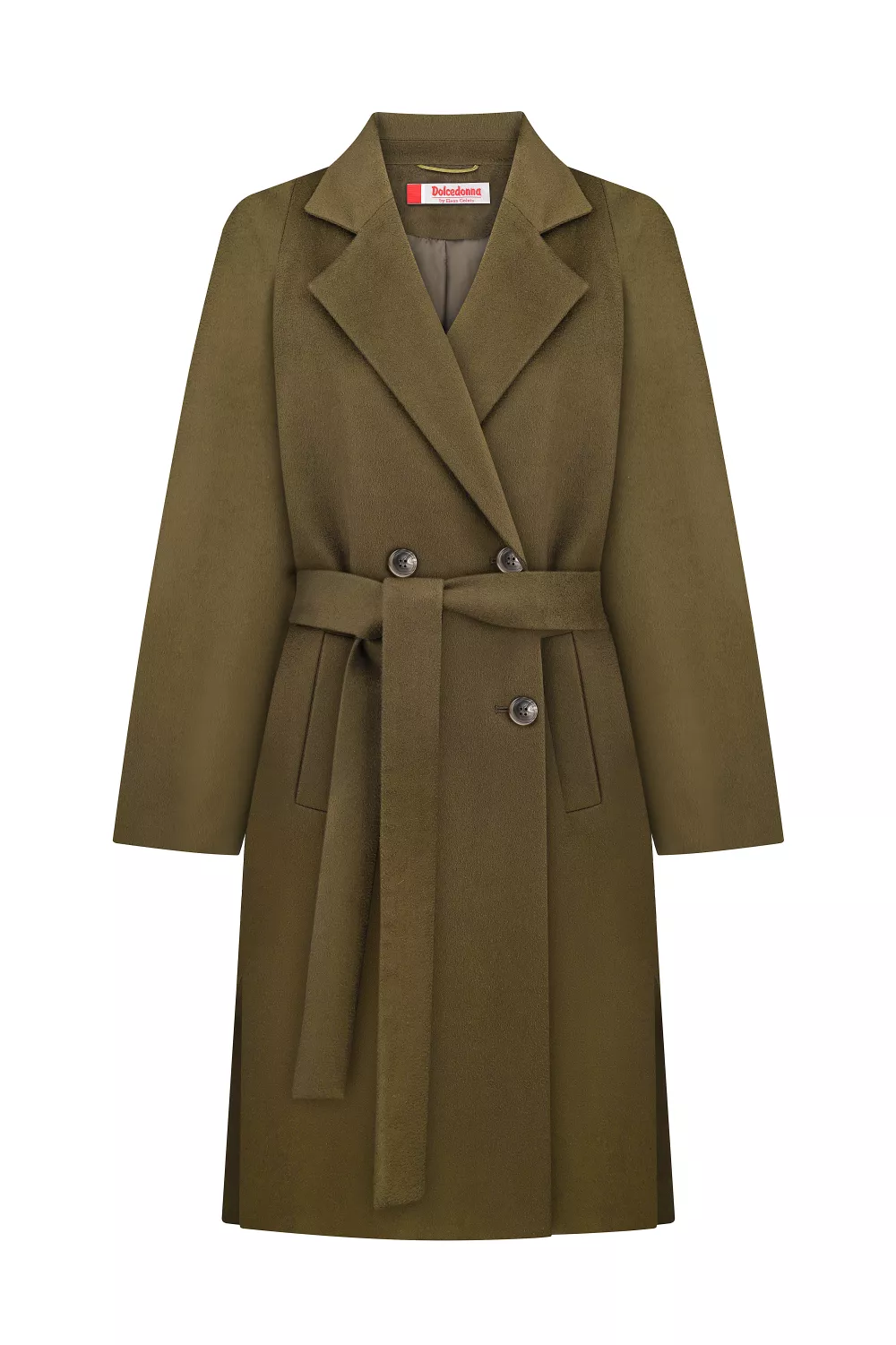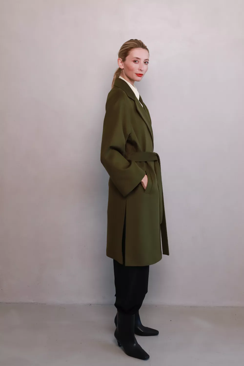 Вовняне пальто халатного покрою під пояс міді довжини в кольорі хакі Аліканте