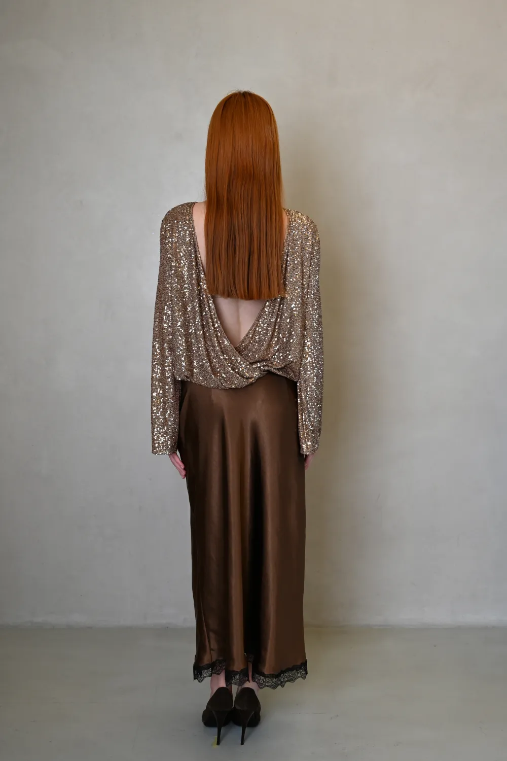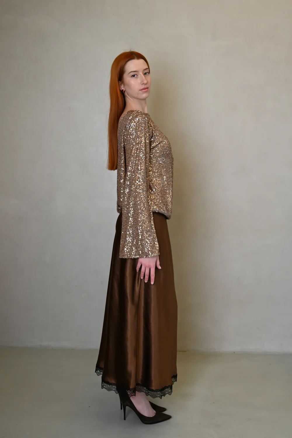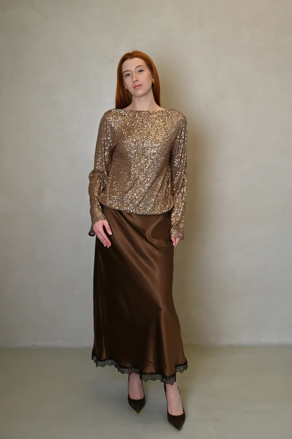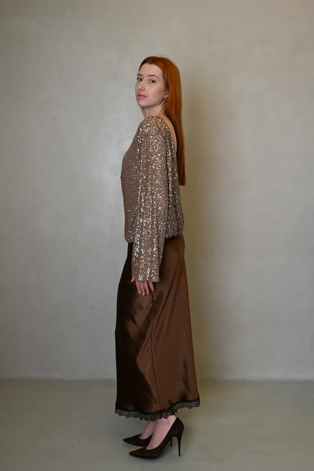 Спідниця Еббі — це витончене поєднання жіночності, трендової текстури та делікатної деталі. Шовковистий атлас, глибокий коричневий відтінок і контрастне мереживо створюють образ, який виглядає дорого та актуально у будь-якому сезоні.