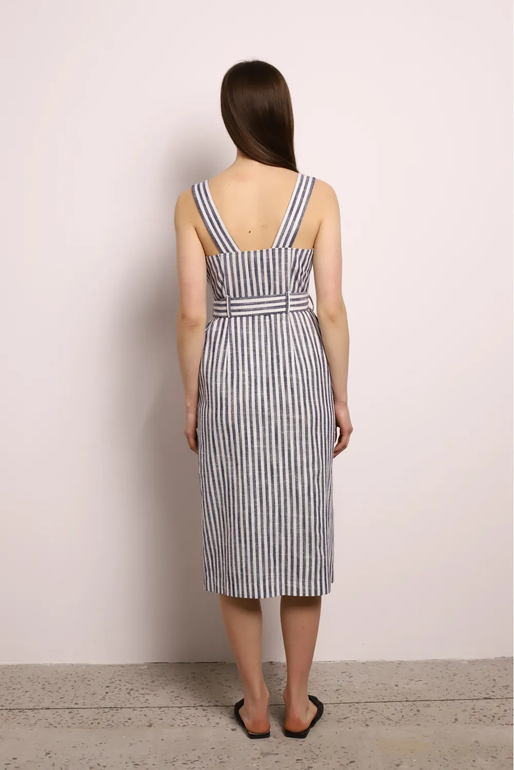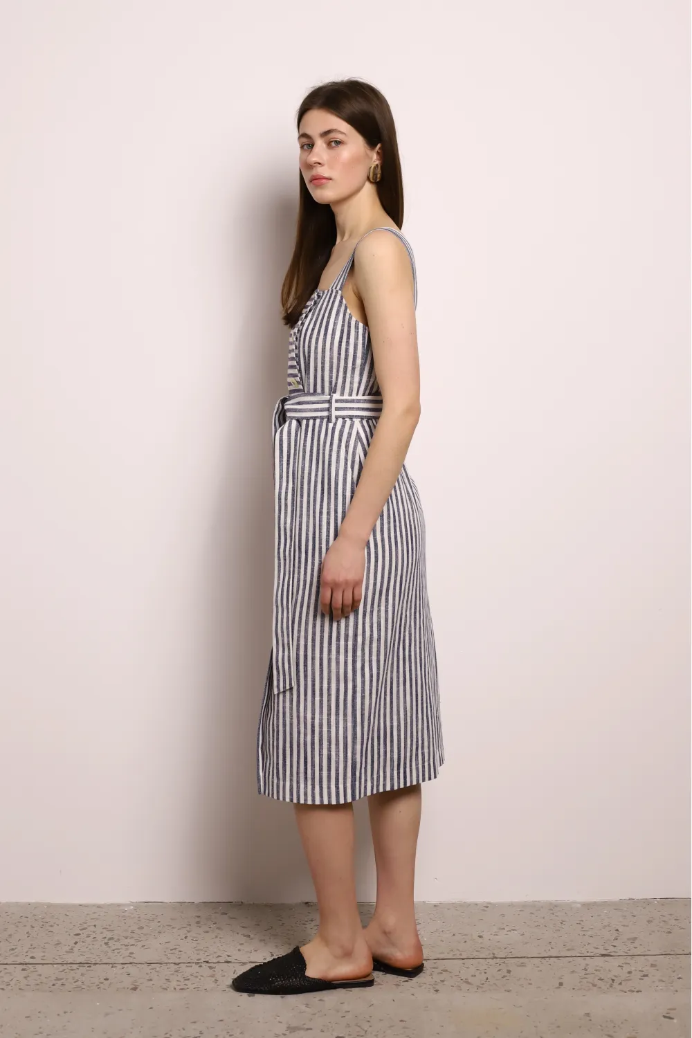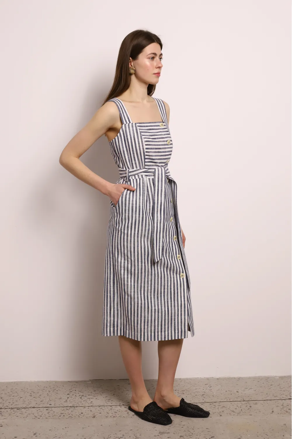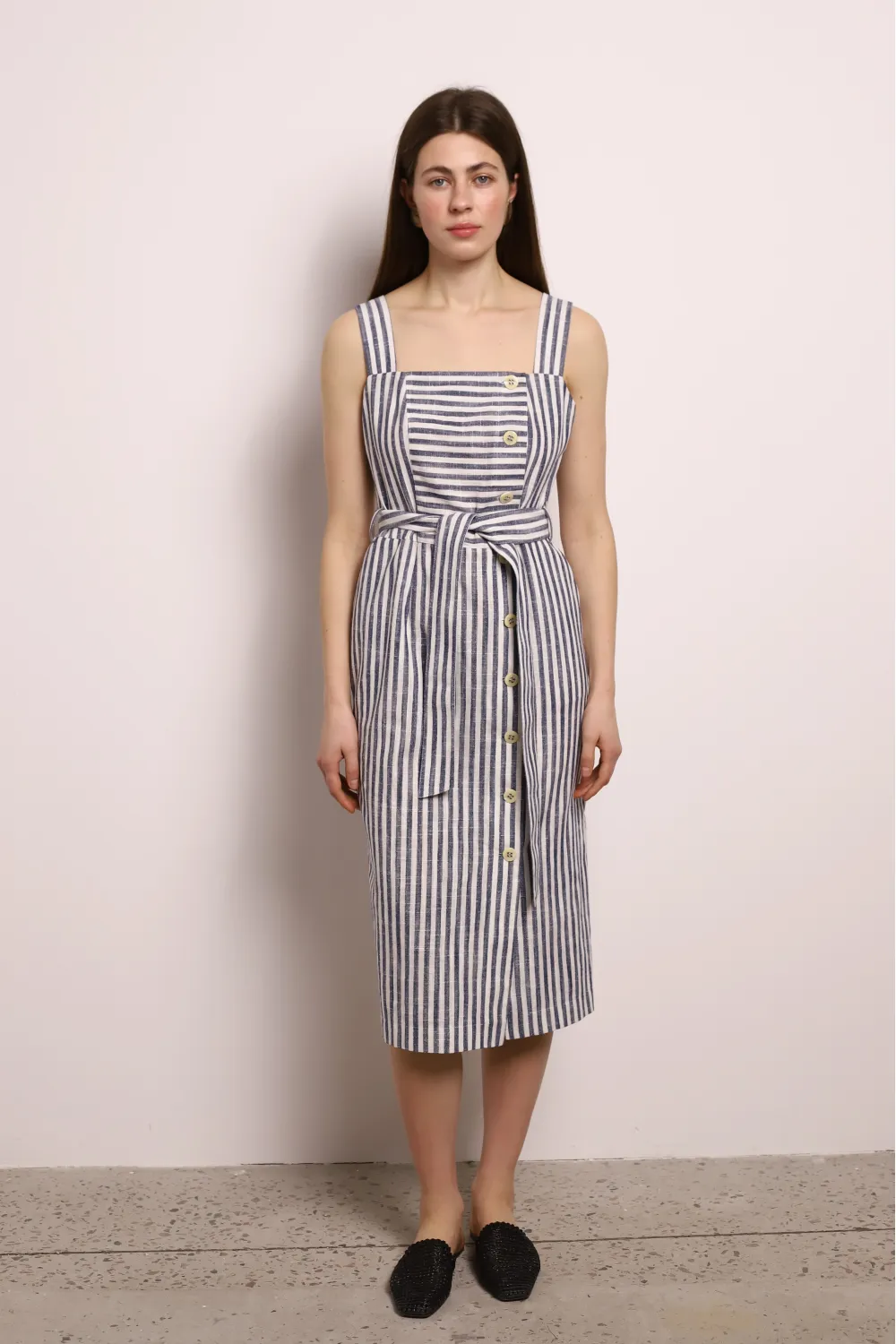 Модель приталеного силуету на широких бретелях доповнена функціональною застібкою на ґудзики спереду та поясом-зав'язкою, що акцентує увагу на талії. Лаконічний дизайн та натуральна фактура тканини роблять його універсальним рішенням як для міста, так і для відпочинку.