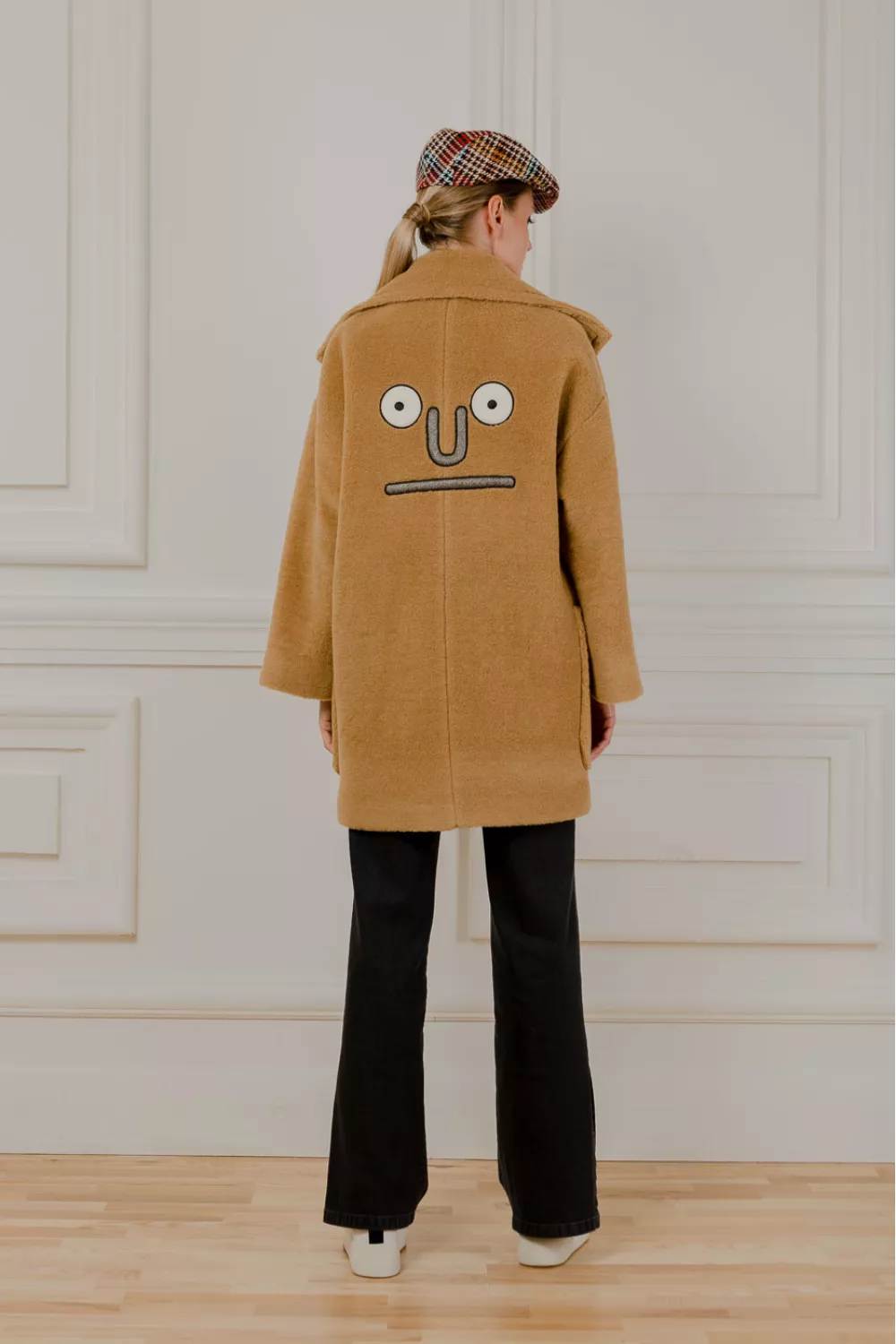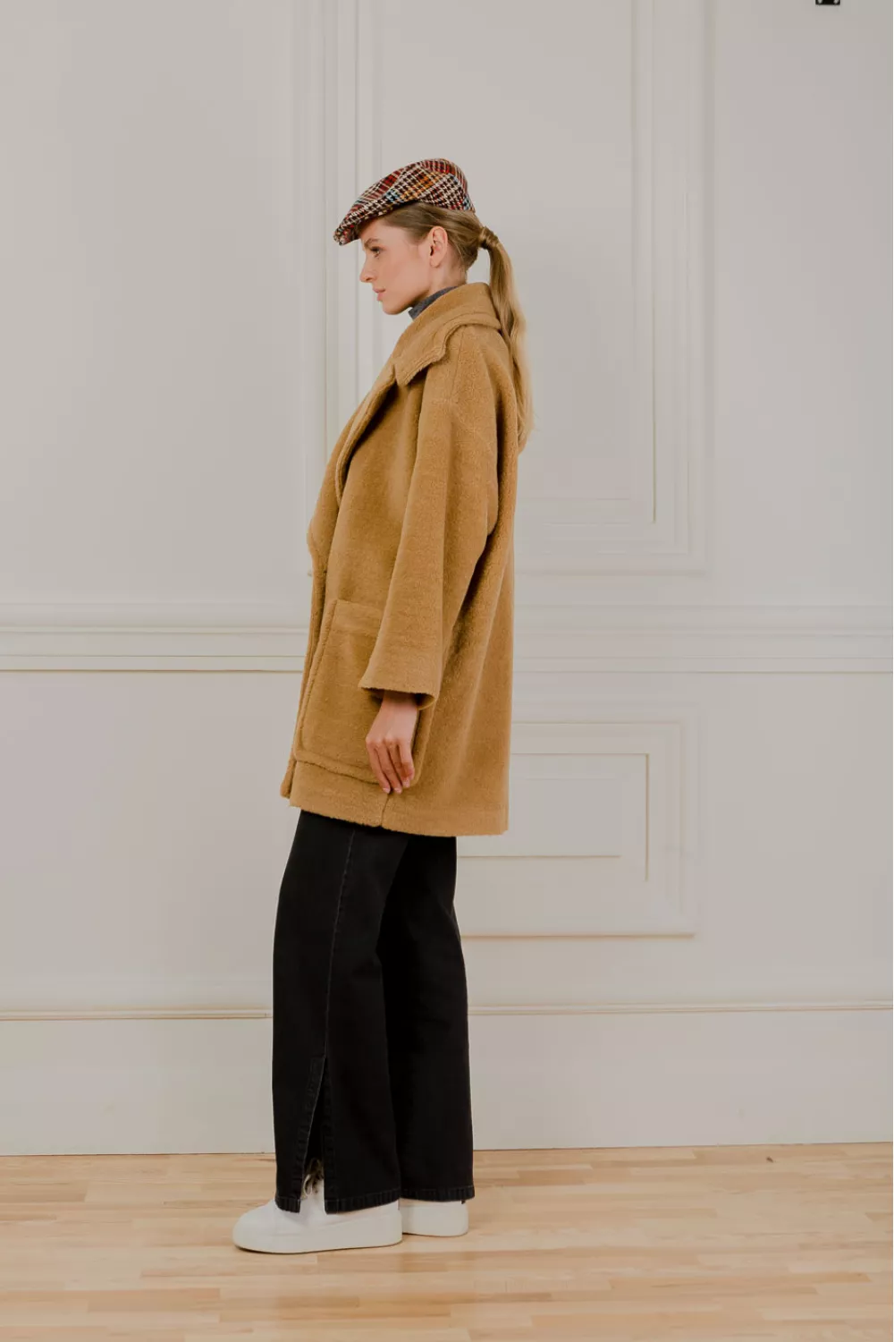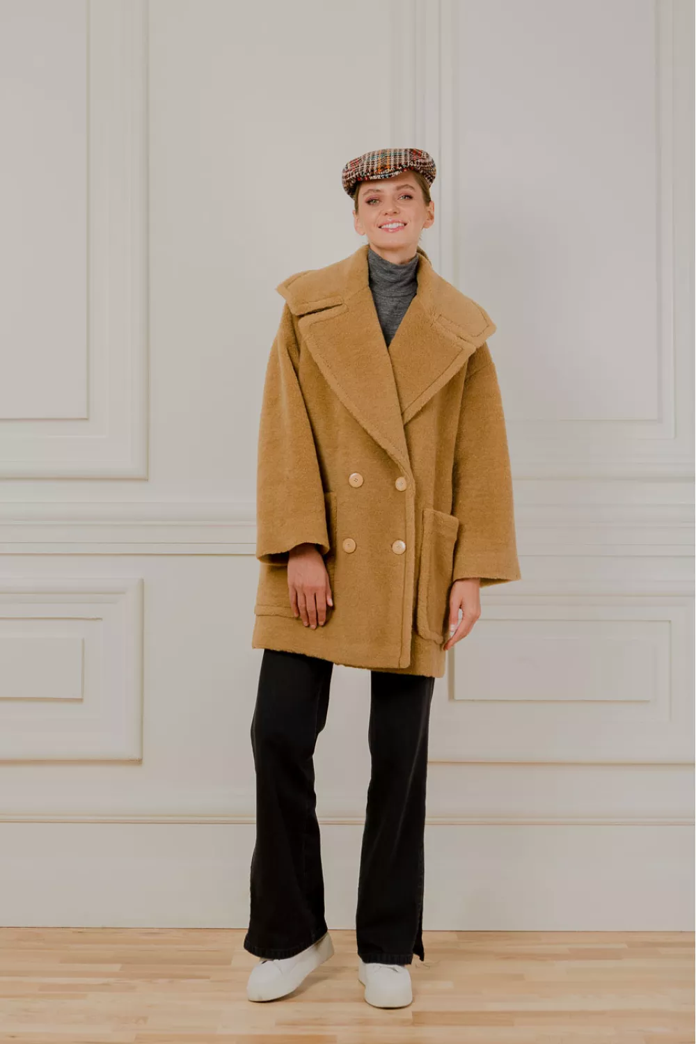 A stylish coat in the style of a teddy bear made of wool. The model has an expressive wide gate and large patch pockets, so it will be not only warm, but also comfortable