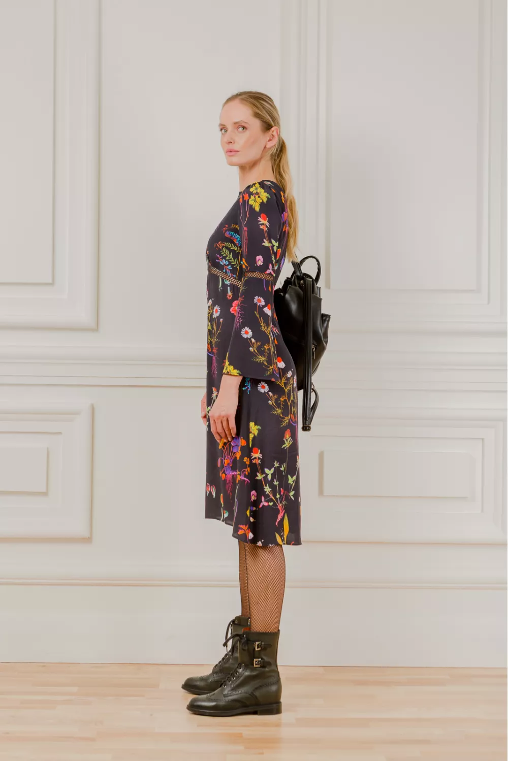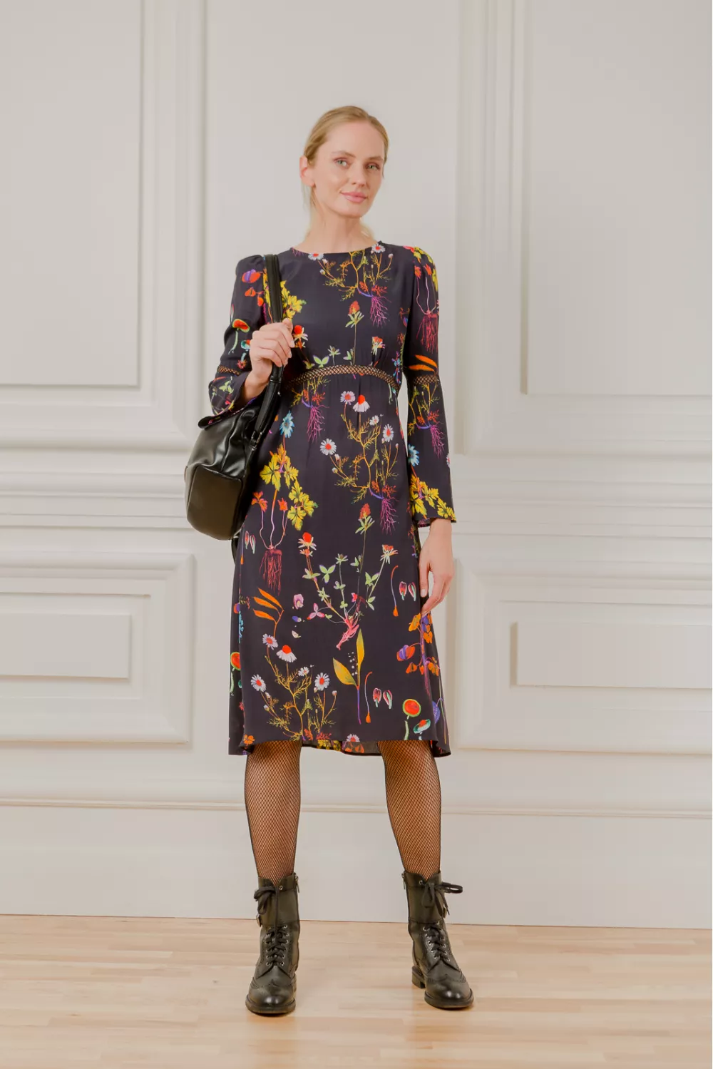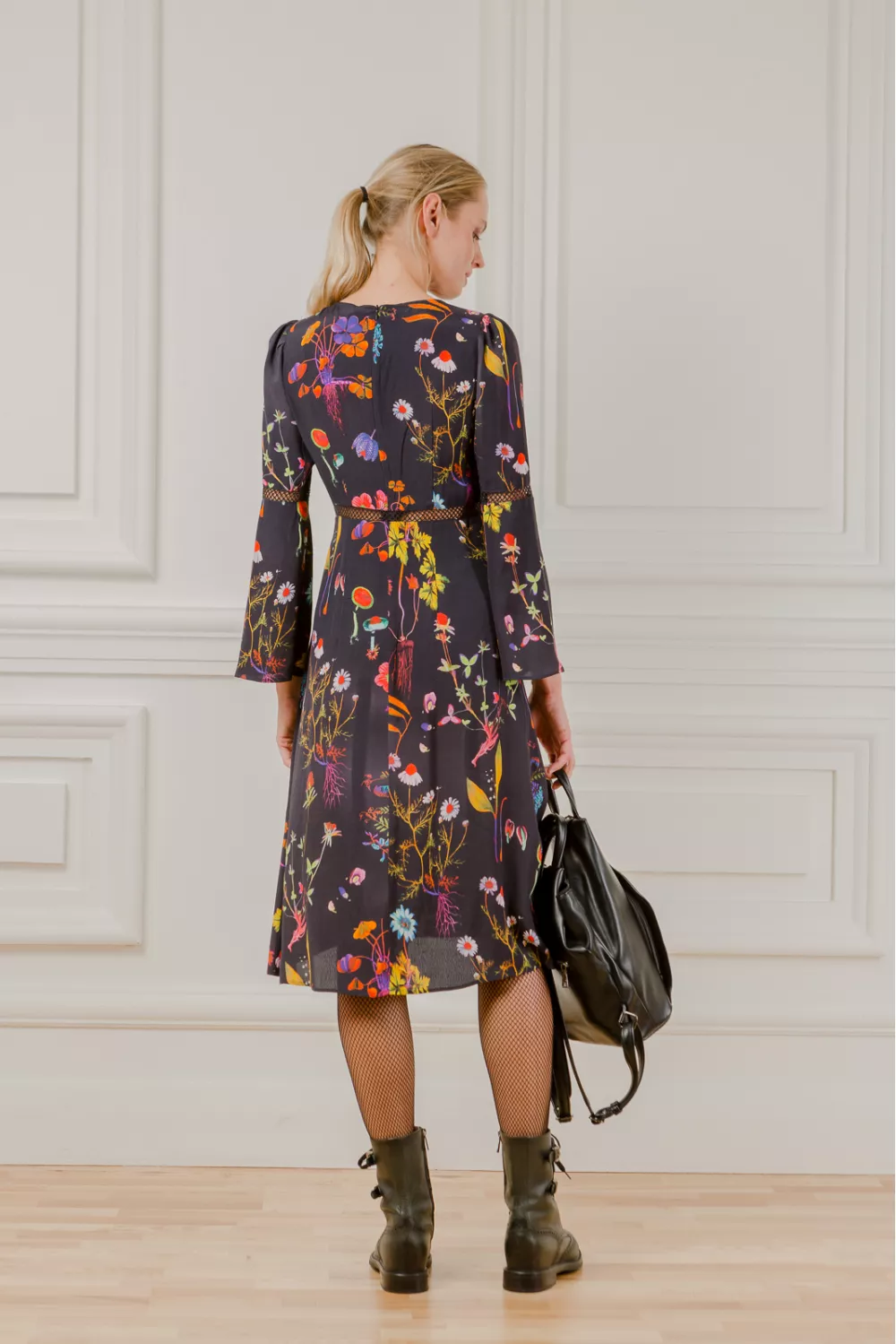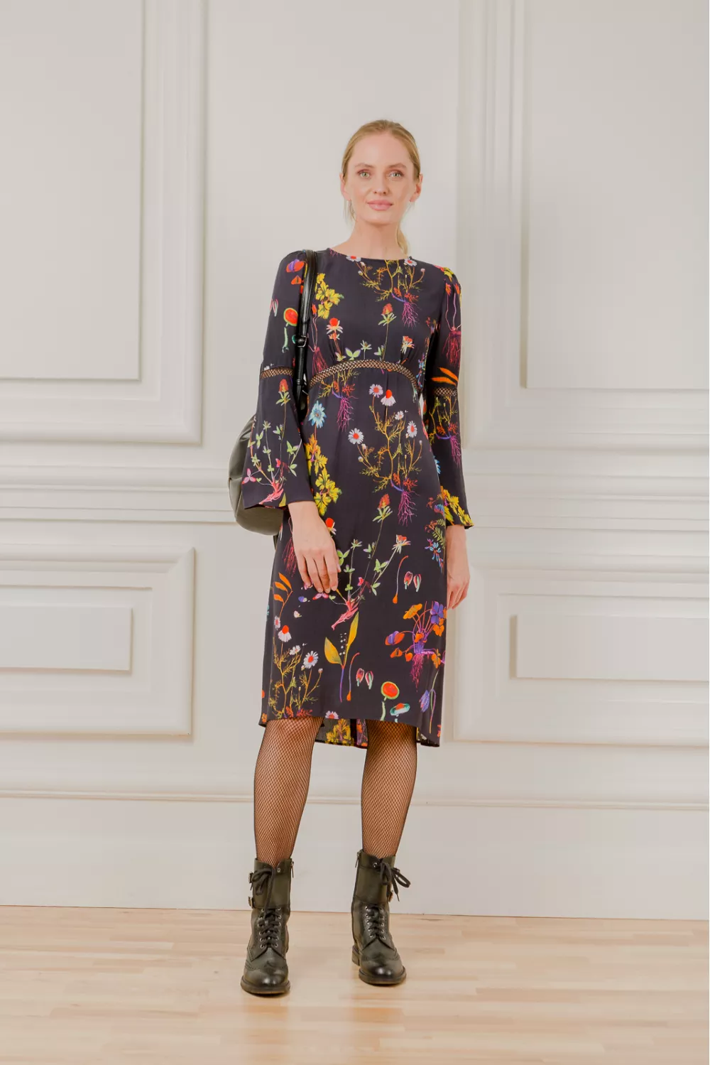 Youth midi dress in floral print has flared sleeves and mesh cuts, which add a special charm