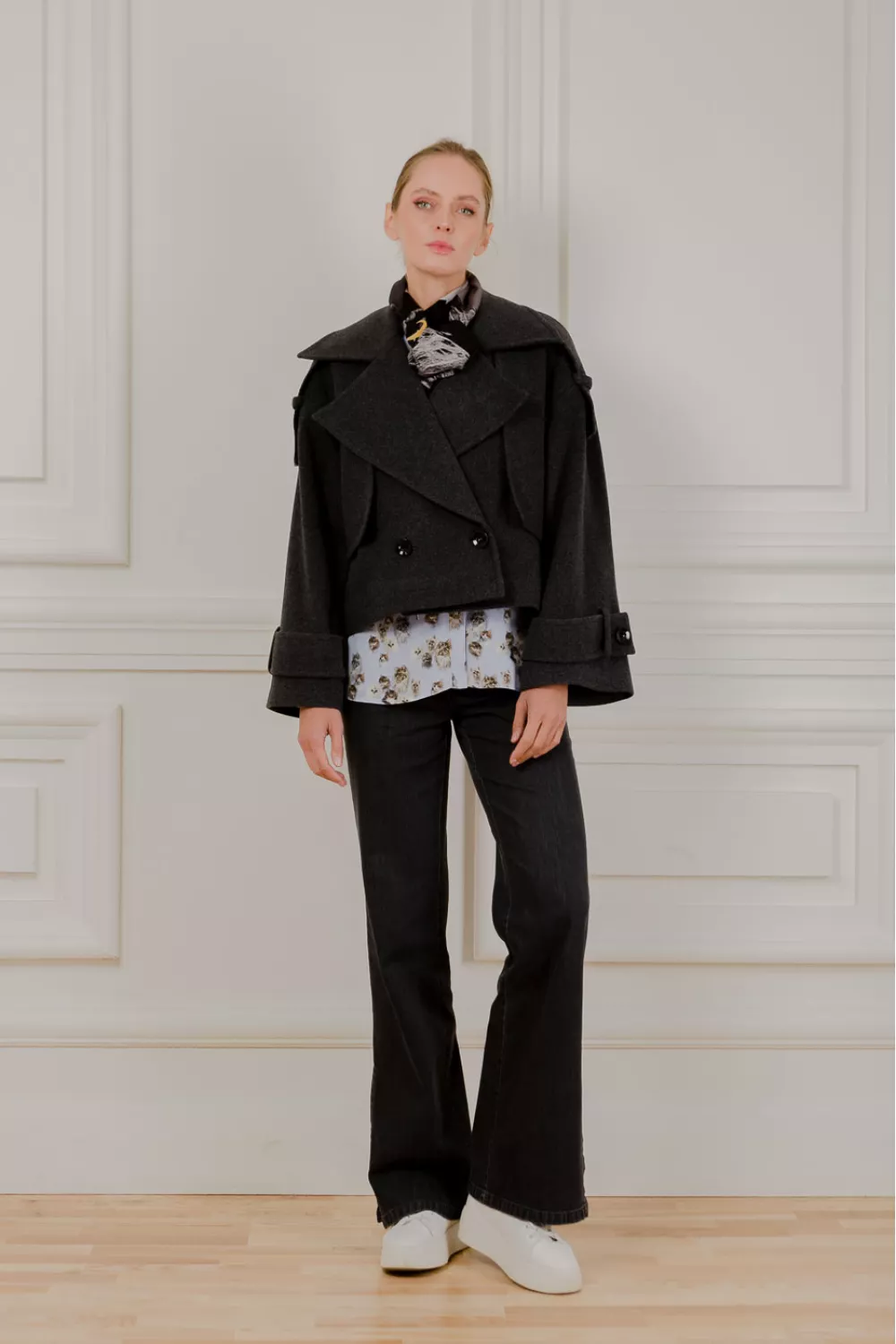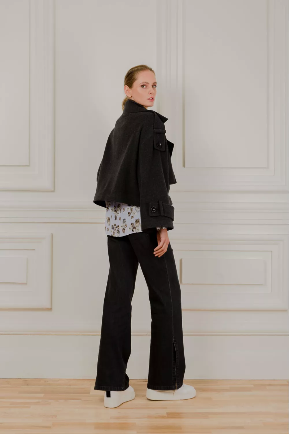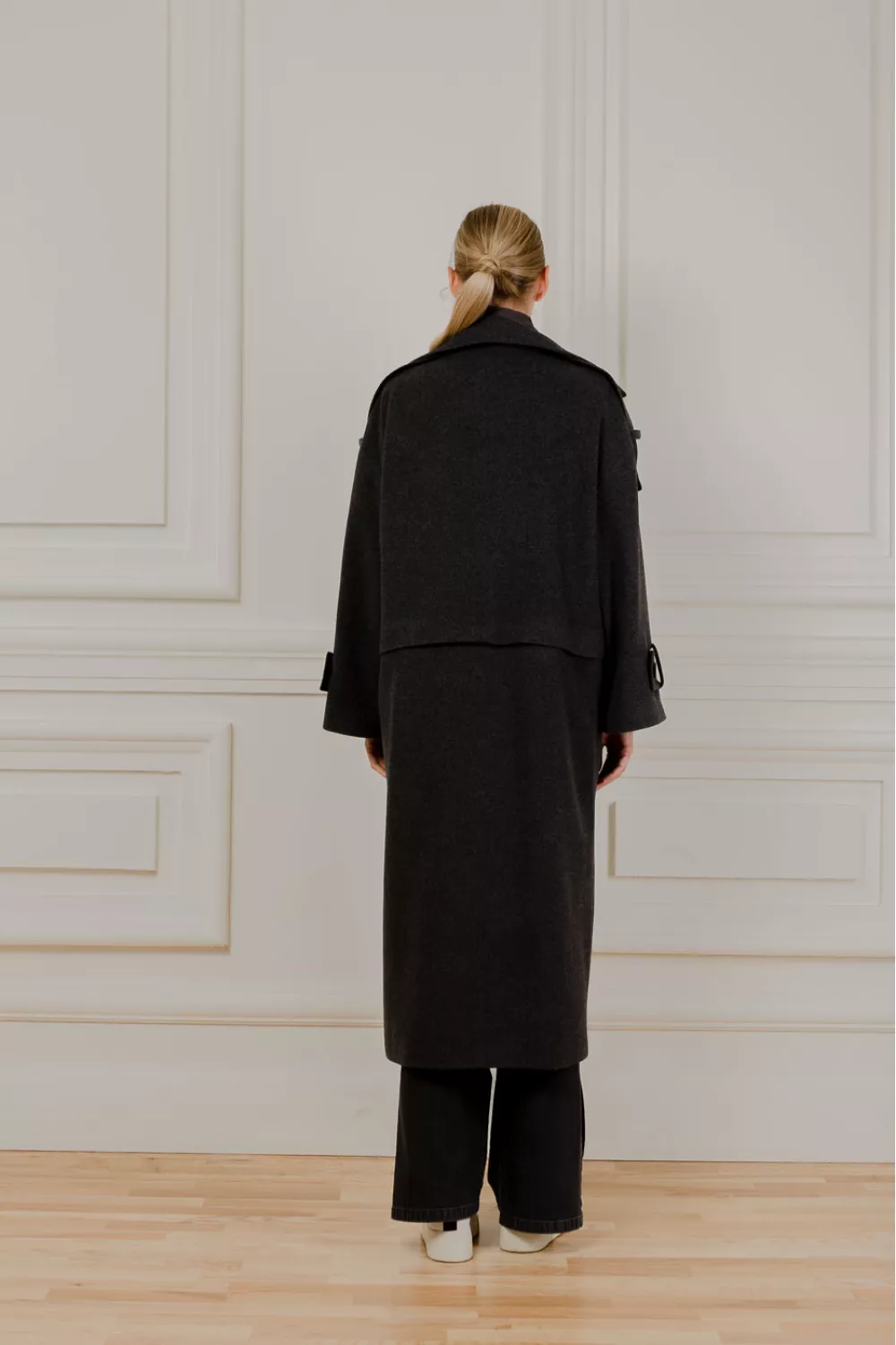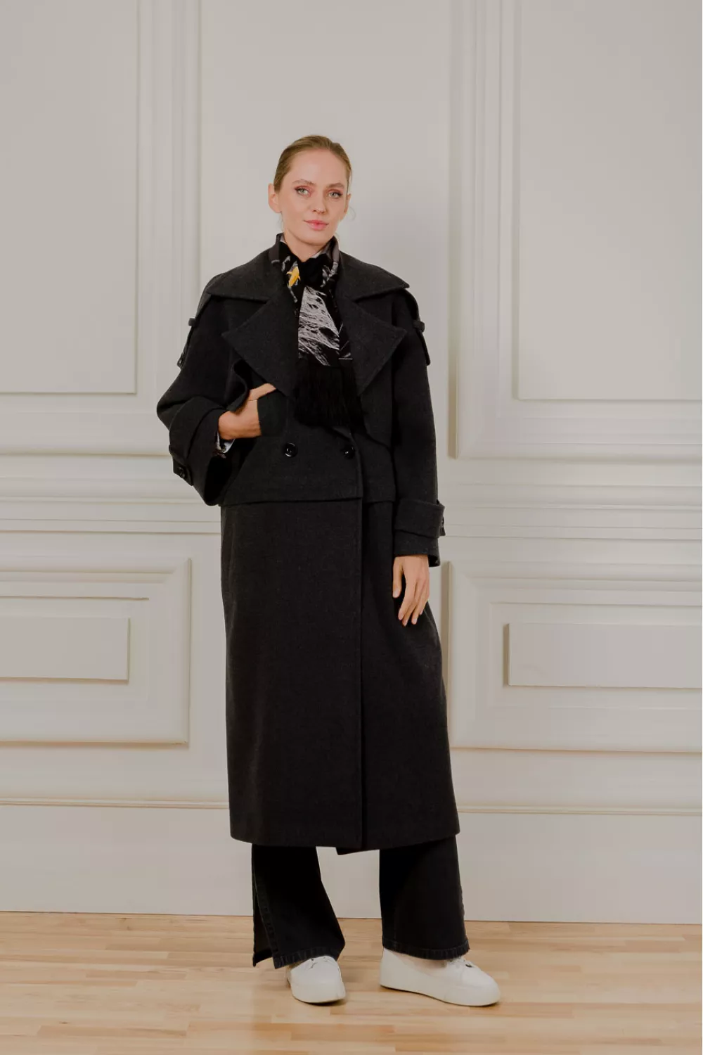A long, oversized woolen coat can easily be converted into a short version for warmer weather with the help of a zipper. The model itself is stylized with hidden pockets and additional parts on the sleeves