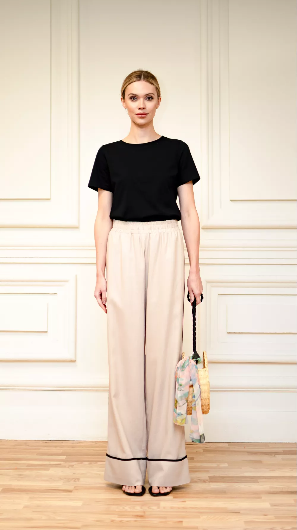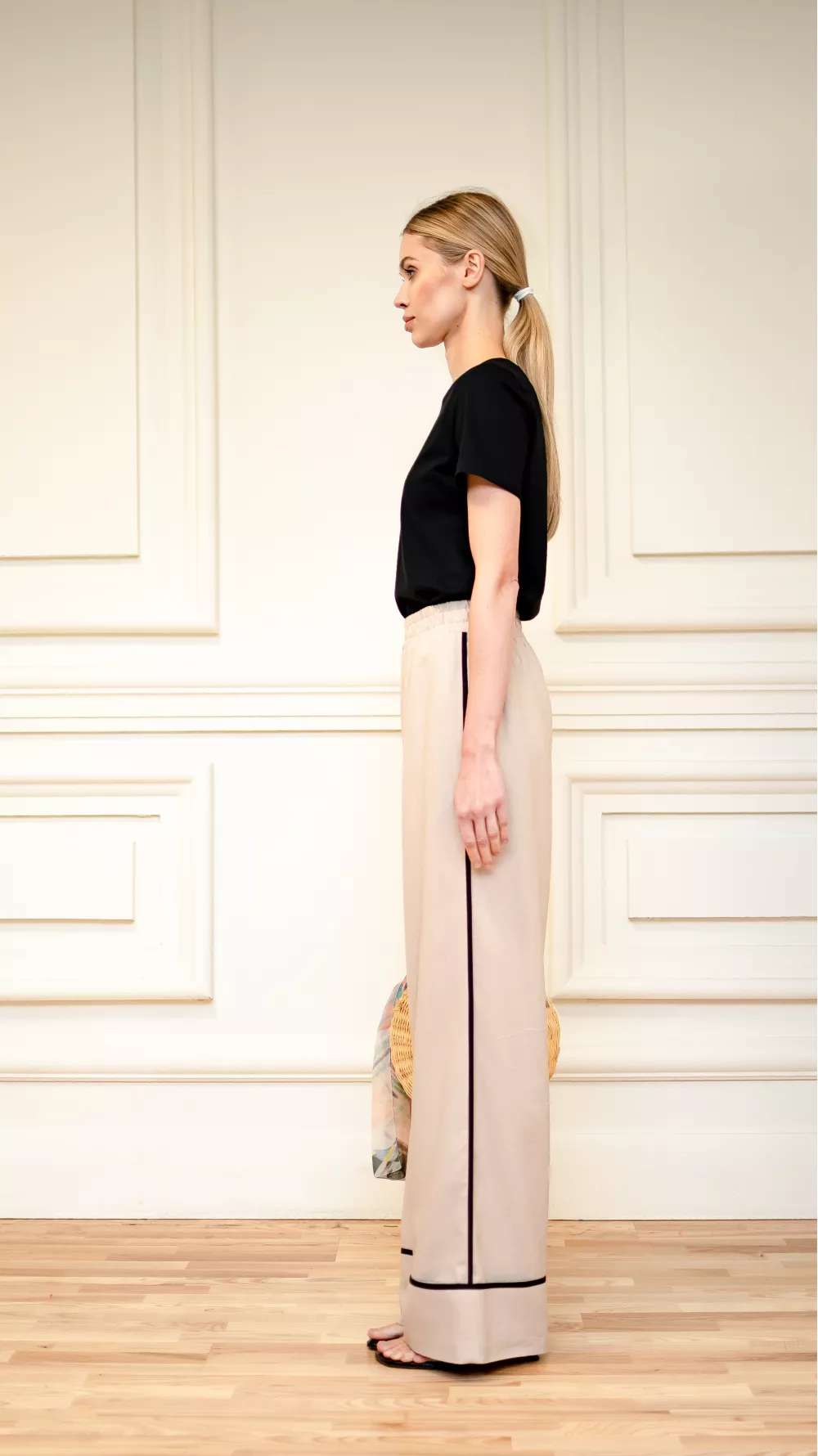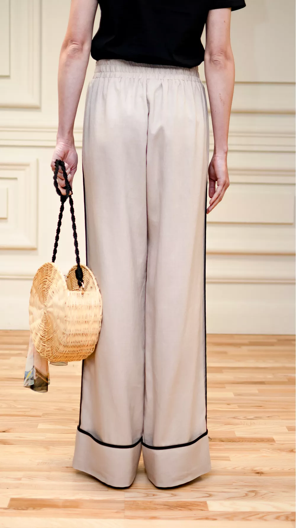 Wide elasticated trousers with side sewn pockets and a wide cuff, which is decorated with black edging. Perfect for sandals and low-cut summer shoes