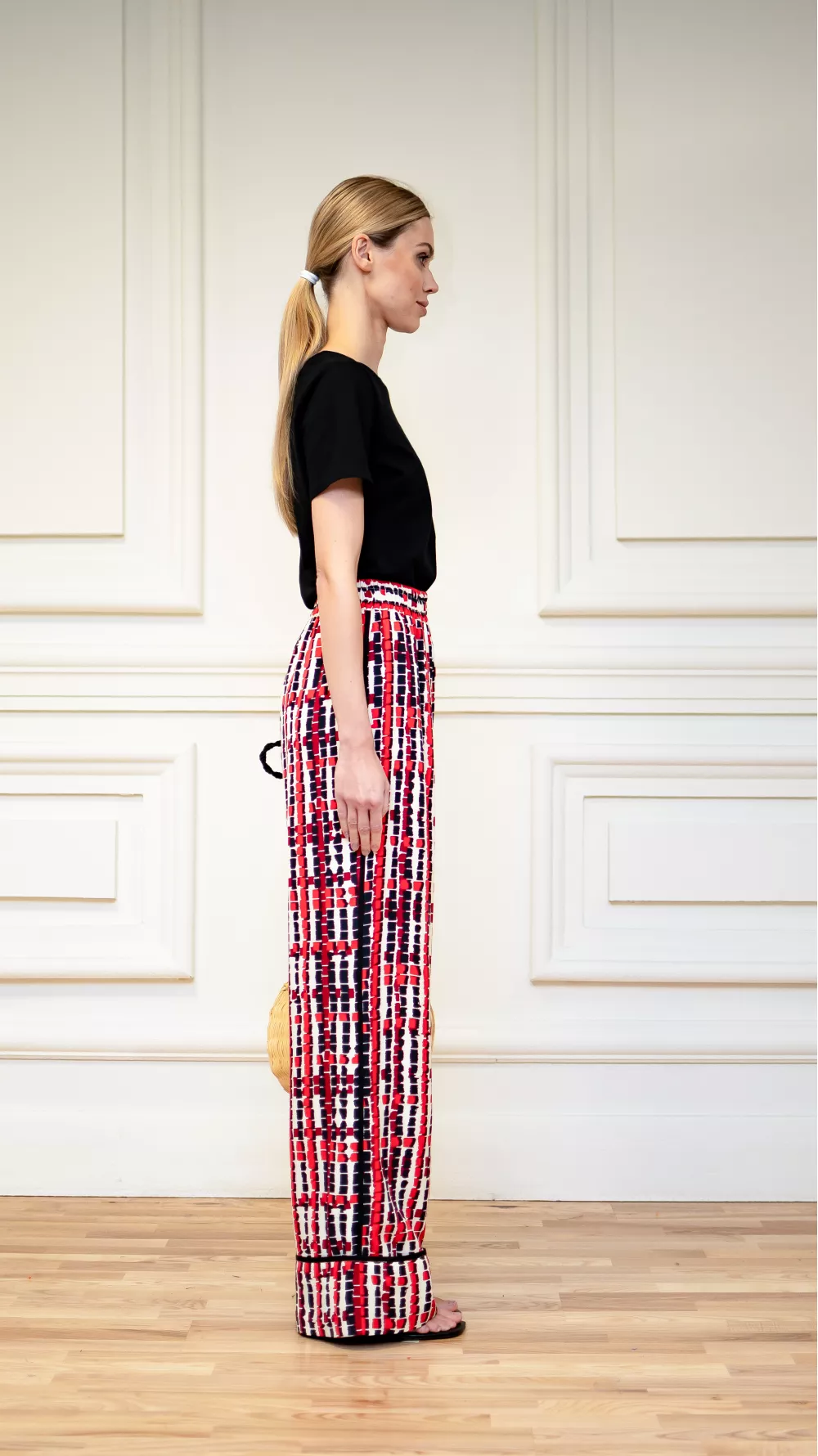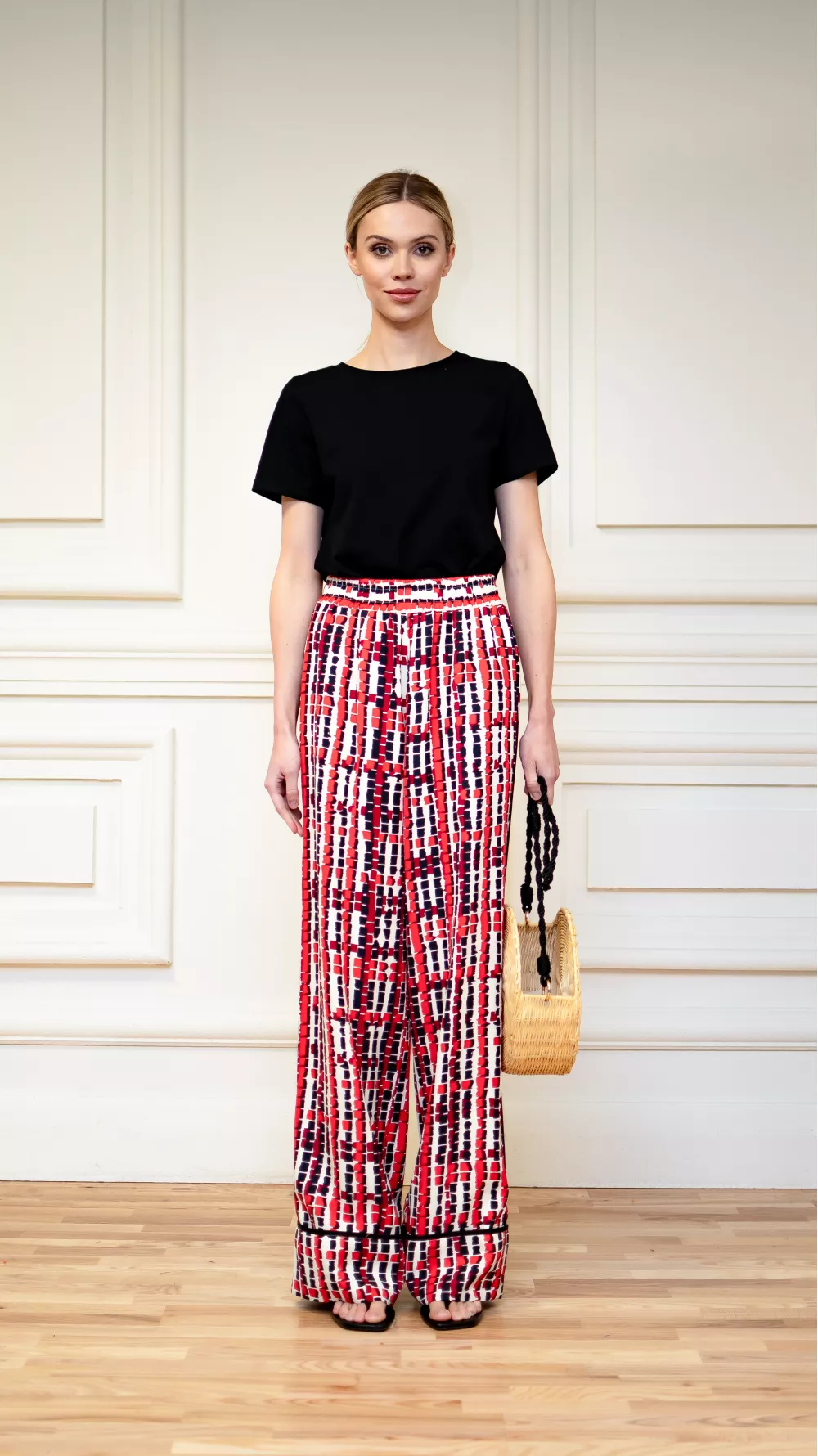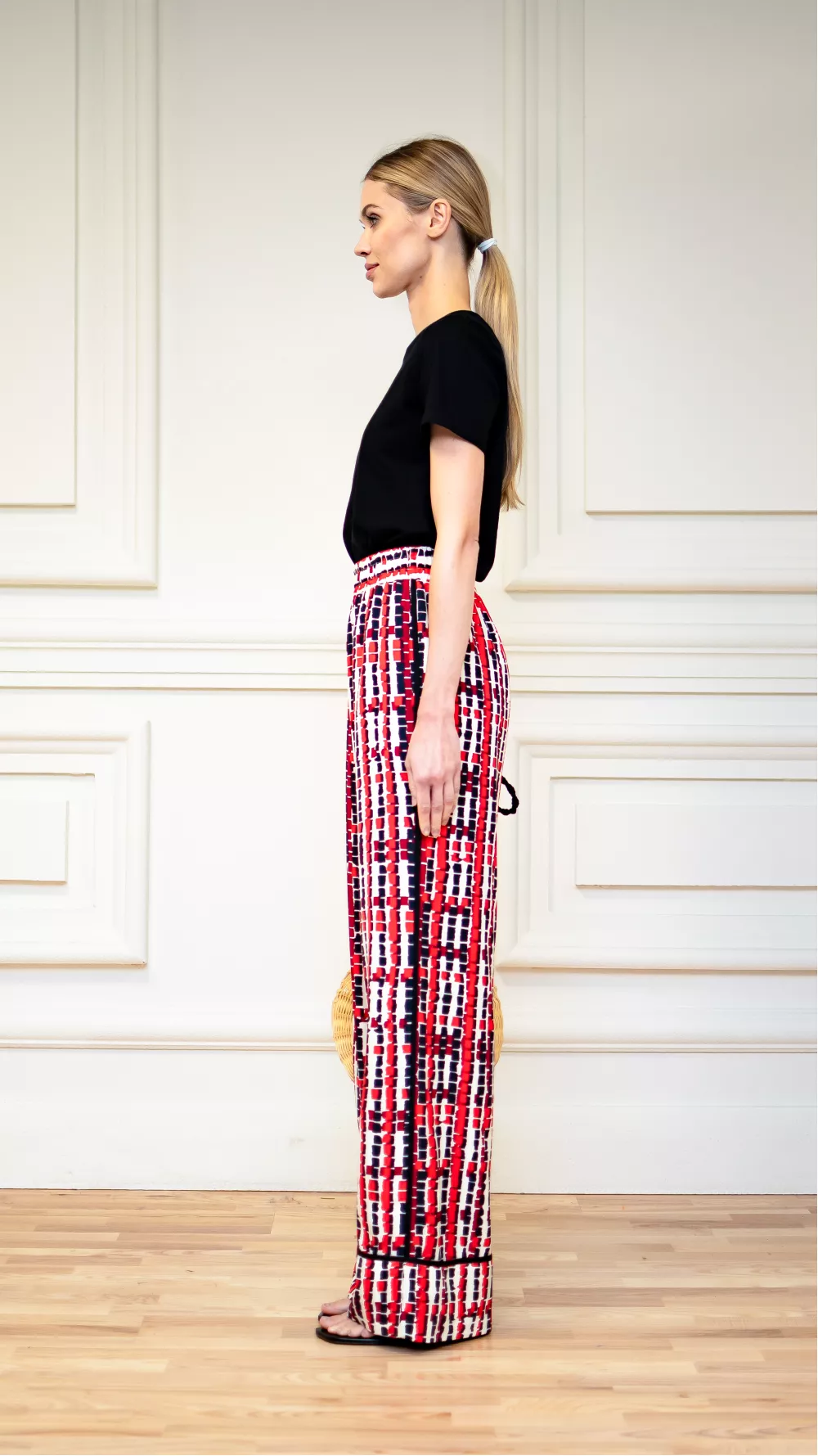 Wide elasticated trousers with side sewn pockets and a wide cuff, which is decorated with black edging. Perfect for sandals and low-cut summer shoes