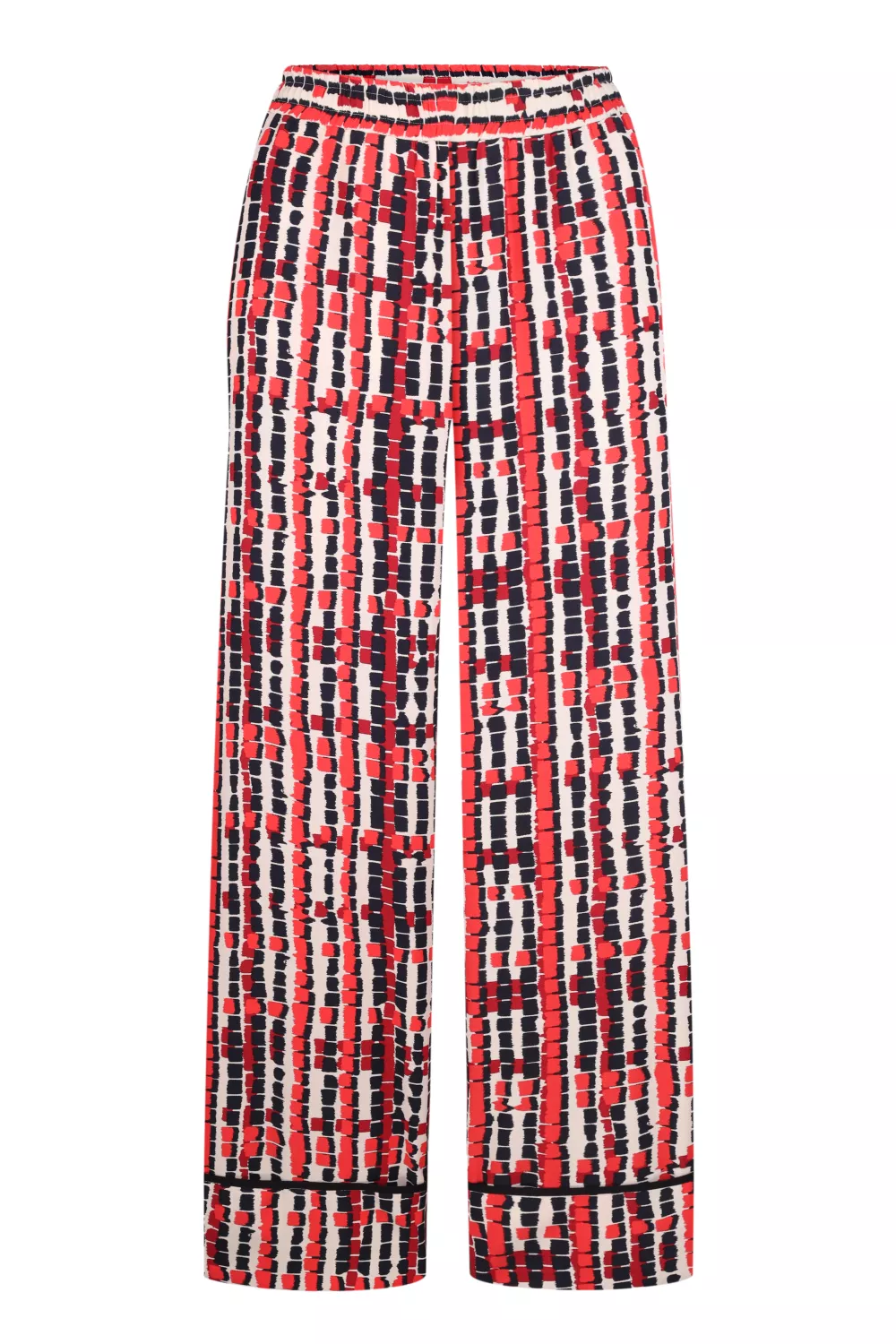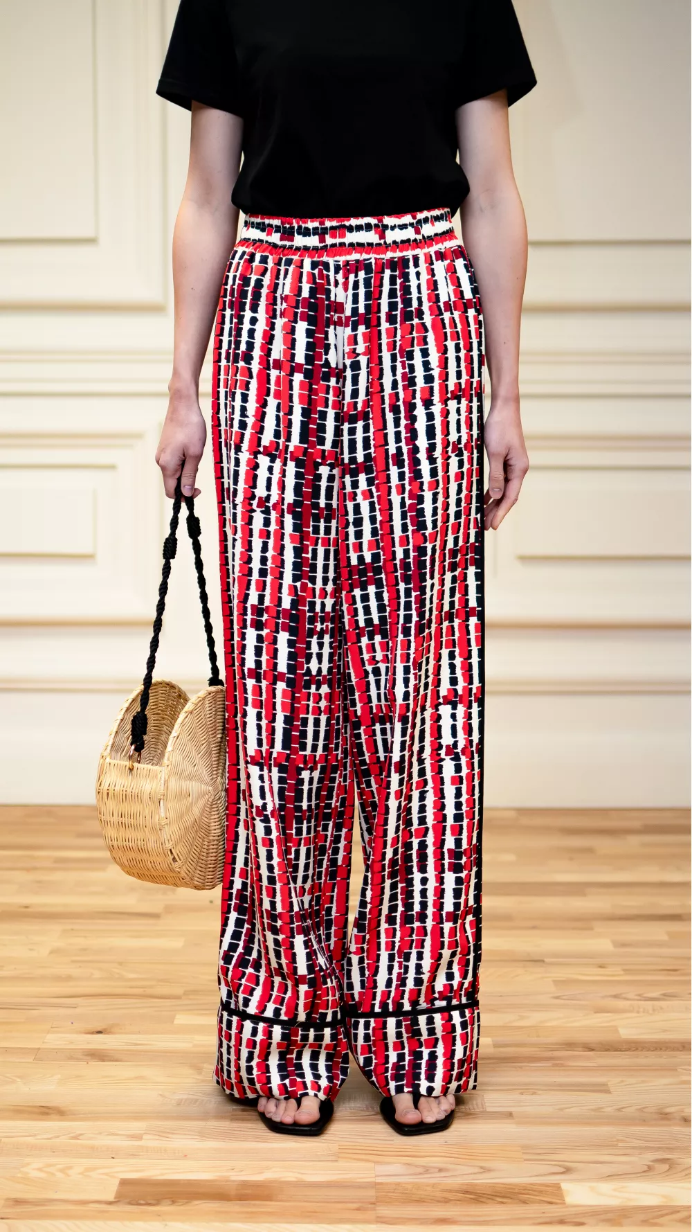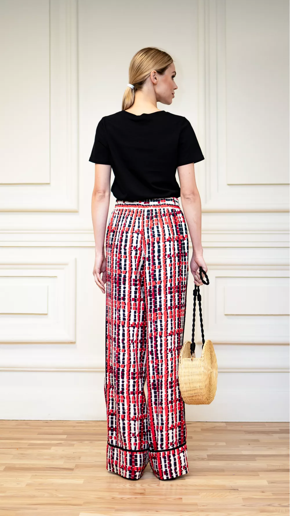 Wide elasticated trousers with side sewn pockets and a wide cuff, which is decorated with black edging. Perfect for sandals and low-cut summer shoes