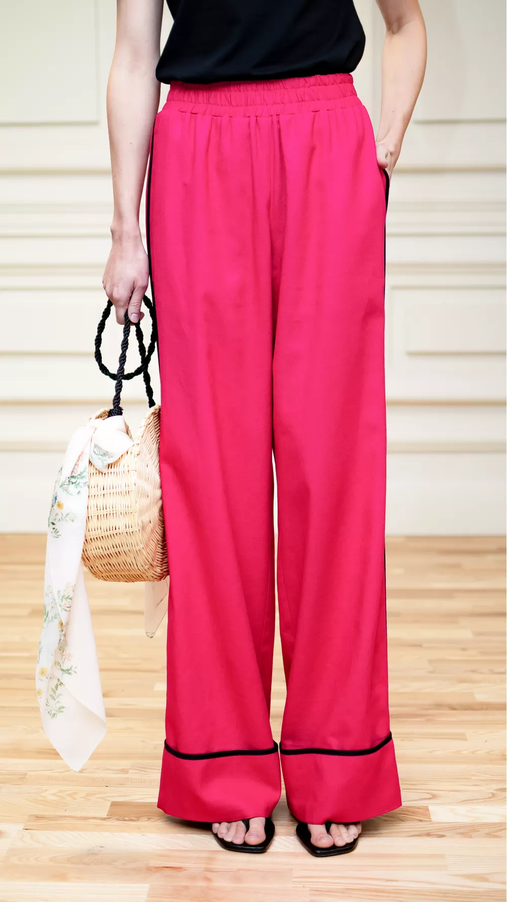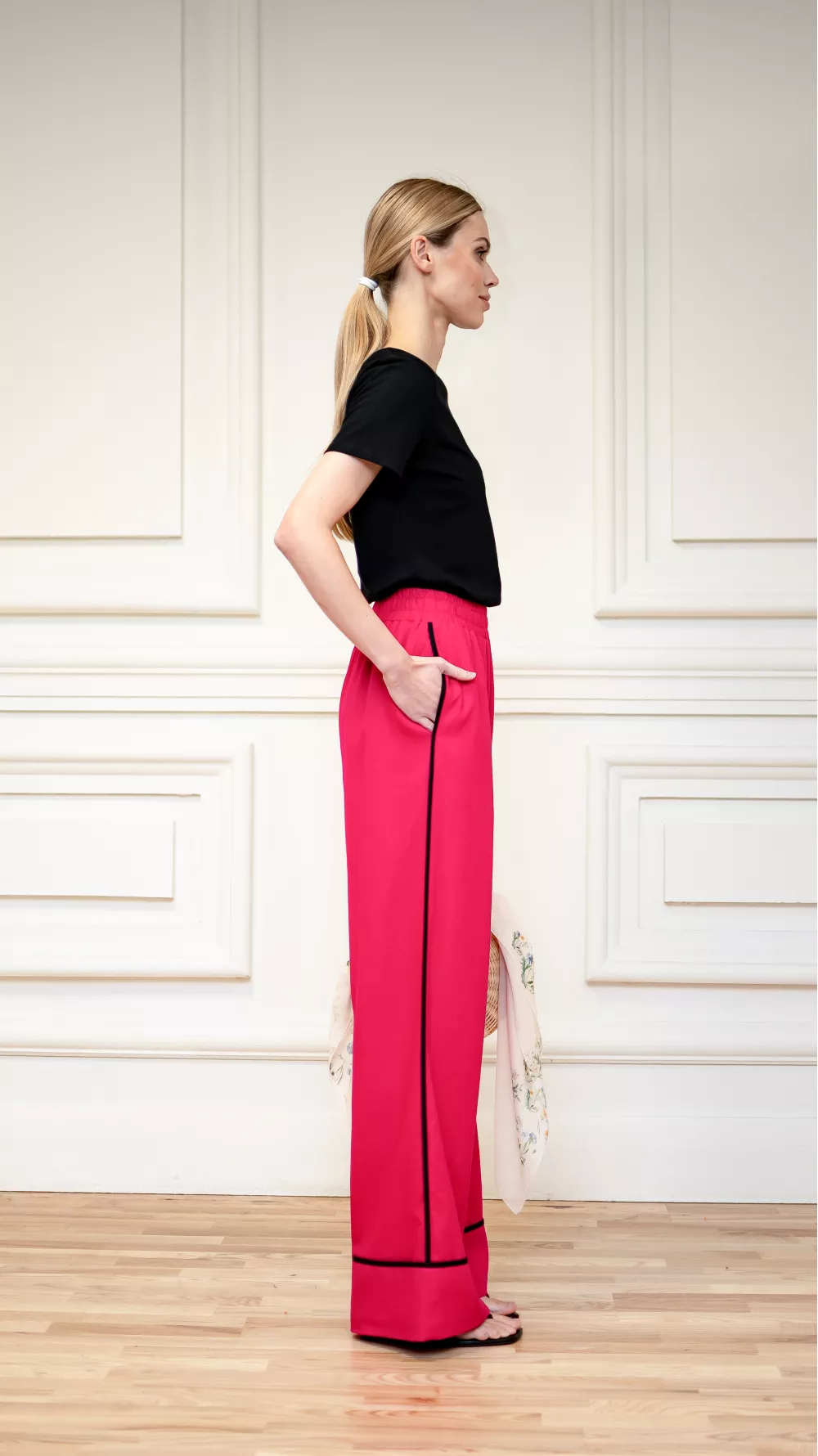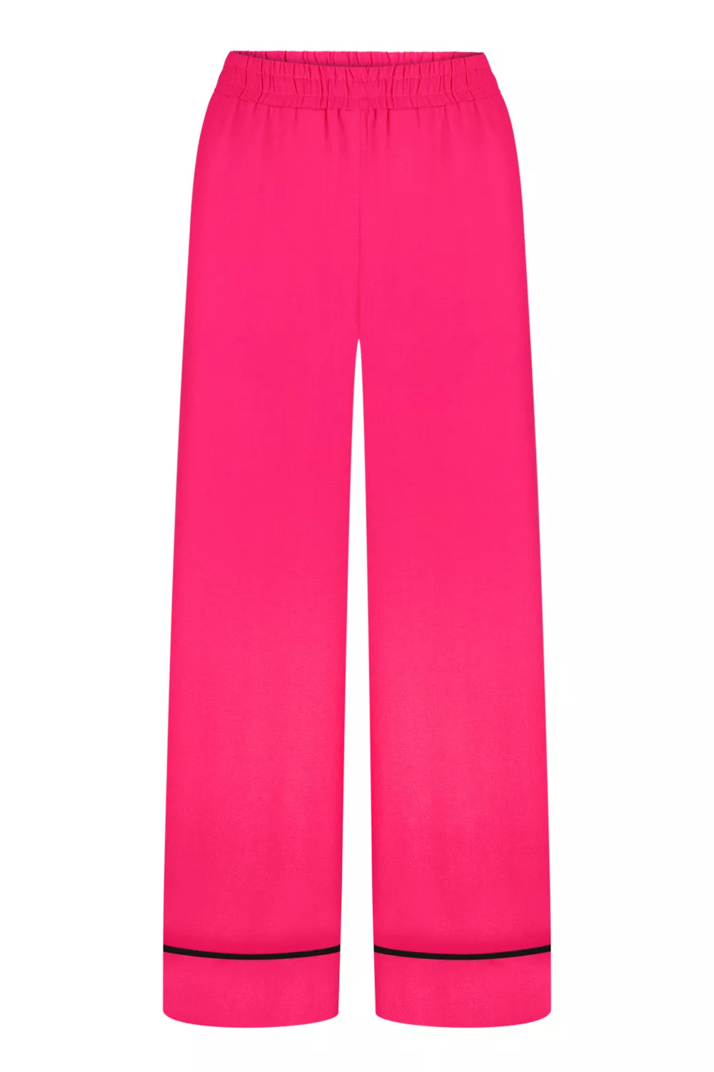 Wide elasticated trousers with side sewn pockets and a wide cuff, which is decorated with black edging. Perfect for sandals and low-cut summer shoes