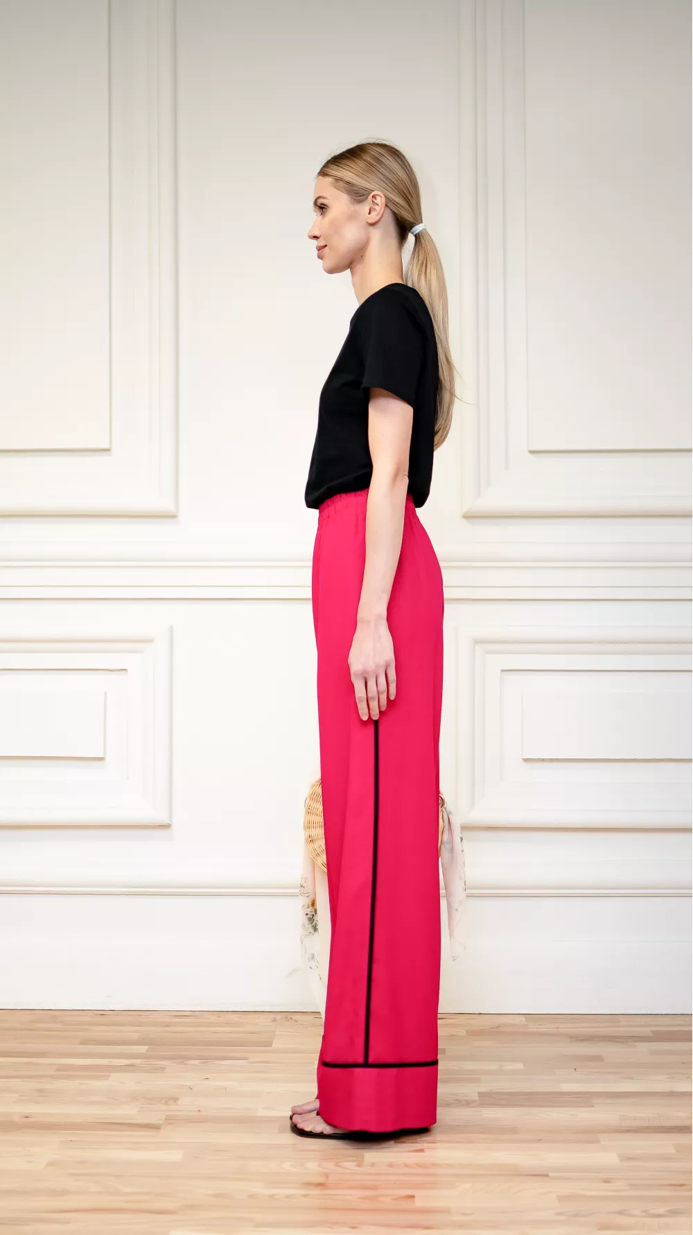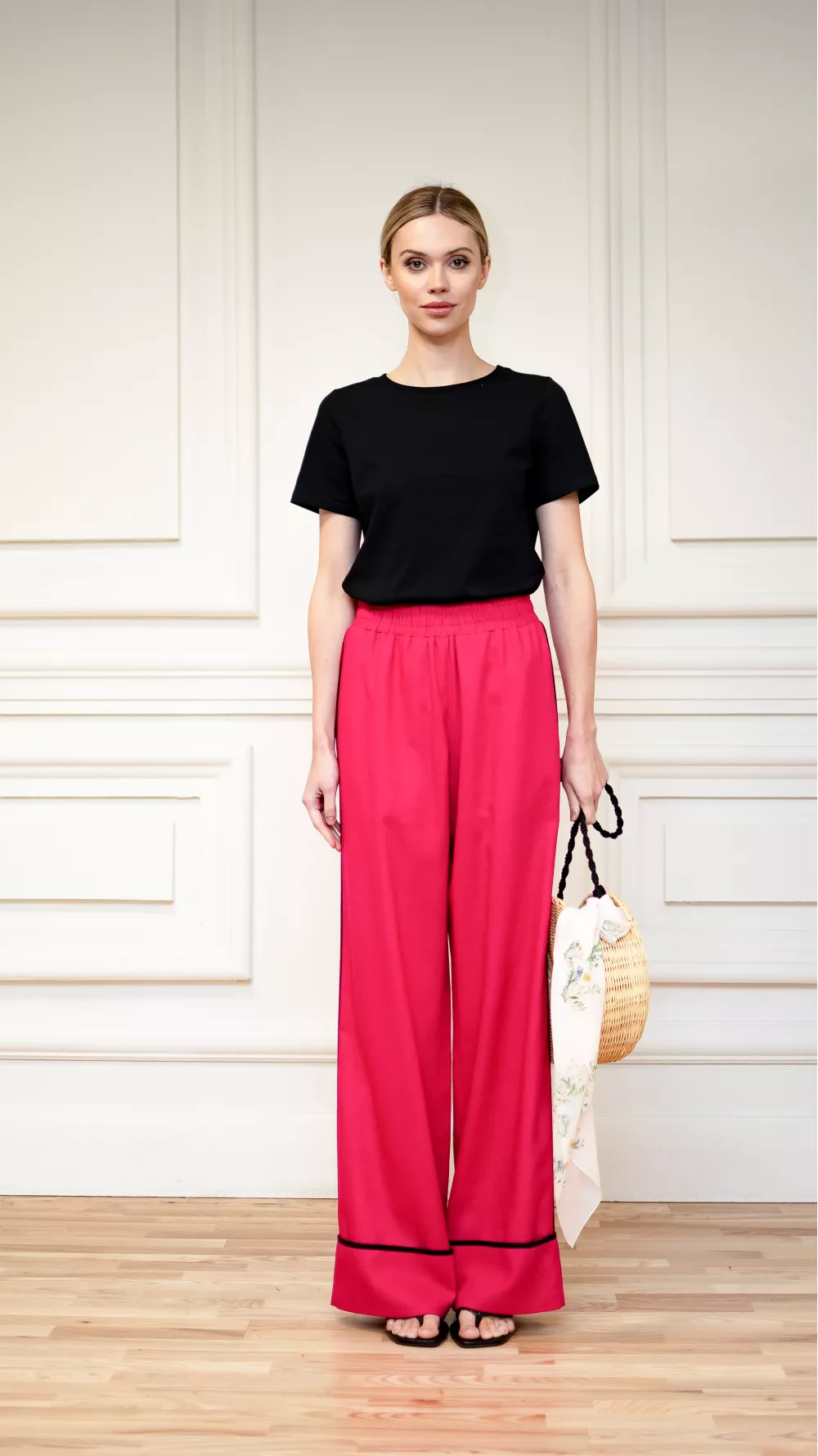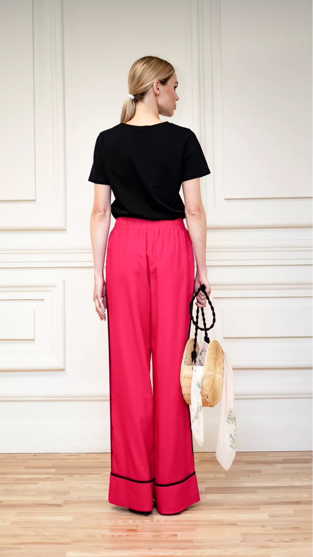 Wide elasticated trousers with side sewn pockets and a wide cuff, which is decorated with black edging. Perfect for sandals and low-cut summer shoes