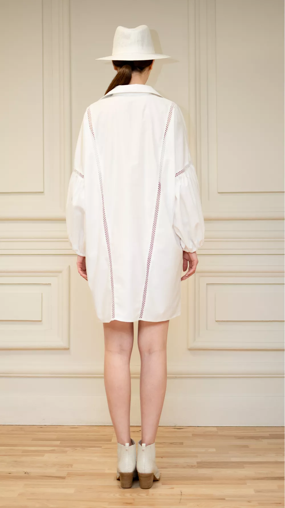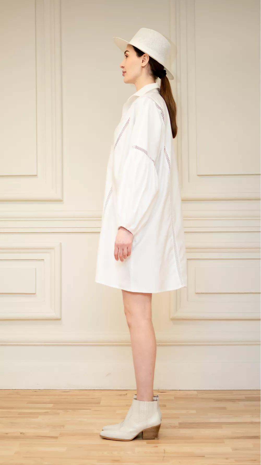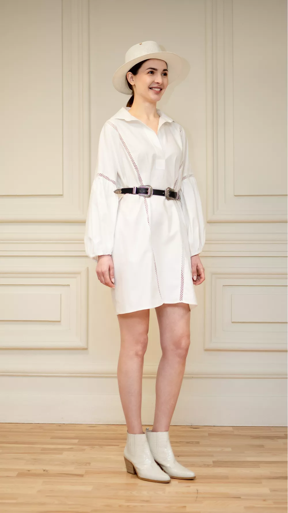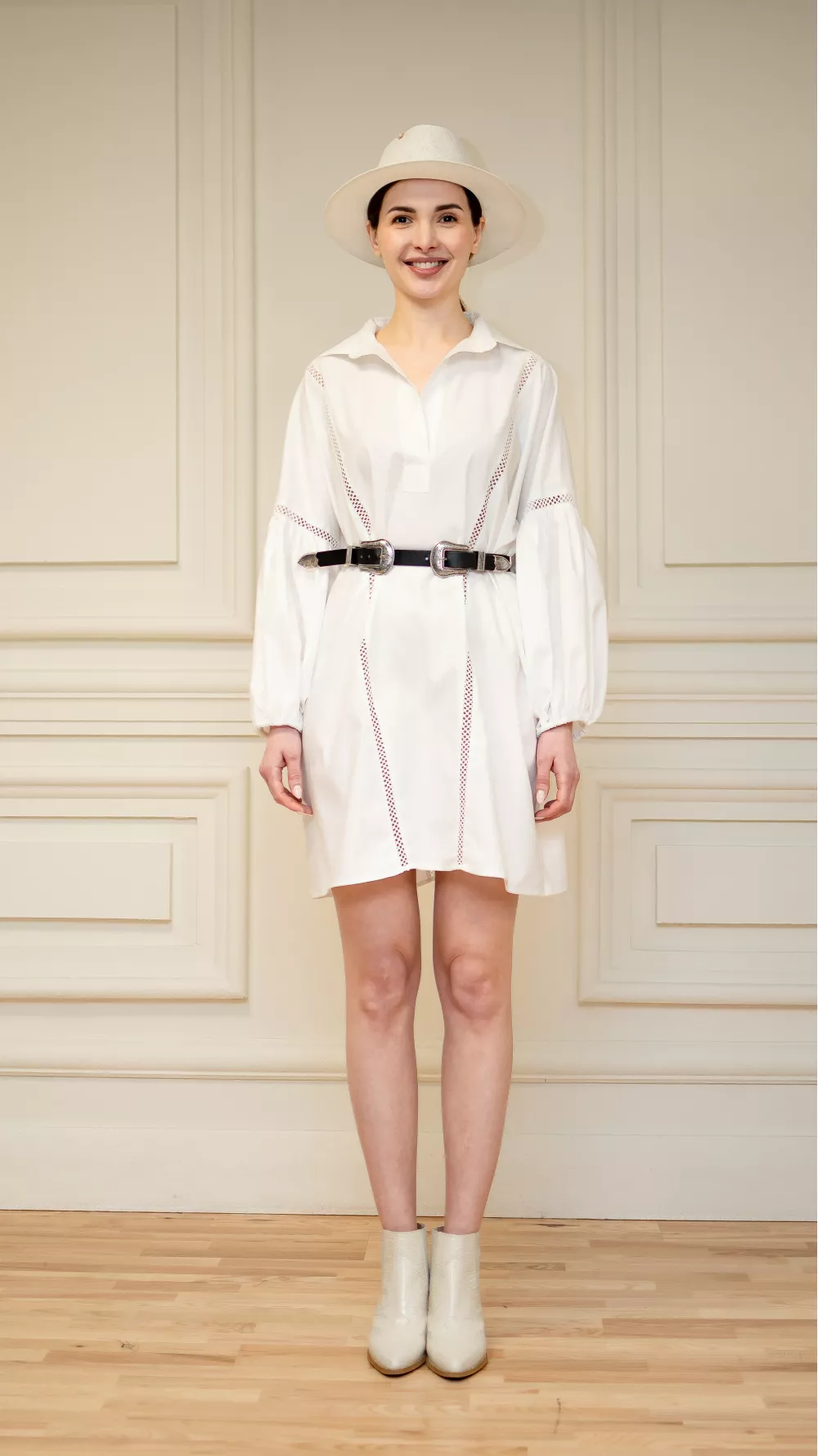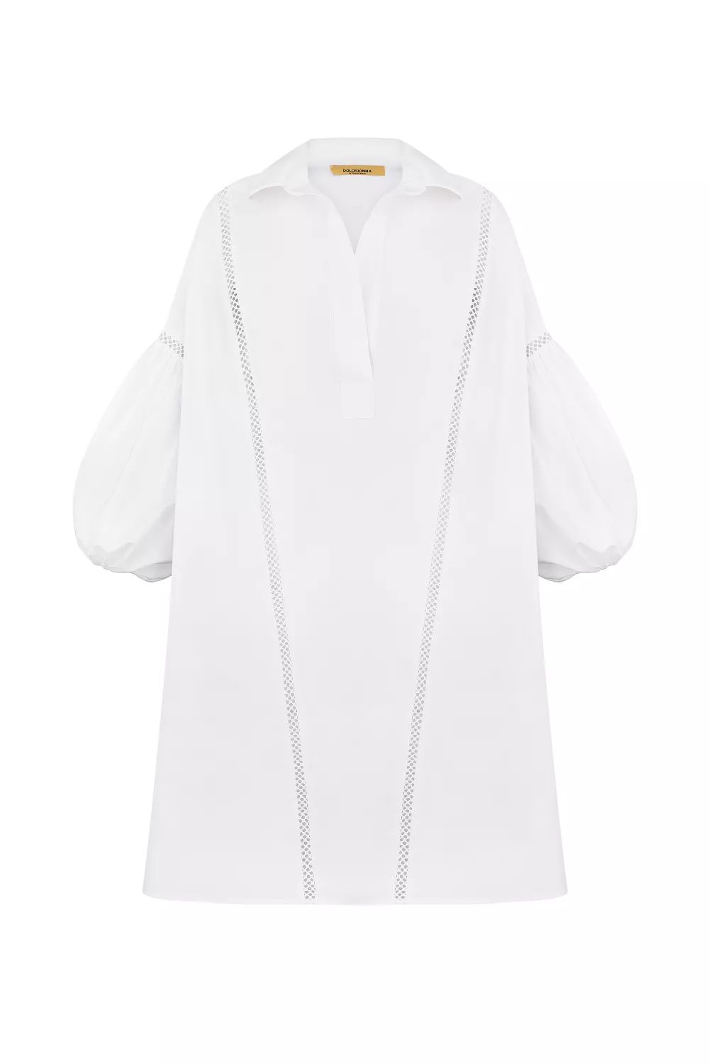 Short plain dress with puffy textured sleeves and embellished necklines. The model has a straight cut, but goes well with a belt. It can also be used as a tunic in your look or an elongated blouse
