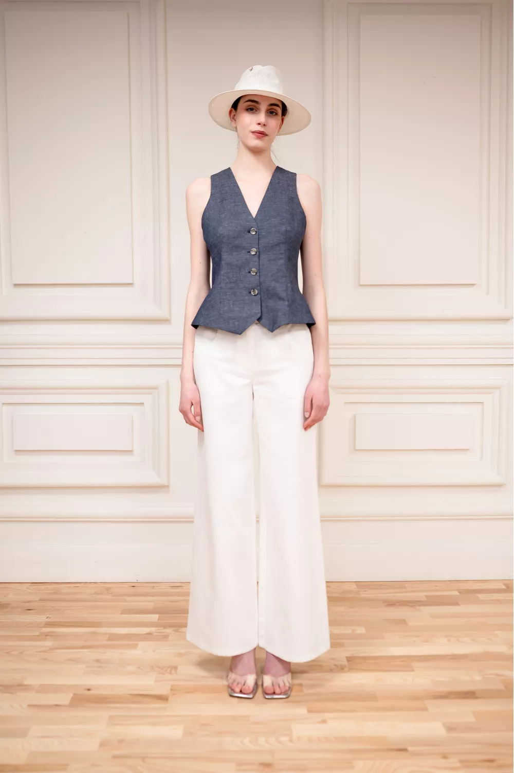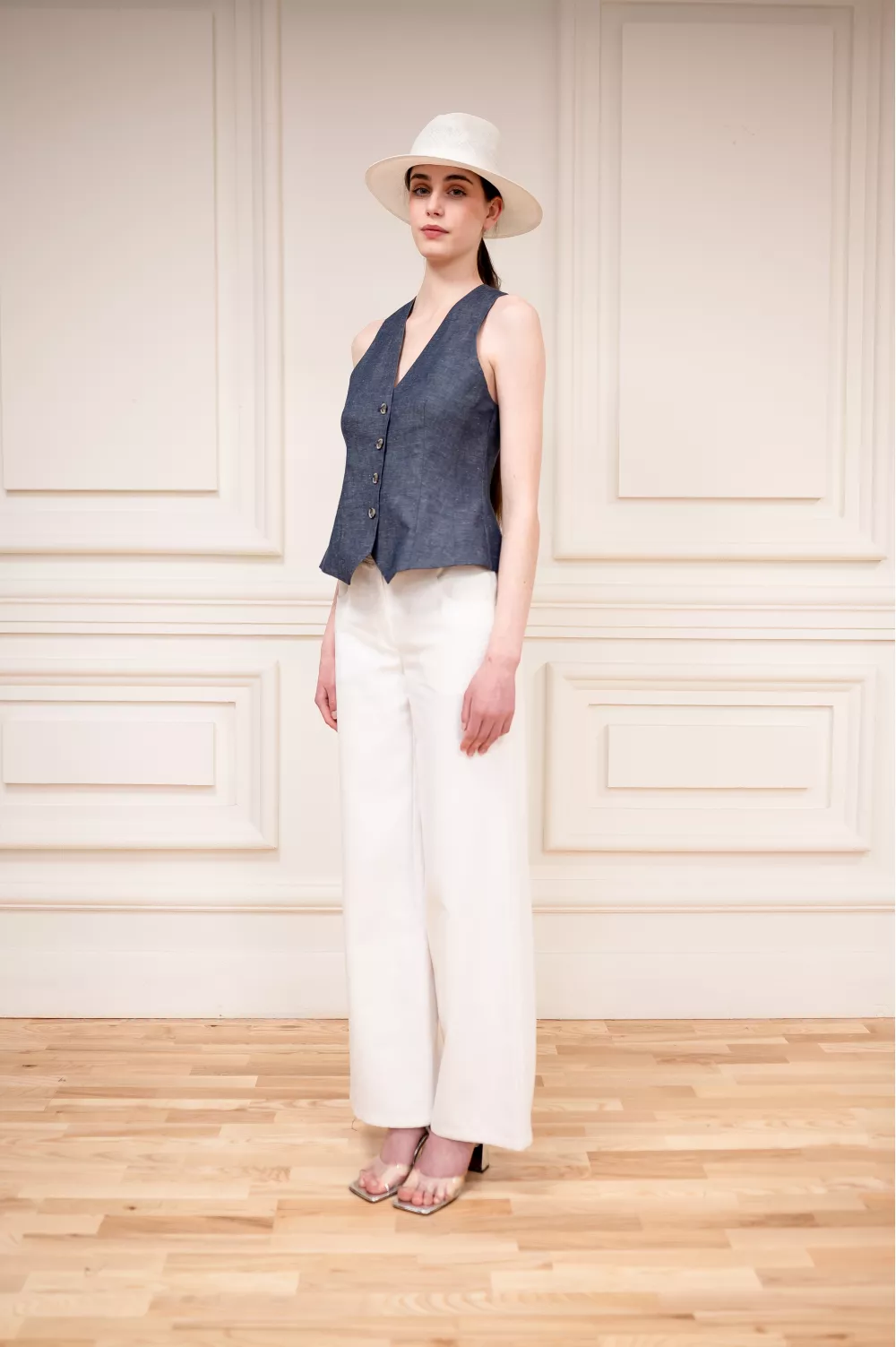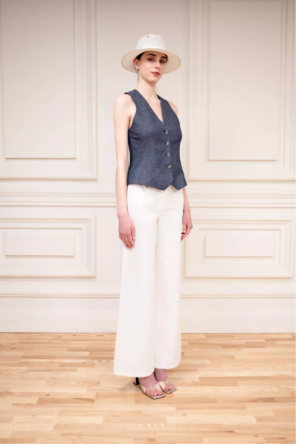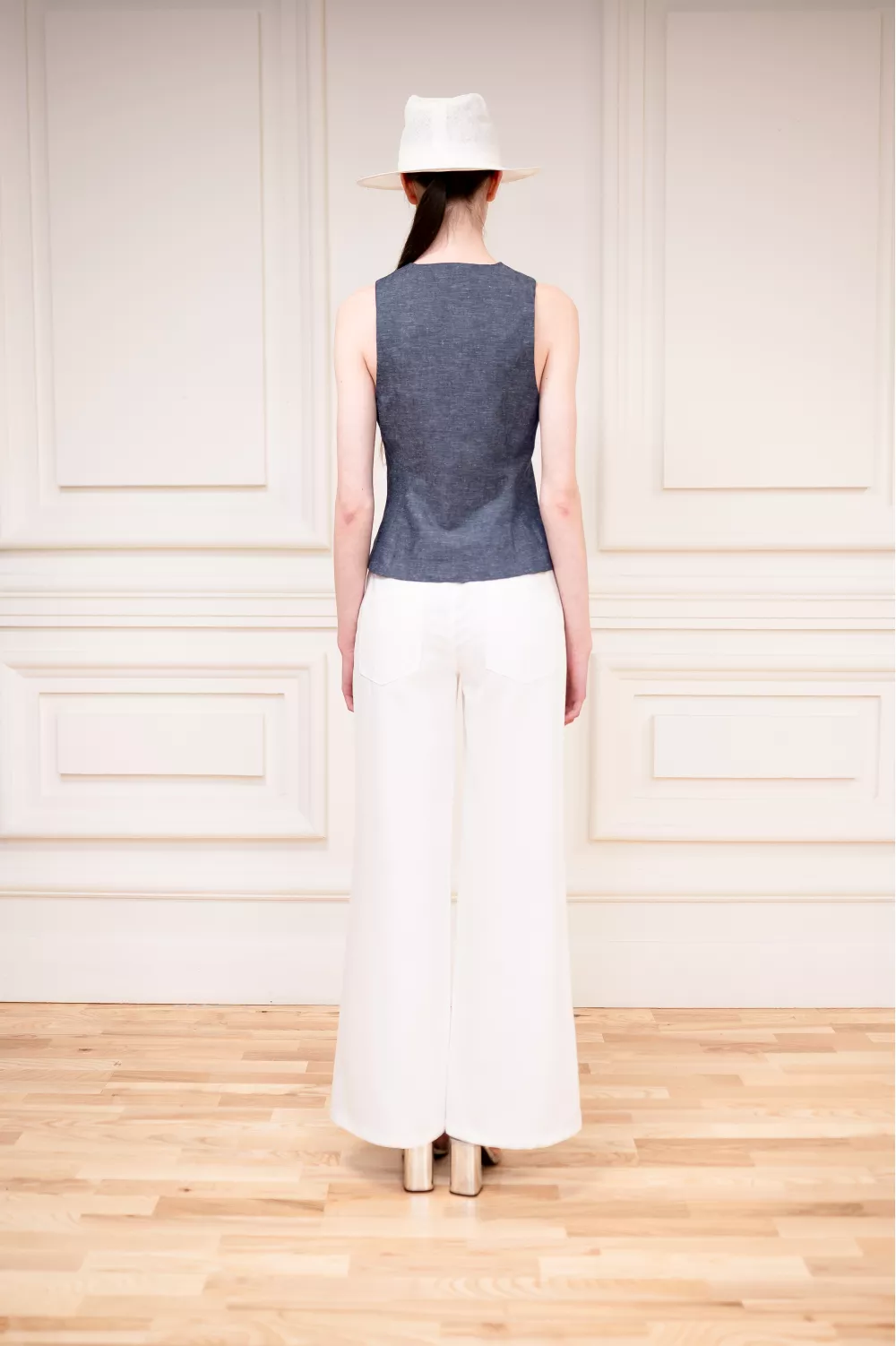 A basic cropped vest model that has been a must-have for many seasons in a row. Adjustable with a strap on the back for a more fitted version, it can be used as a standalone piece or paired with a T-shirt or shirt