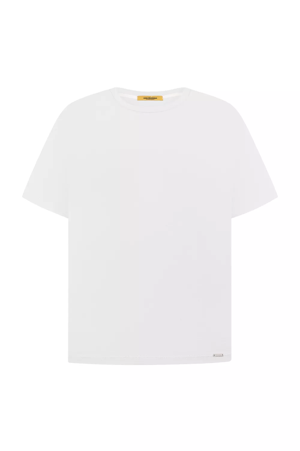 A basic T-shirt model that, thanks to its straight cut, complements a variety of looks