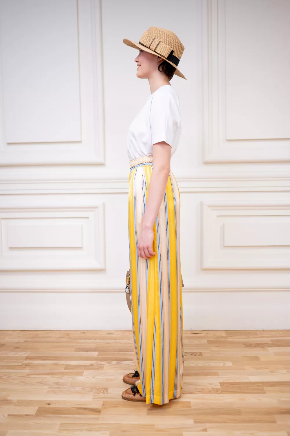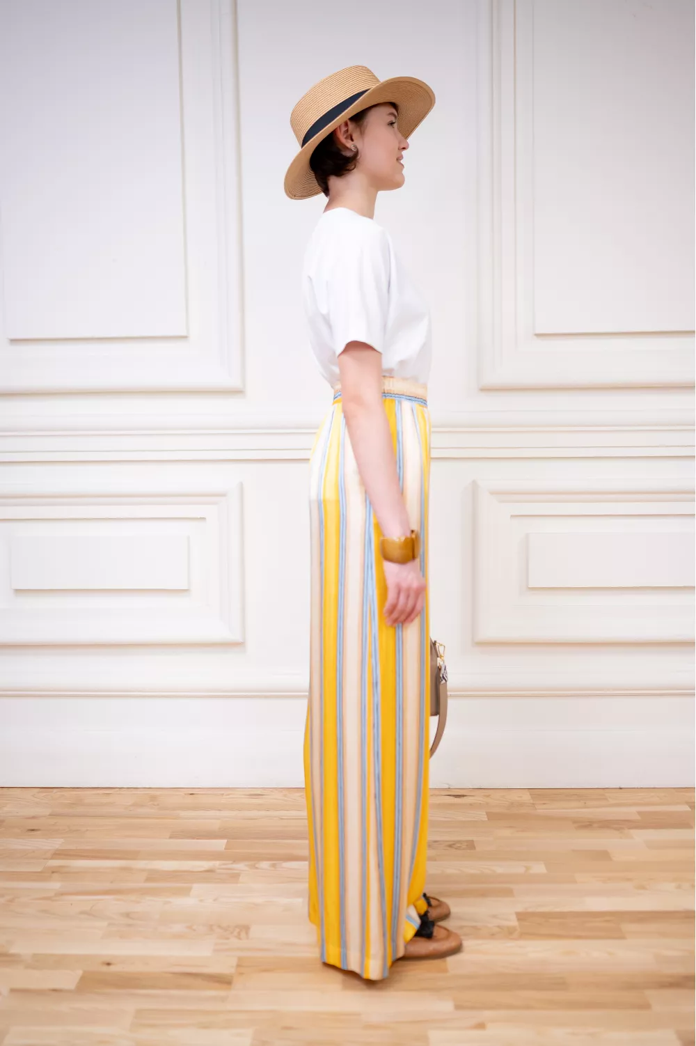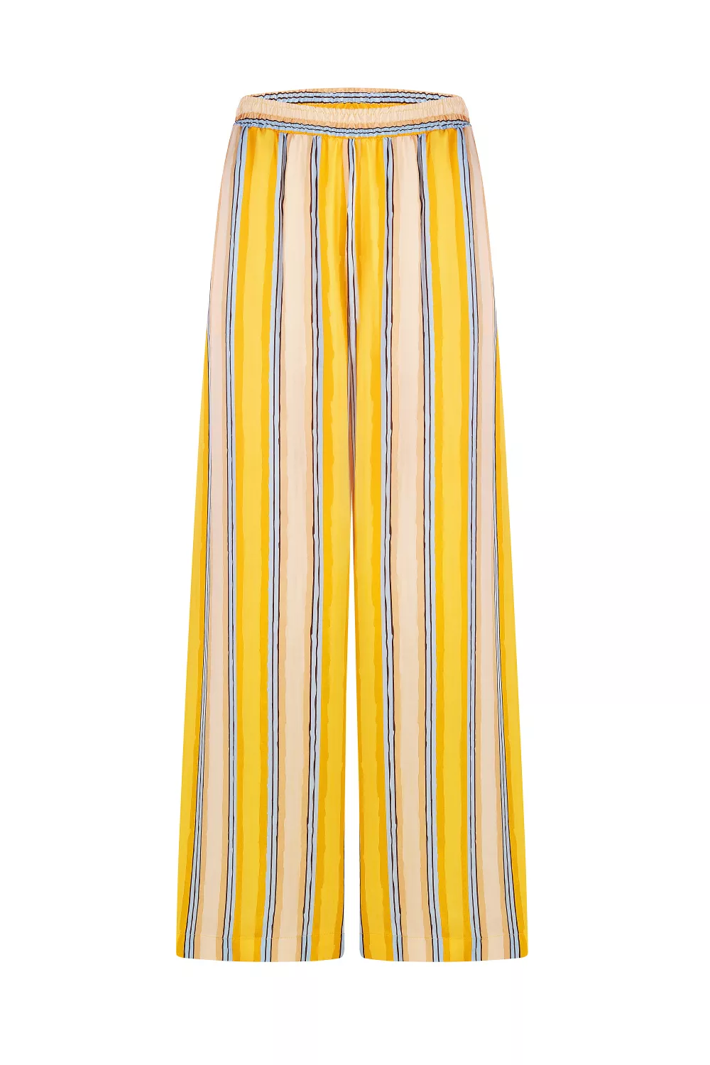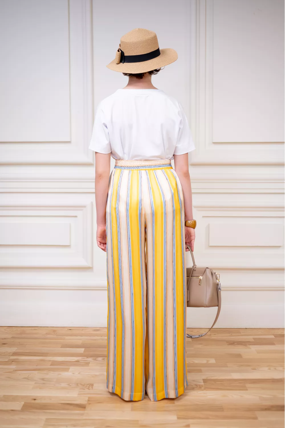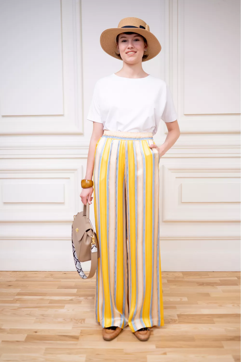 Incredibly light wide-leg trousers with elastic waistband, the fabric of which flows and creates a feeling of coolness. Perfectly paired with the similar shirt Kassandra