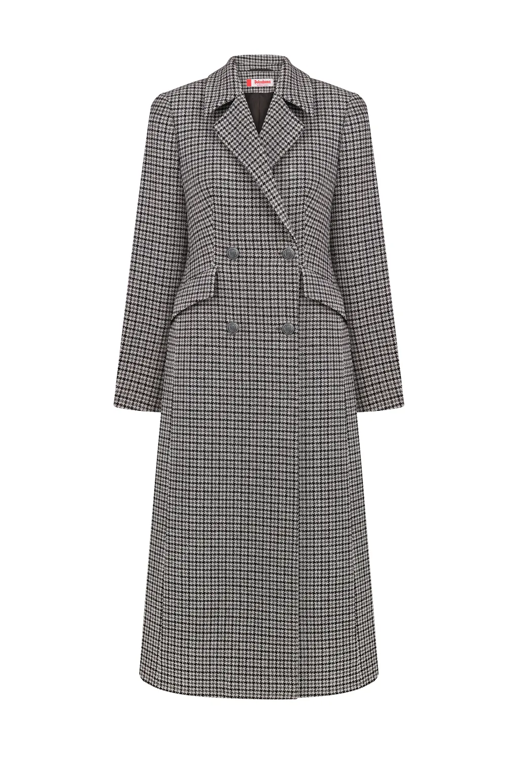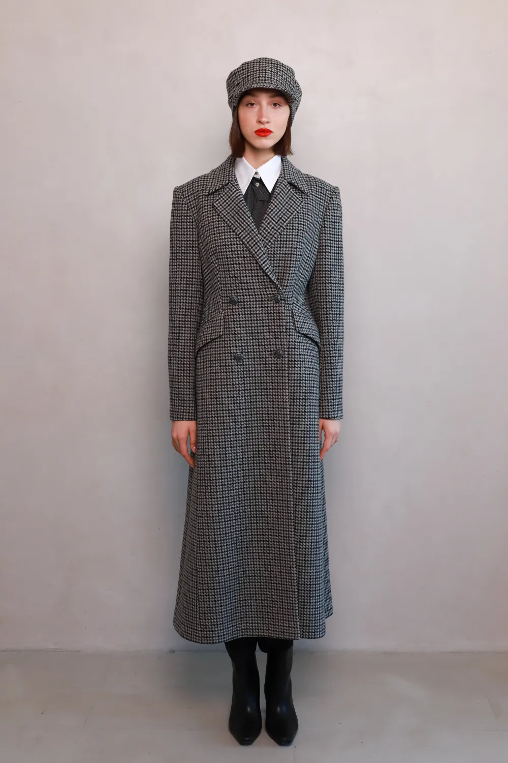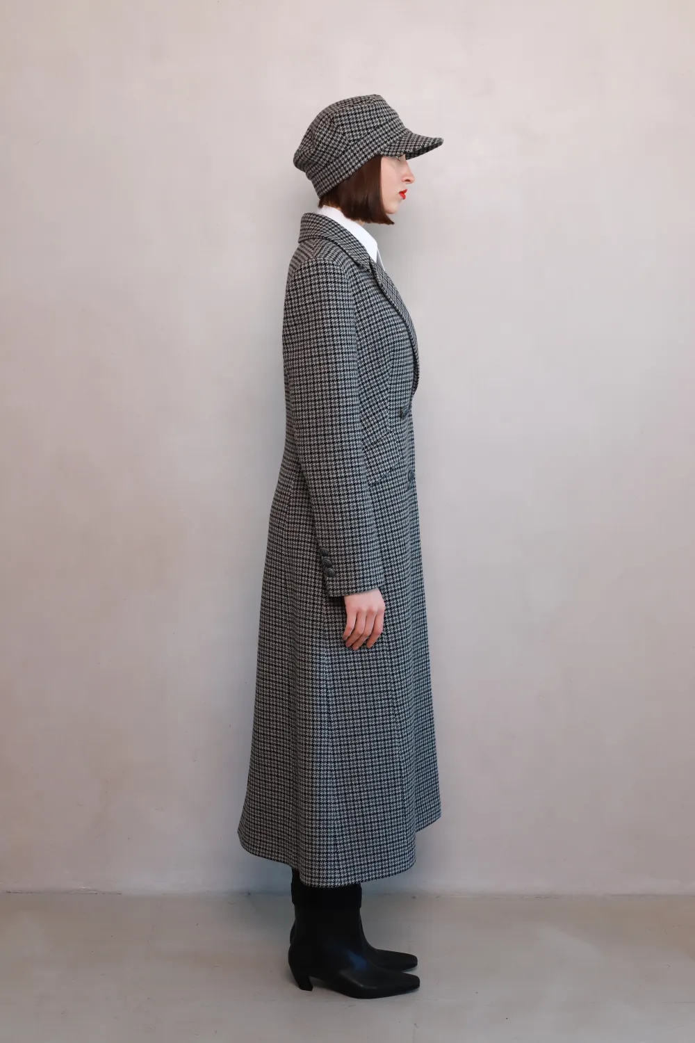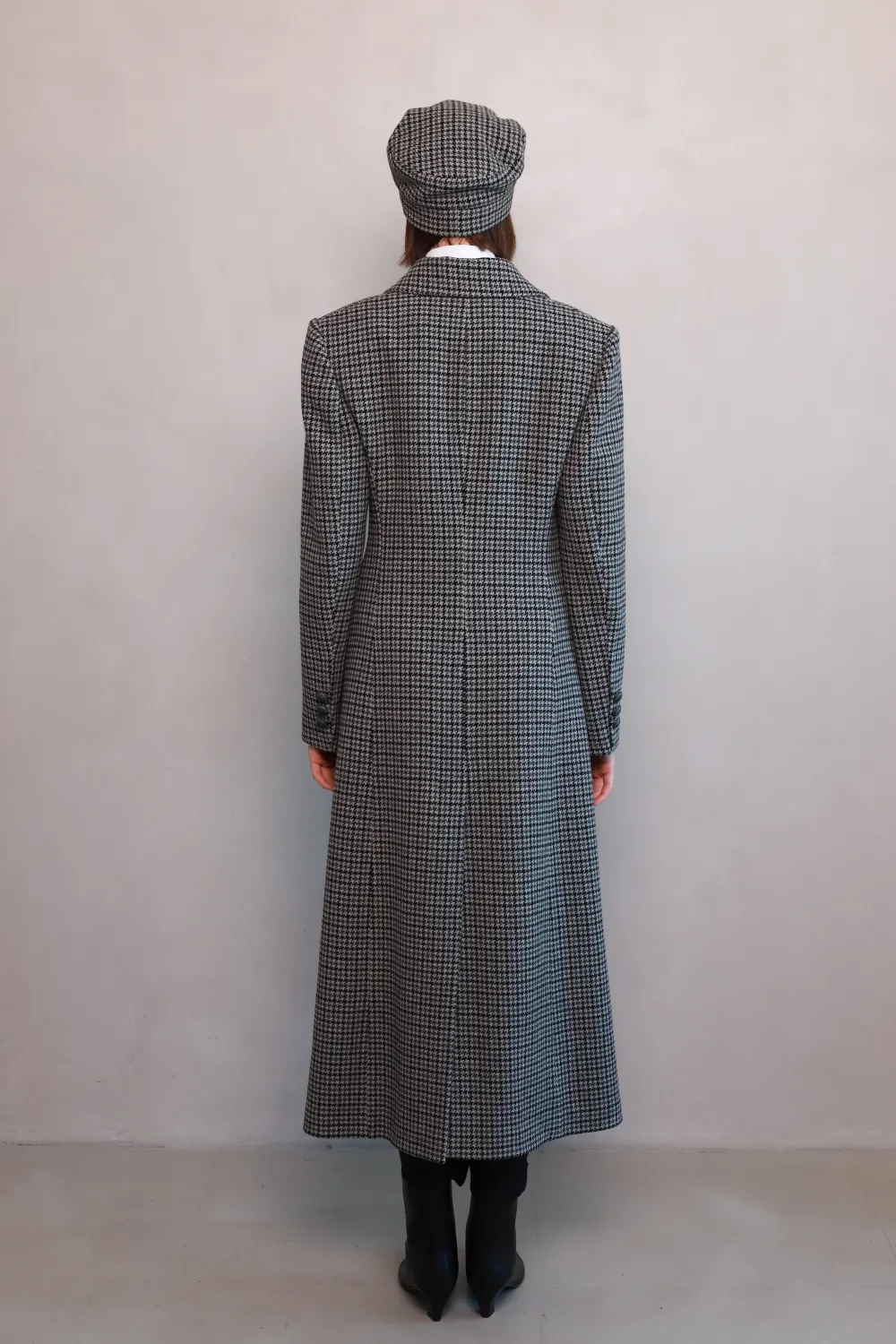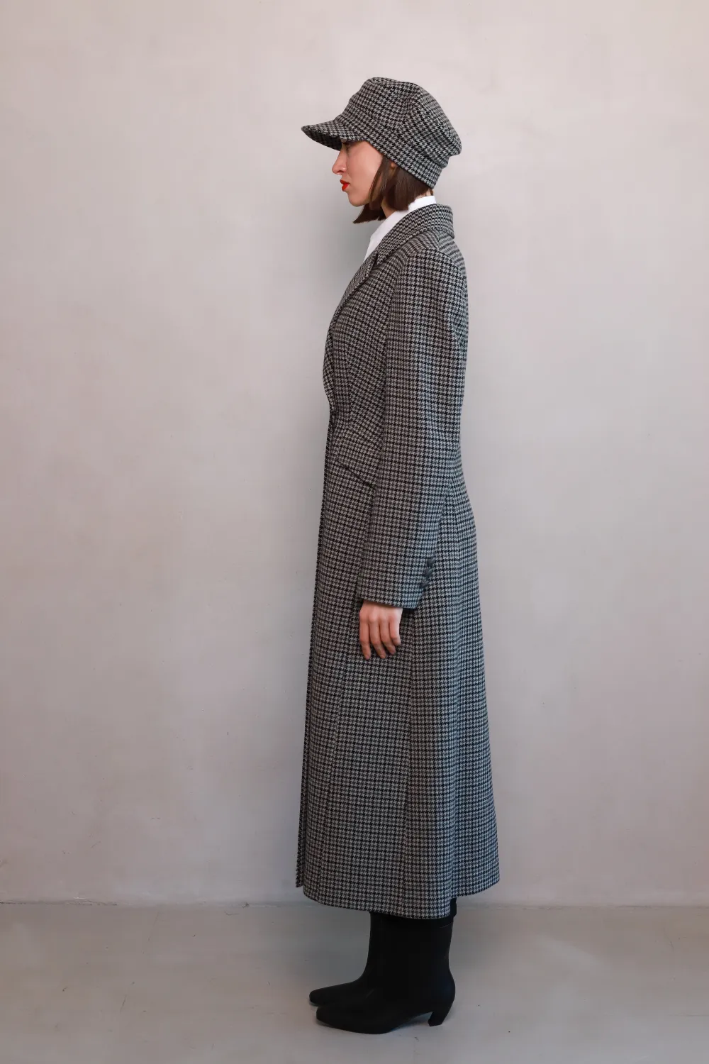 Discover the perfect border between tradition and modernity. Almeria - a long wool coat with a fitted silhouette with a classic black and gray check pattern, which is designed to emphasize your elegance this fall and winter.
